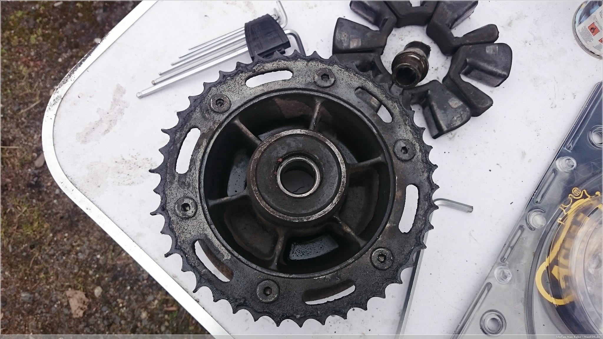 So verabredeten wir uns für die beiden Nachmittage mit meinem Bruder in der Garage. Los ging es bei mir mit dem Tausch des Kettenkits, zumindest war es der Plan. Nachdem die alte Kette runter und die Ritzel getauscht waren, stellte ich mit Entsetzen fest, dass die neue Kette offen ist und ein Nietschloss beilag. Da wir sonst immer nur geschlossene Ketten verbauen, besitzen wir keine Kettennietwerkzeuge.