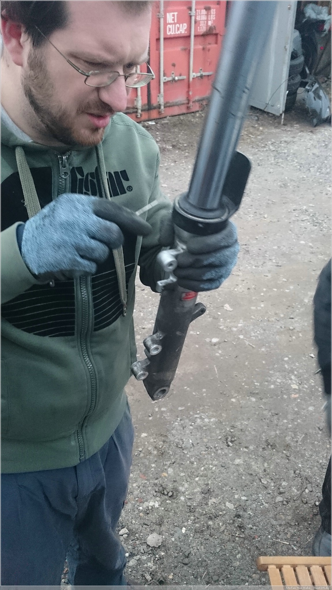 Jetzt konnte die Gabel raus und zerlegt werden, also zumindest ein Teil gleich, der andere nachdem nochmal eine lange Inbussnuss besorgt wurde.