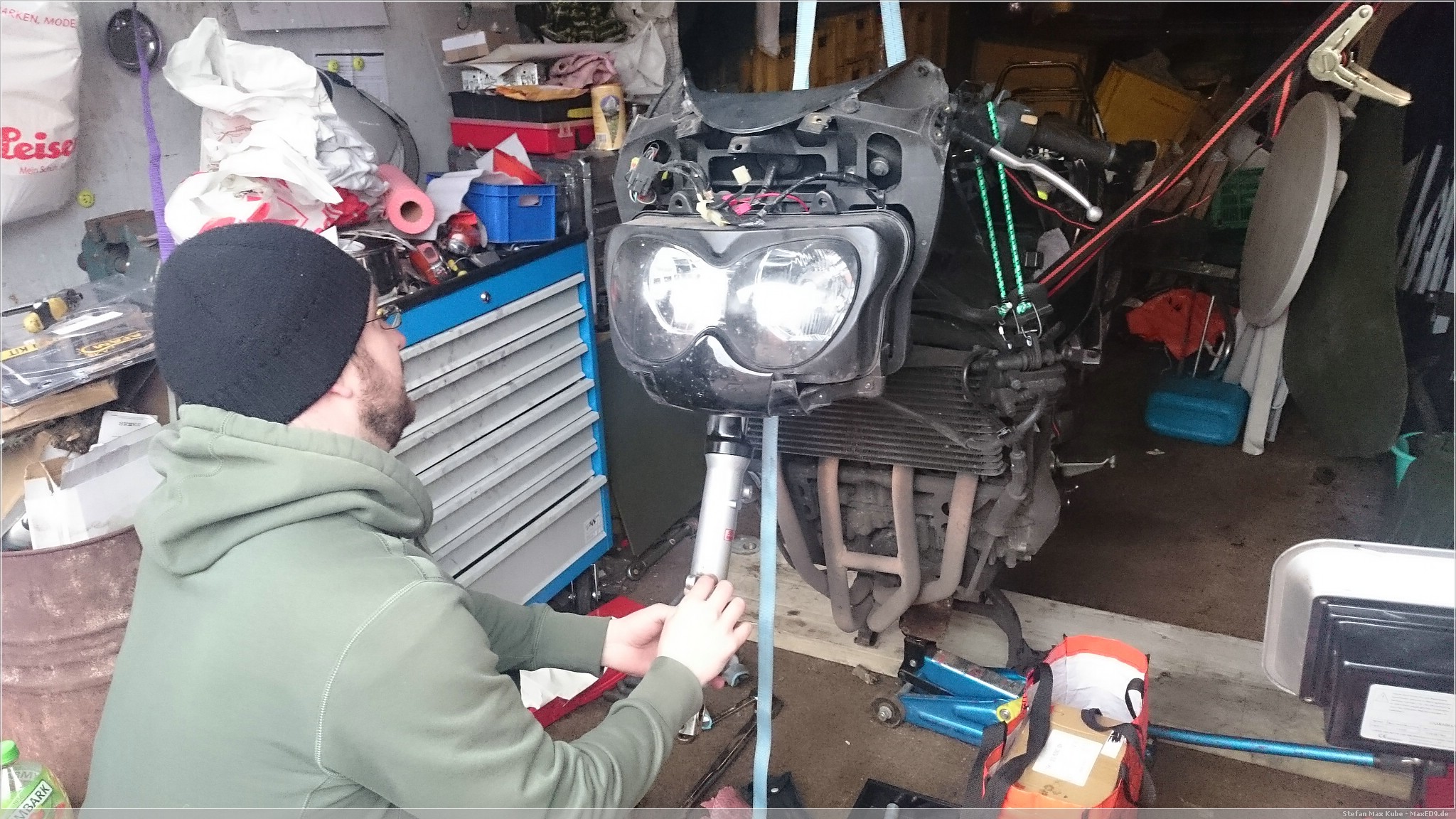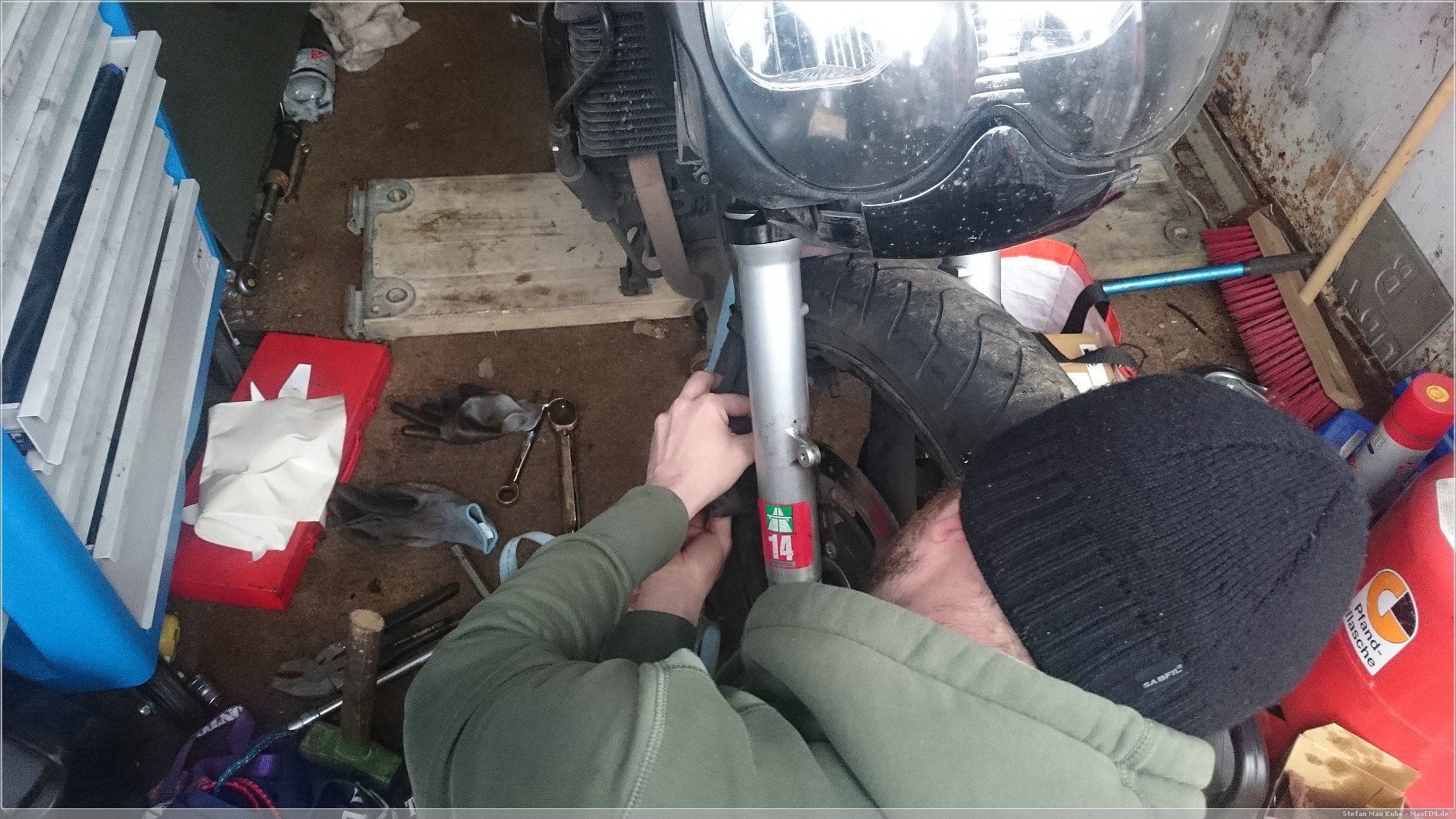 Der heutige Sonntag startete mit dem Befüllen der Gabel mit dem Öl. Dank unseres Gabel-Ölstand-Abgleicher[2] war das Einstellen des Luftpolsters kein Problem und die Gabel konnte dann auch gleich wieder an den vorgesehenen Platz montiert werden.
