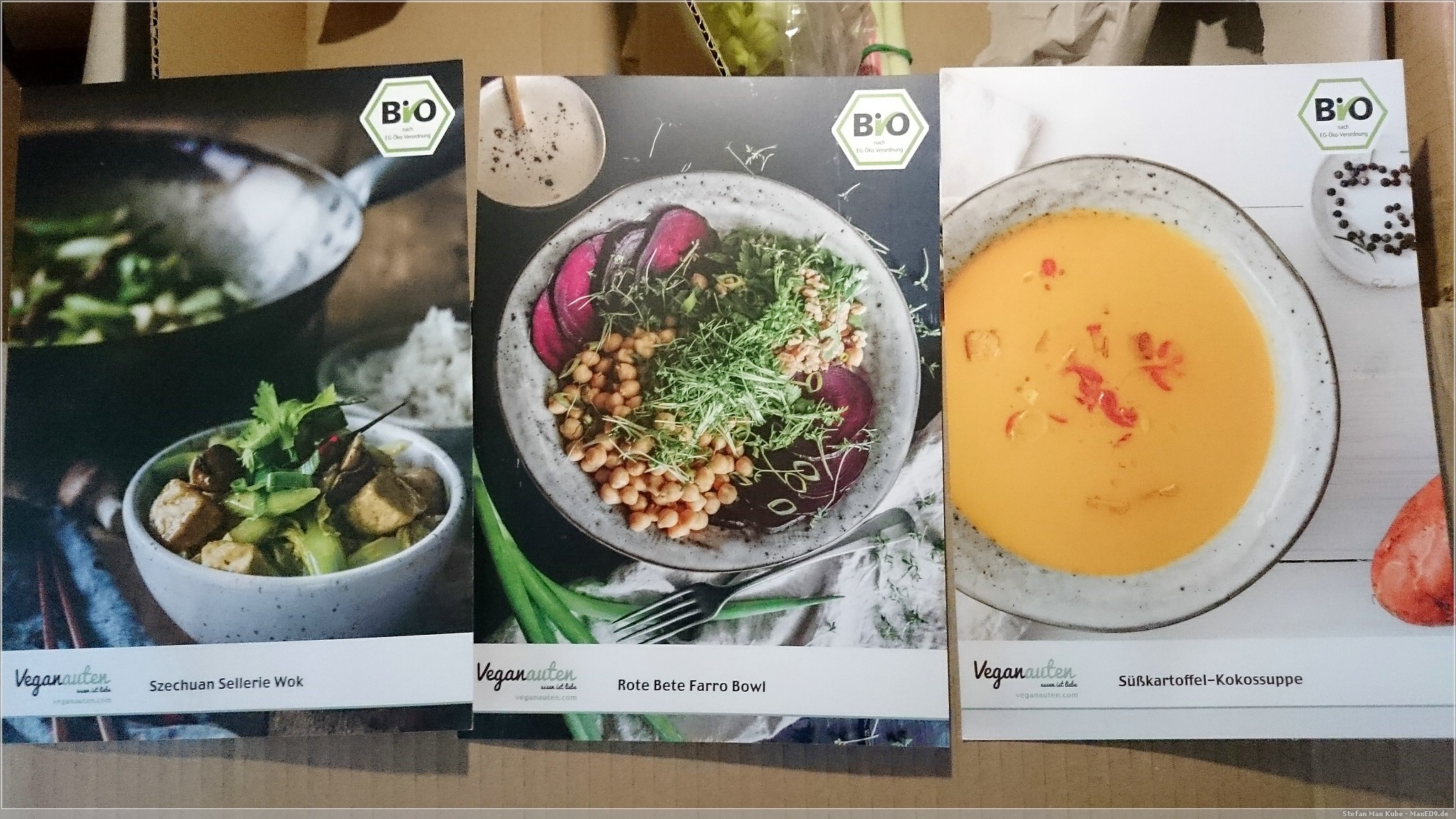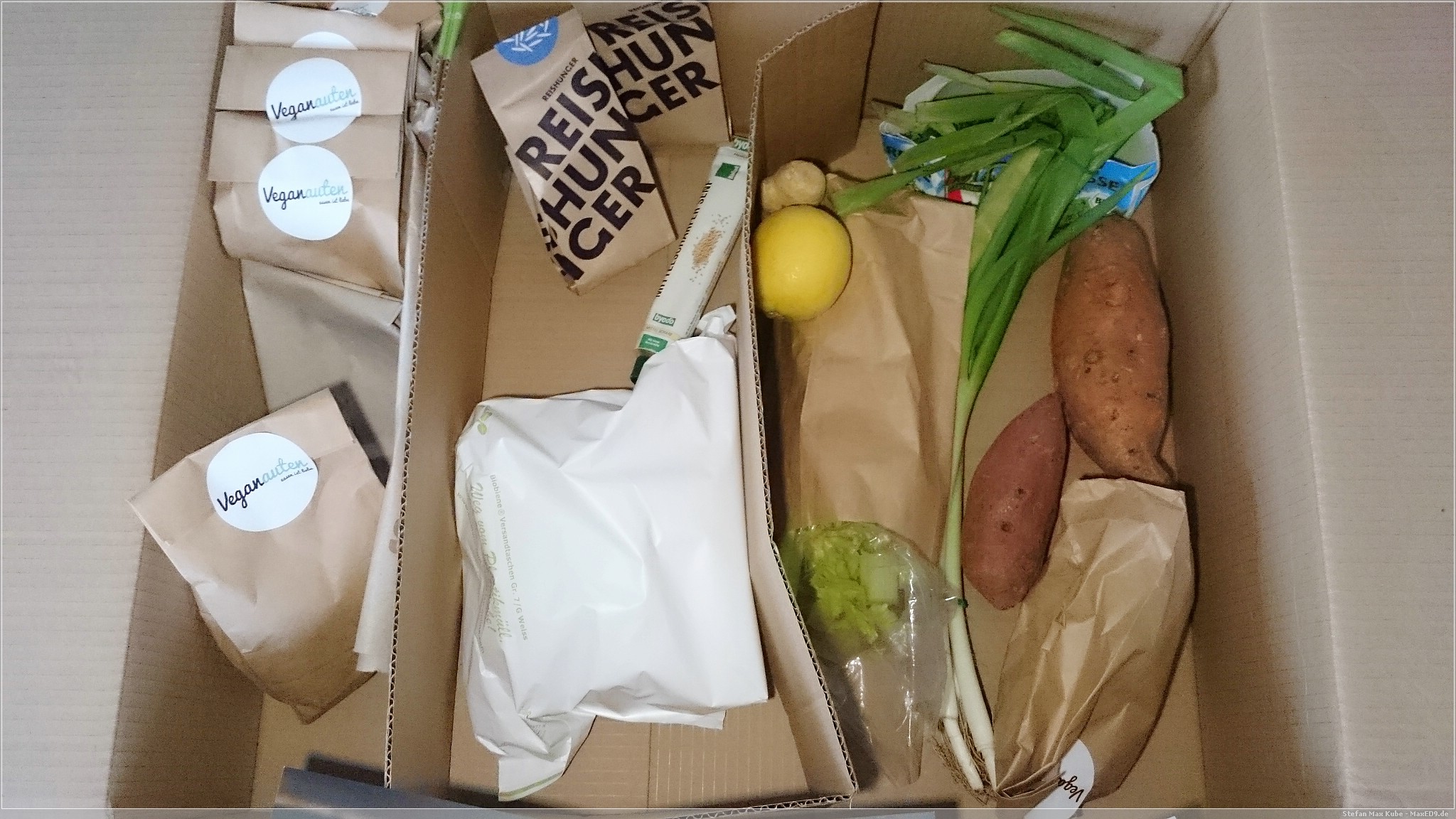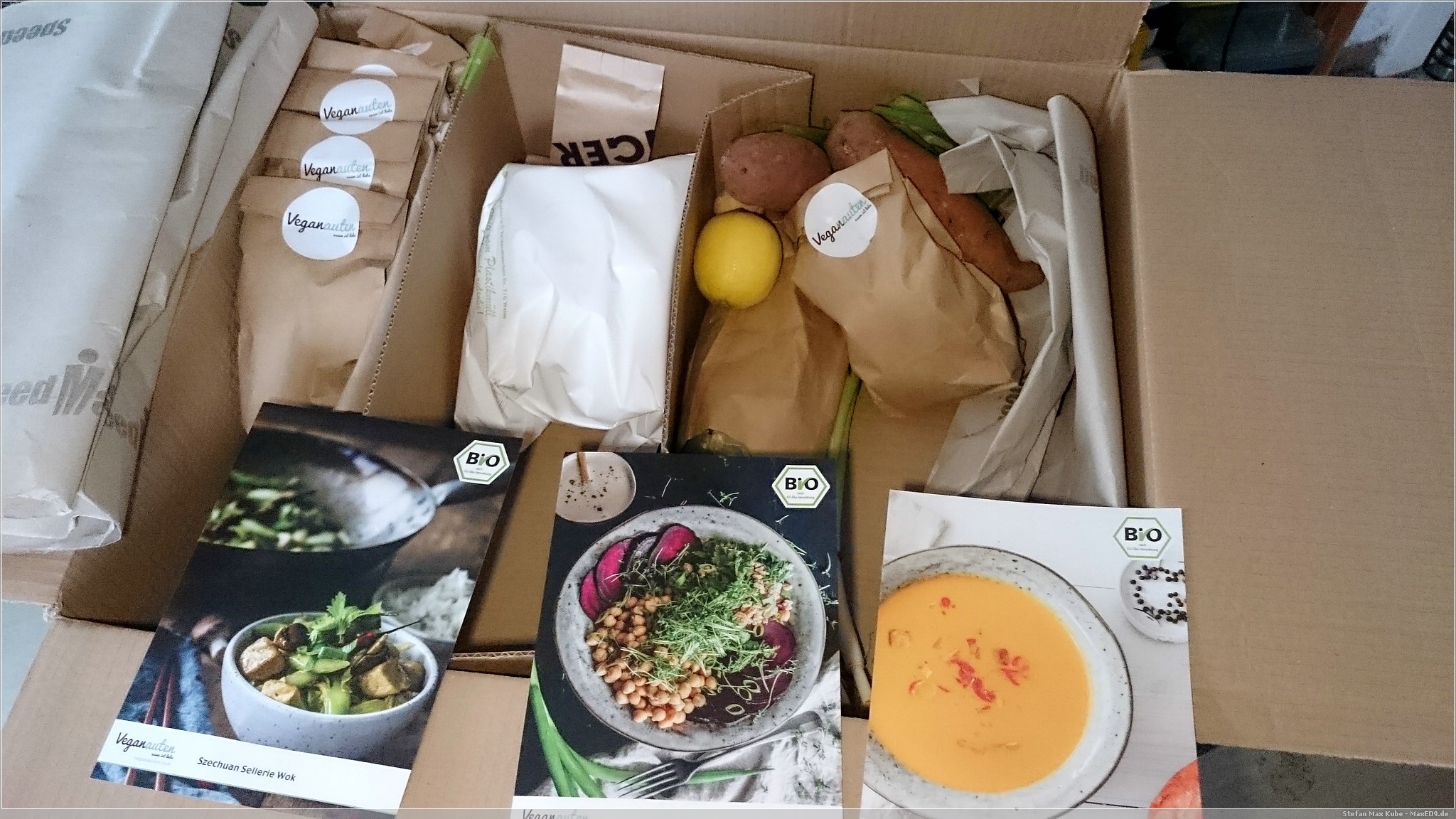 Vor kurzem starteten die Veganauten[1], neben ihrem veganen Onlineshop, auch mit einem Kochbox-Aboprogramm, auf das wir zufällig aufmerksam wurden. Nach kurzem Überlegen wollten wir das einmal probieren und bestellten die Probebox zum nächstmöglichen Freitag. So wäre für Freitag, Samstag und Sonntag das Abendessen gesichert.