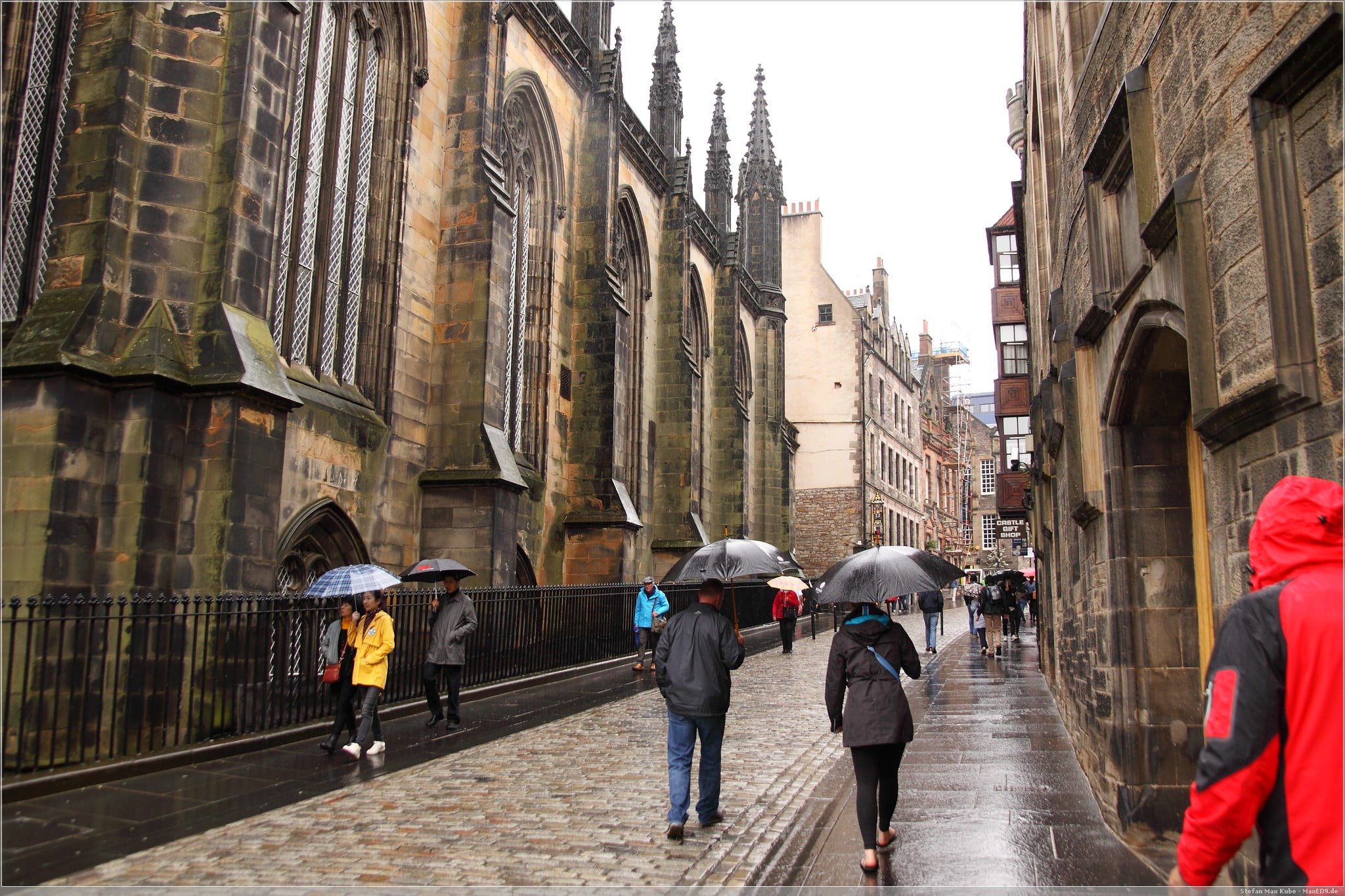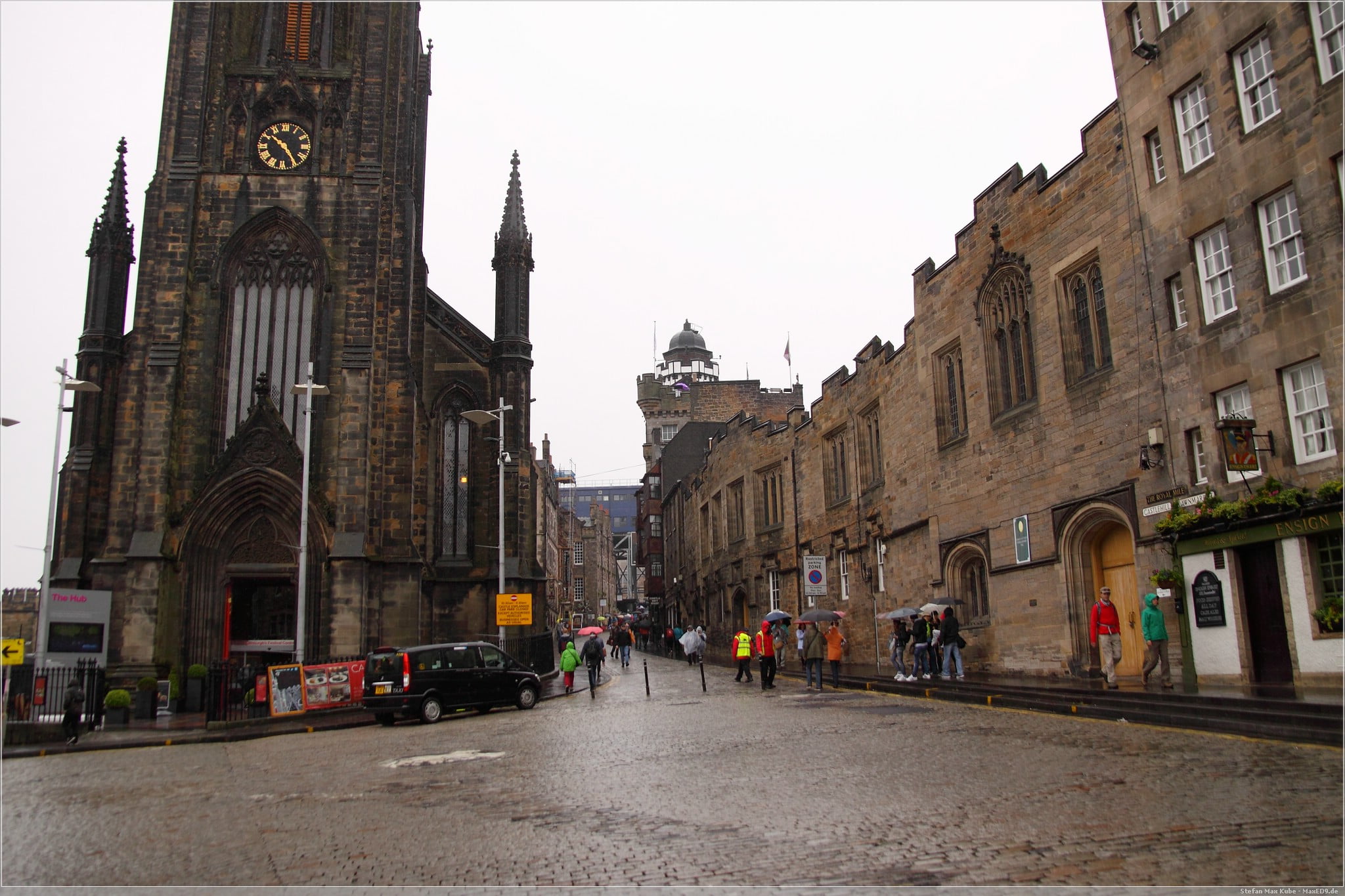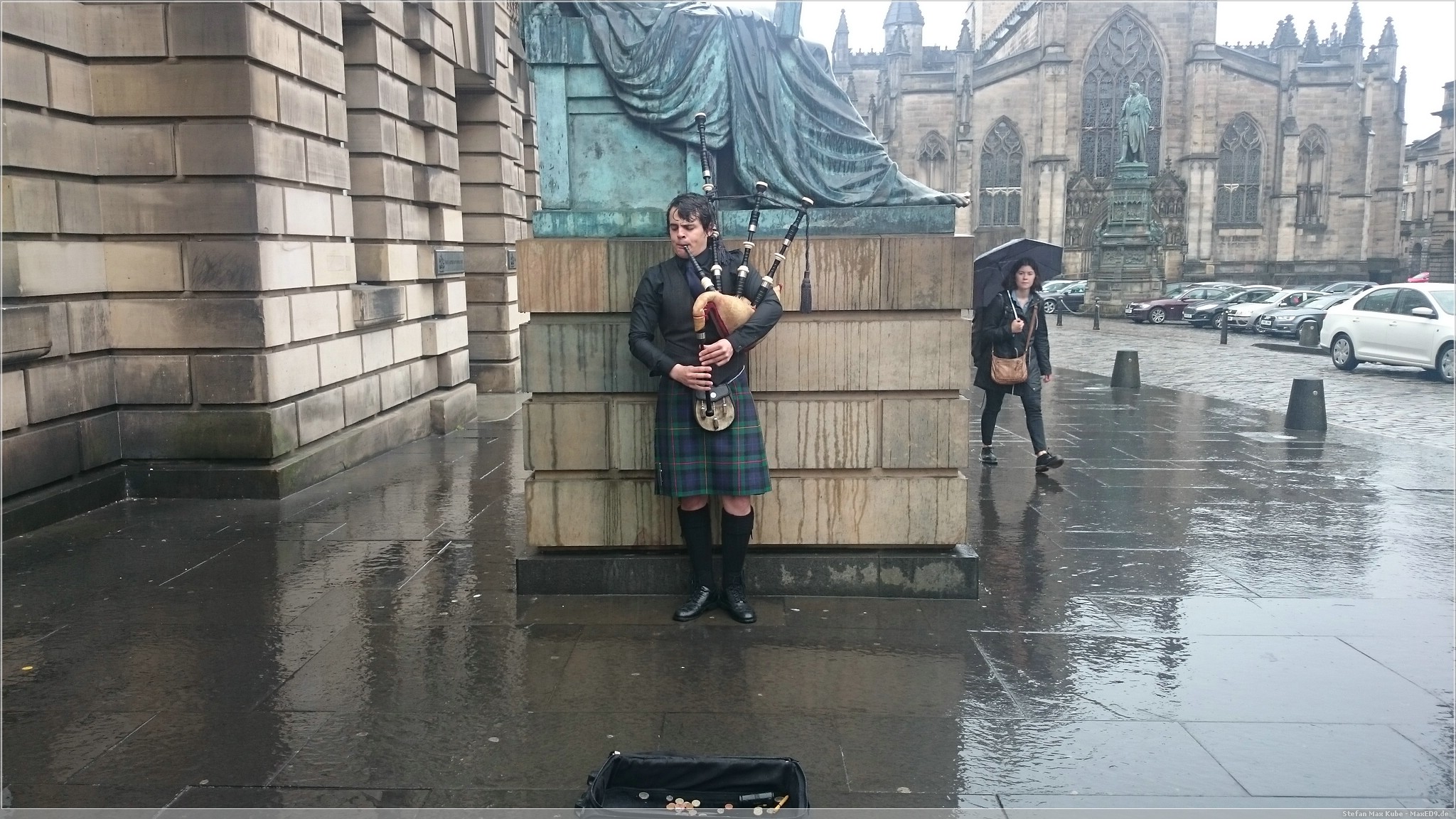 Aber bevor es zur Burg gehen sollte, wollten wir noch ein paar andere Dinge sehen und so ließen wir uns vom Regen nicht aufhalten und liefen unter anderem die Royal Mile entlang. In der Nähe der St. Giles‘ Cathedral trafen wir auch gleich auf eine typischen ‚Touristenattraktion‘, einen traditionellen Bagpiper.
