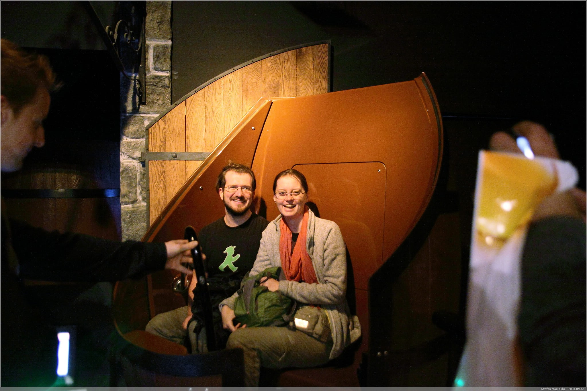 Nachdem wir ihm eine Weile gelauscht hatten und auch seine Leistung entlohnten, begaben wir uns Richtung Burg und bogen kurz vorher in das Scotch Whisky Experience[1] ab. Hier konnte man nicht nur Whisky kaufen, sondern auch eine aufregende Fahrt in einem großen Fass durch die Whisky Produktion machen. Das ließen wir uns nicht entgehen und für die die wollten, gab es auch noch den einen oder anderen Tropfen zu kosten.