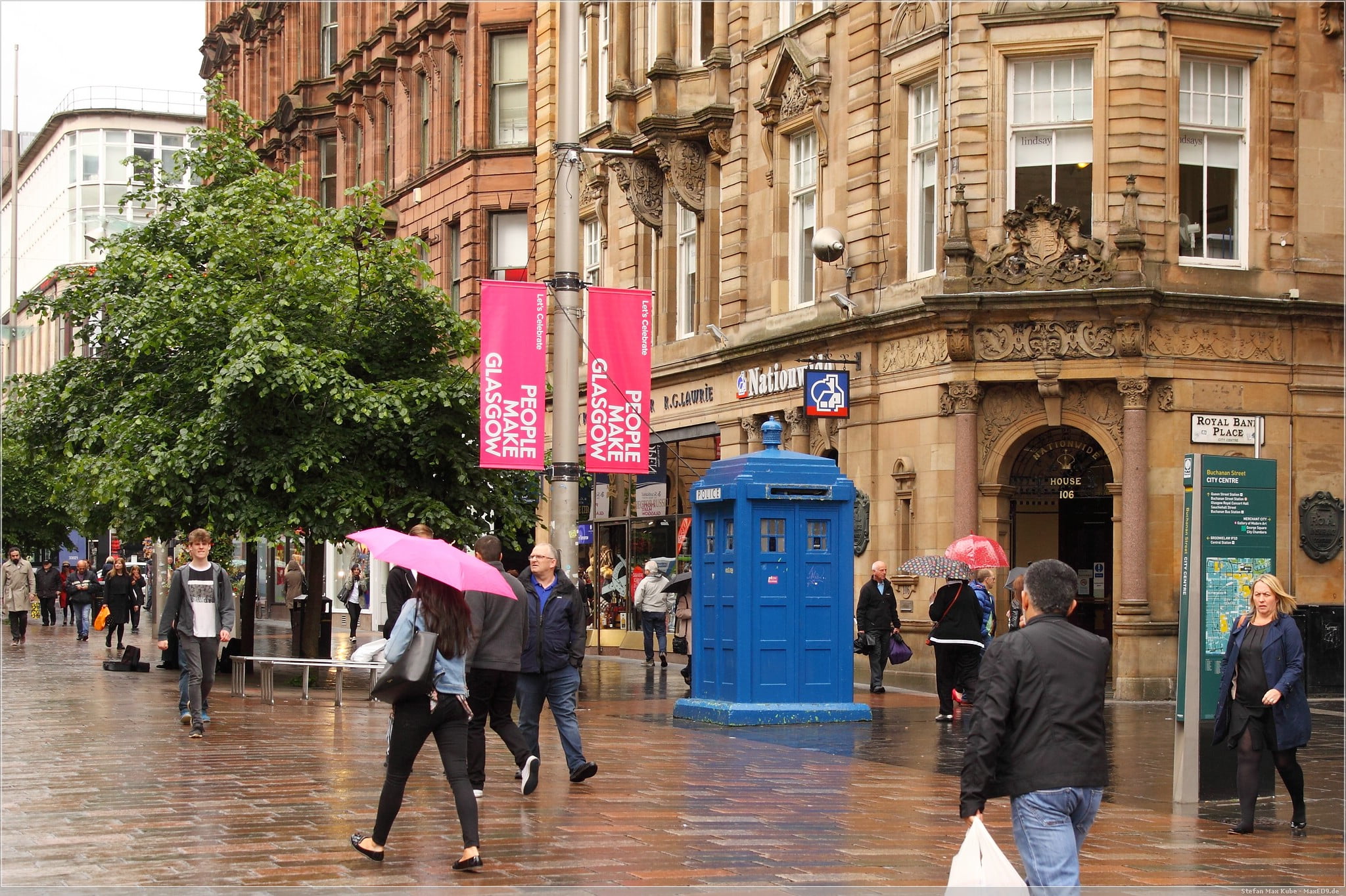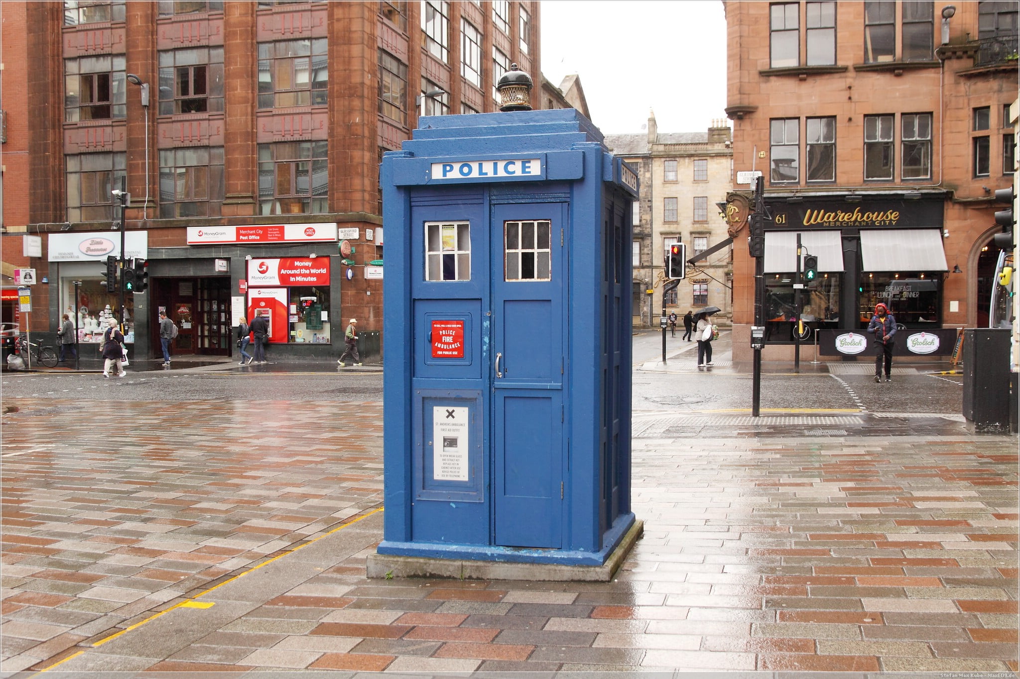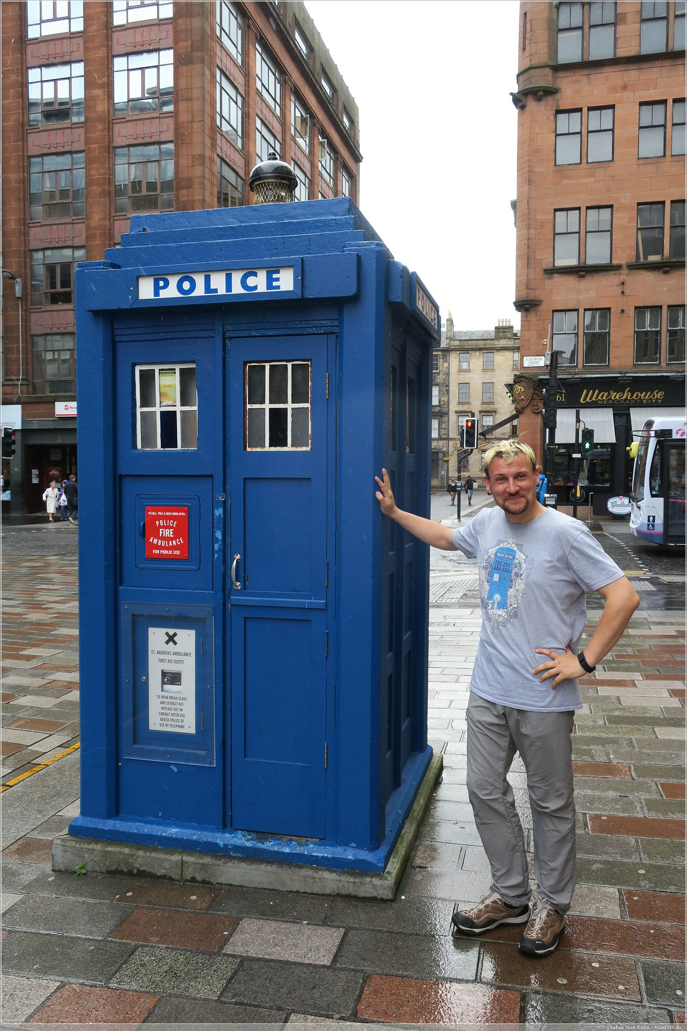 Schon auf dem ersten Hinweg nach Glasgow ist uns eine der vielen blauen Police-Boxen aufgefallen und als Whovian musste ich da natürlich hin und Fotos machen, das passende Shirt hatte ich ja rein zufällig auch an.
