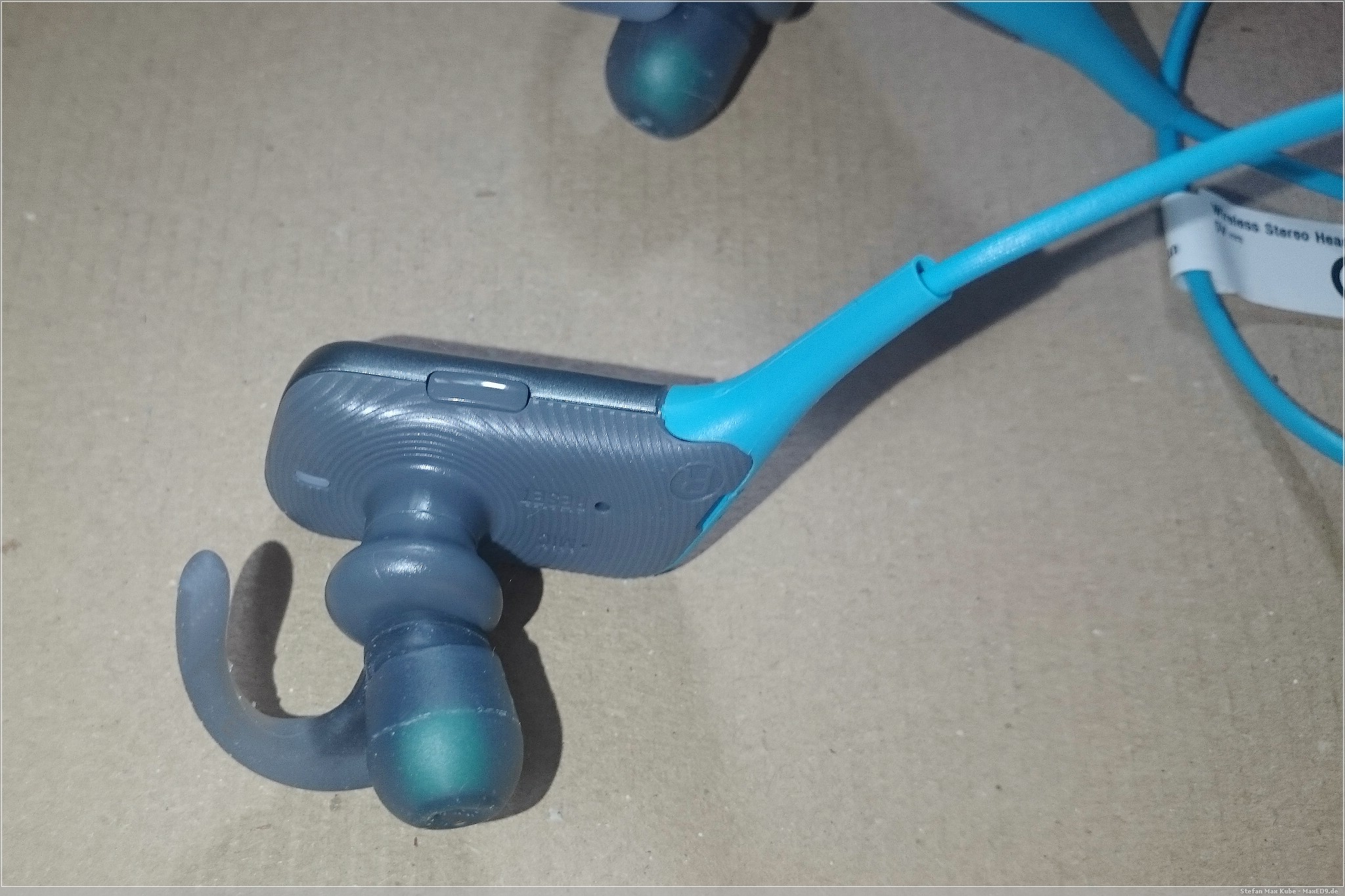 Die Ladebuchse verbirgt sich hinter einen kleinen Klappe, auch damit wird der Kopfhörer vor Spritzwasser bzw eher Schweiß geschützt.