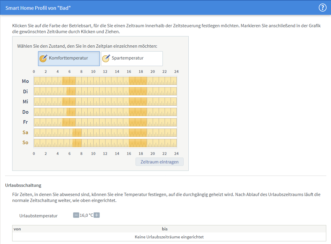 Ebenso kann man die Werte für Komfort- und Spartemperatur, also auch für die Urlaubszeit setzen. Für letztere lässt sich ebenfalls ein Zeitraum angeben, so dass in Abwesenheit nicht unnötig geheizt wird.