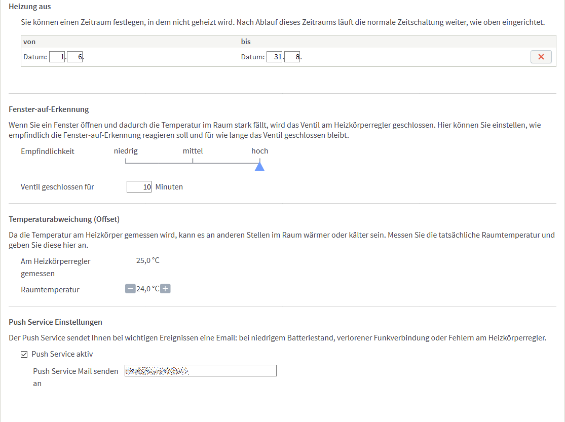 Da die Temperatur nur am Thermostat gemessen wird und diese durchaus im Raum abweicht, besteht ebenfalls die Möglichkeit diese Abweichung anzugeben. So misst man einfach die Temperatur im Raum an der gewünschten Stelle und trägt diese ein.