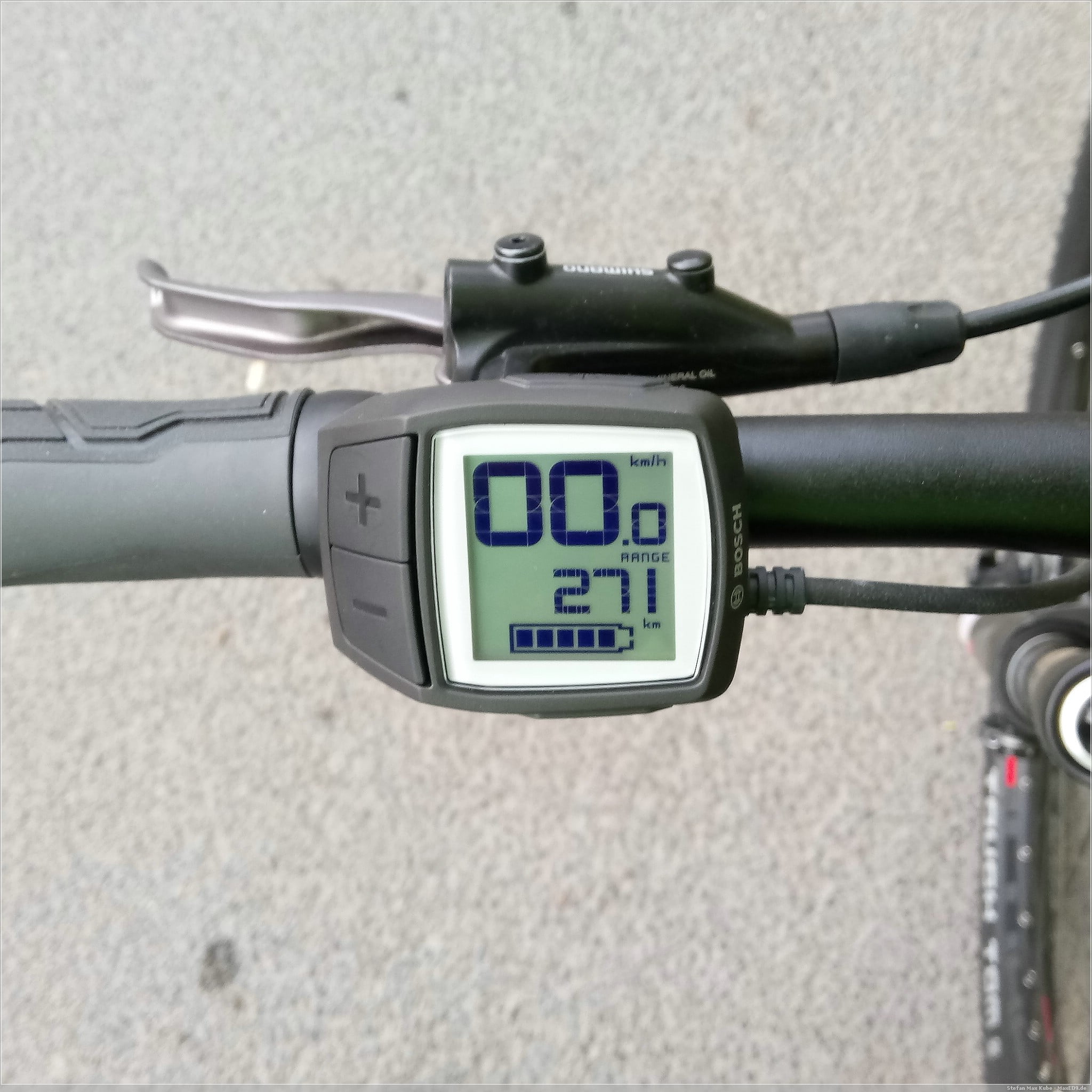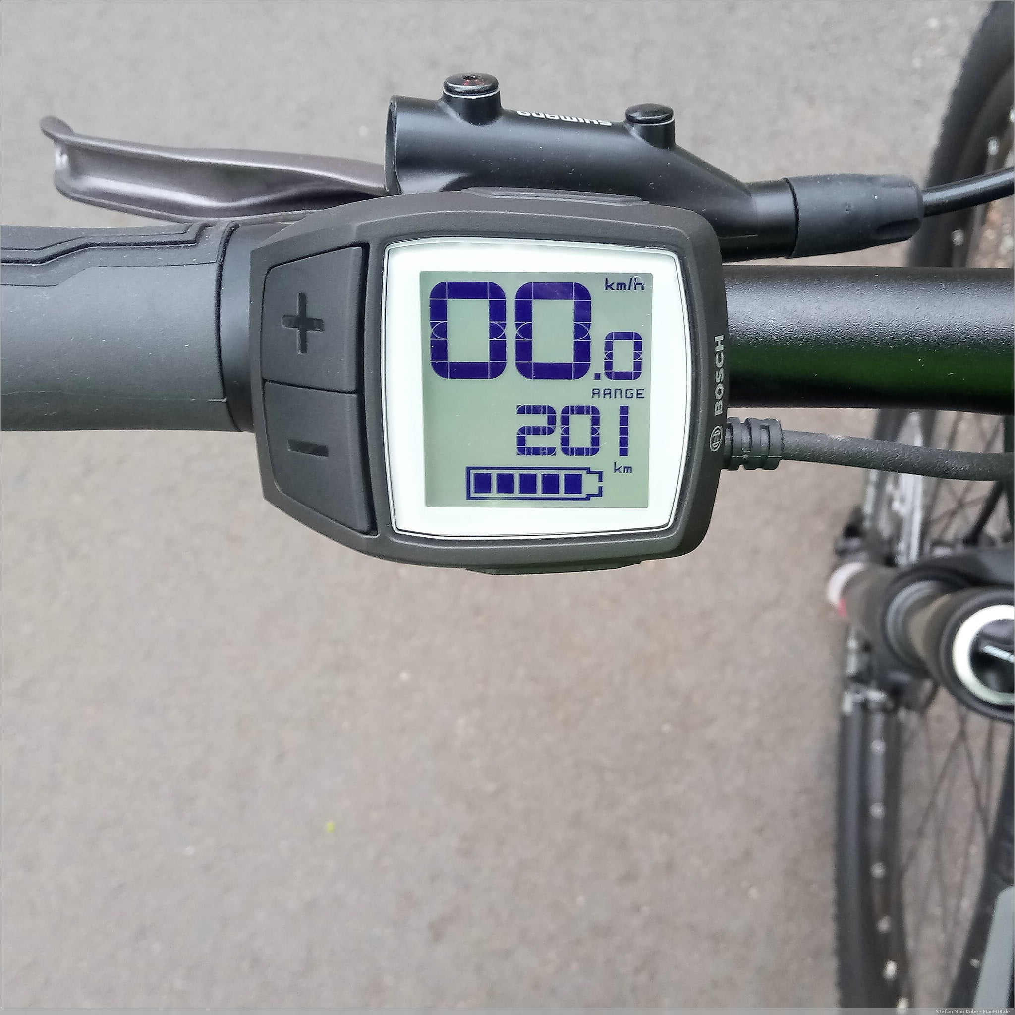 Das Display ist gut abzulesen. Es Bietet neben der Anzeige zur Geschwindigkeit und Akkustand wahlweise die Anzeige des Fahrmodus, der Restreichweite, Gesamt- oder Tourkilometer.