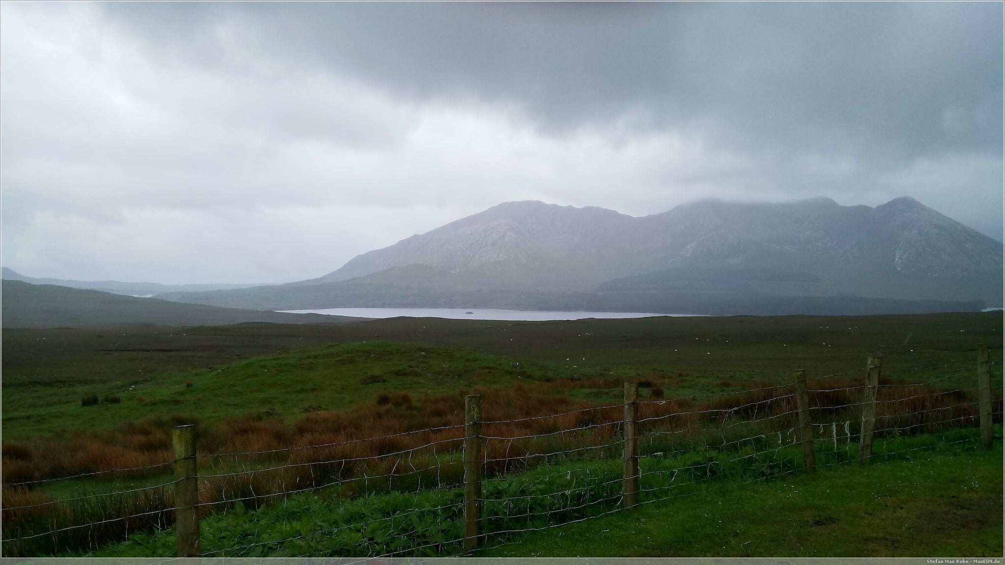 Beim Frühstück schauen wir nochmal grob wo es hingehen soll und nachdem wir uns von unseren Gastgebern verabschiedet haben, fahren wir los zurück in Richtung Galway. Das Navi, jetzt nur noch als grober Richtwert, ist so eingestellt, dass es Autobahnen vermeidet und die kürzeste Strecke raussucht. Das ist natürlich nicht die schnellste und führt uns daher auch schnell abseits der großen Straßen. So dauerte es nur wenige Kilometer, genauer am Lough Inagh, dass wir die R344 verlassen sollen und in eine kleine unscheinbare Straße fahren sollen, die recht schnell nur noch ein teils geschotterter Weg wird.