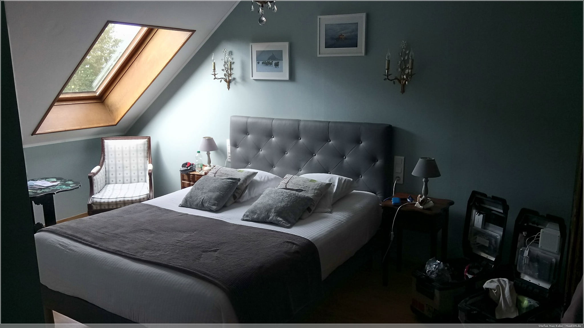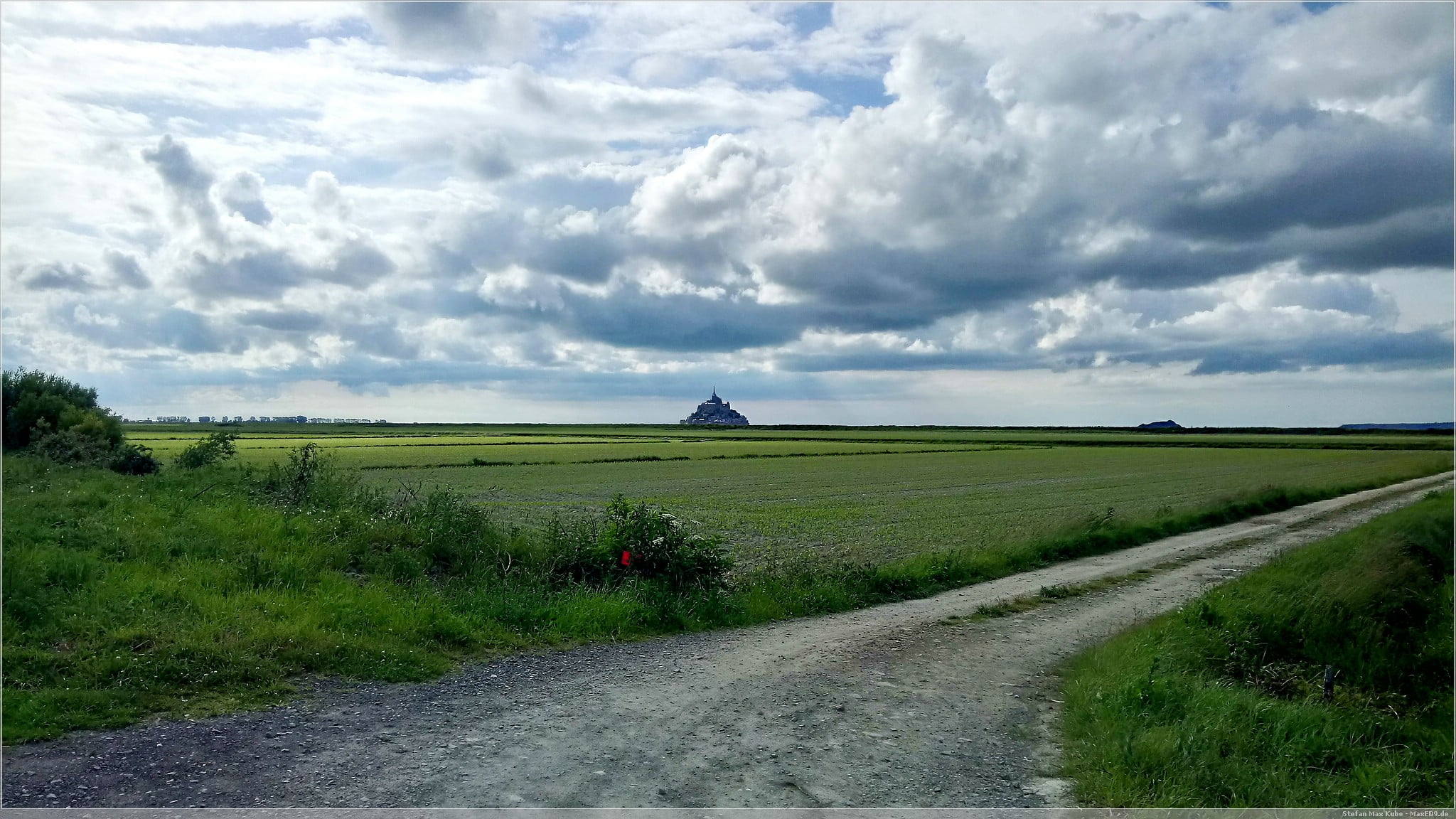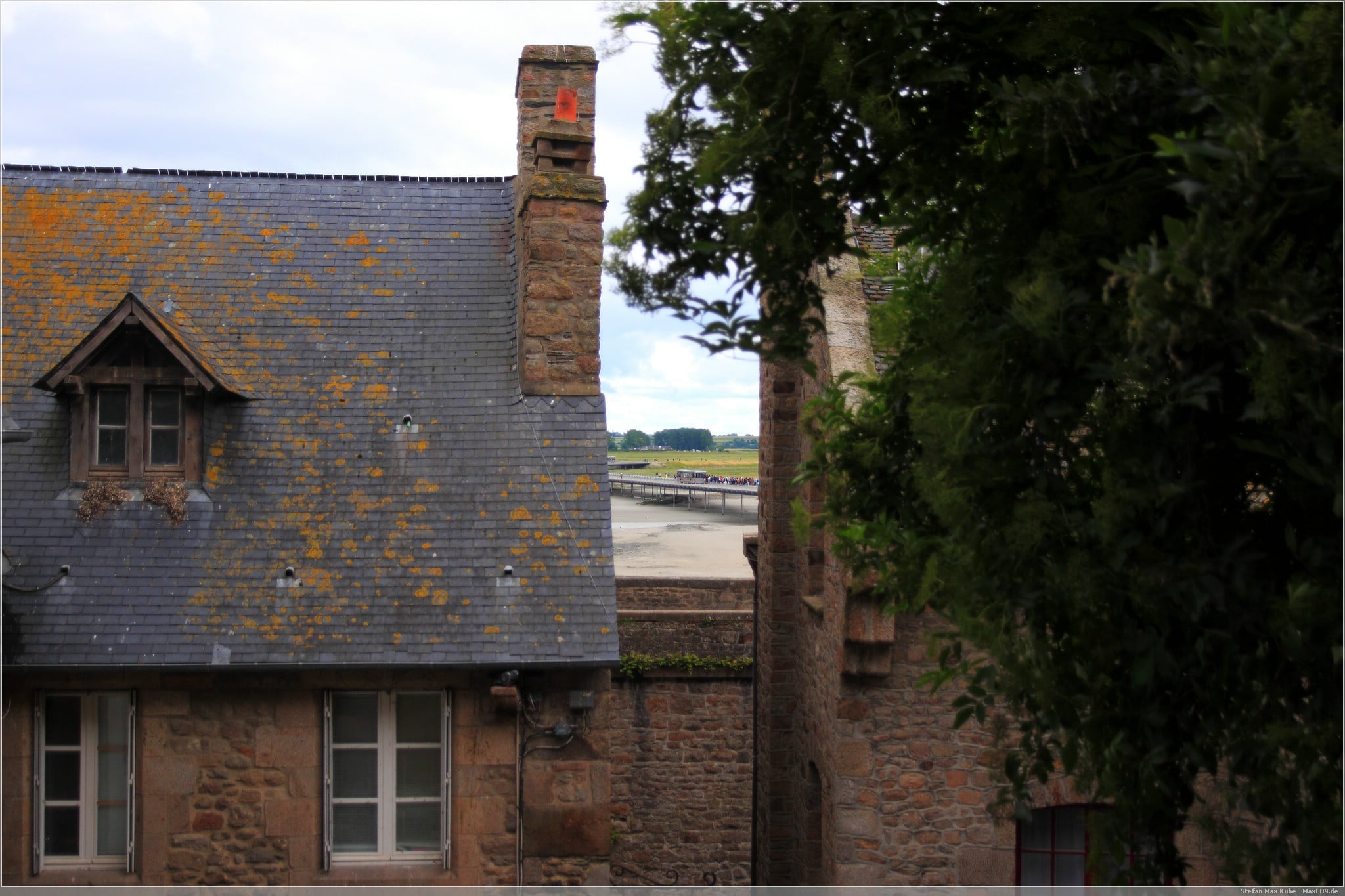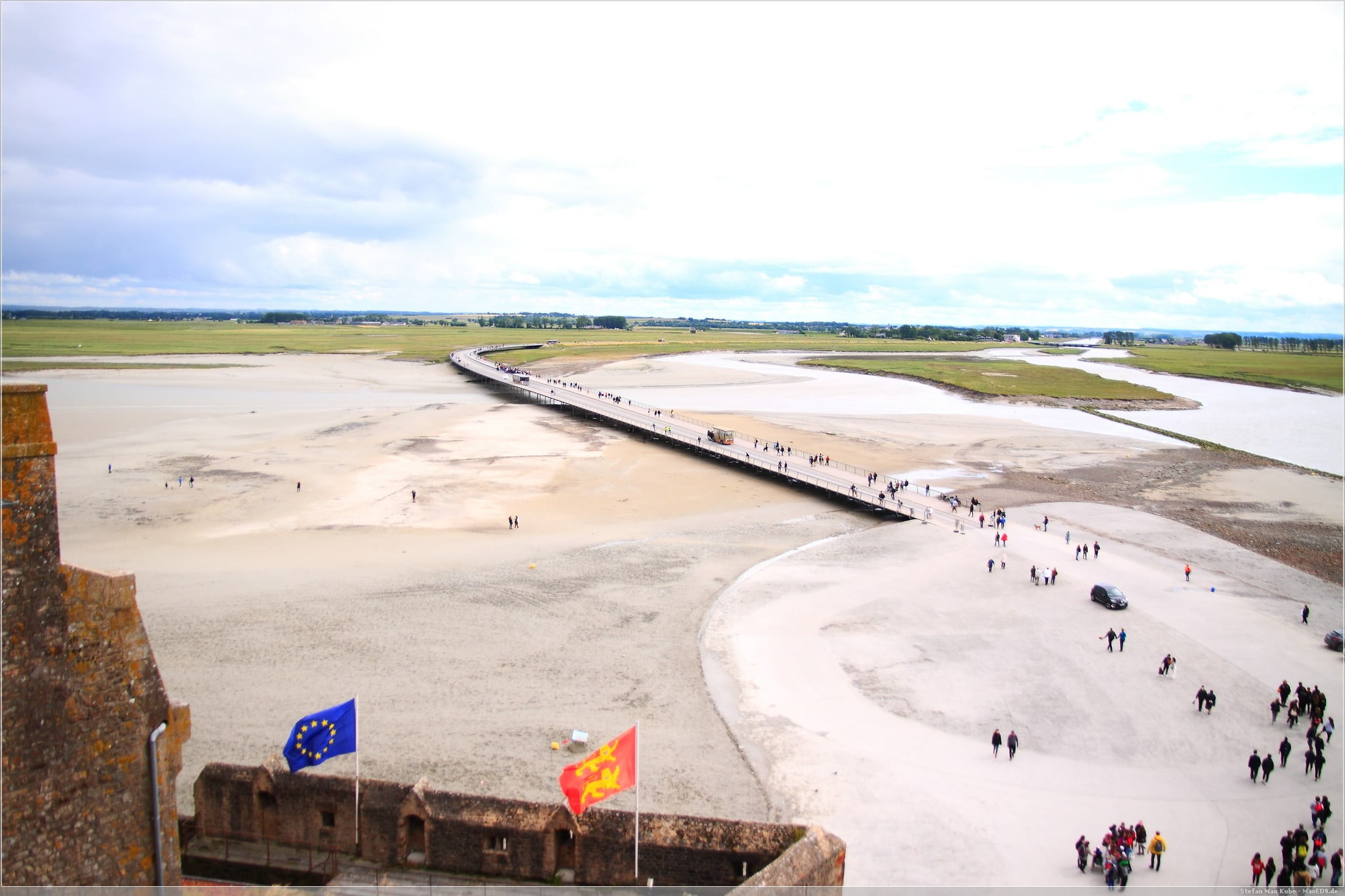 Die im Voraus gebuchte Unterkunft[1] erreichen wir am frühen Nachmittag. Schon während der Anfahrt war am Horizont der Mont Saint-Michel zu sehen. Von der Unterkunft ist es auch nicht mehr weit dorthin. Nachdem wir freundlich empfangen wurden, fuhren wir die knapp 3 km weiter zum Sammelparkplatz des Mont Saint-Michel.