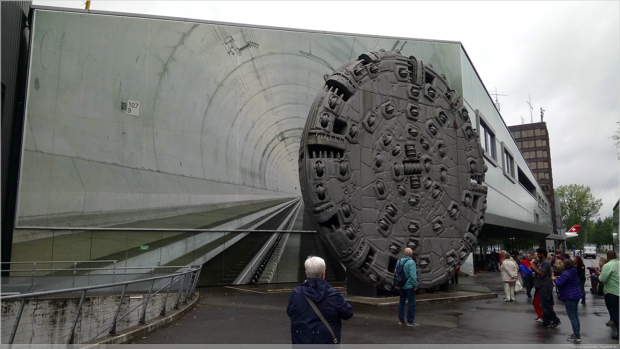 So ging es von Sachseln mit dem Zug nach Luzern und von noch ein paar Stationen mit dem Bus direkt bis vor den Eingang. Dort erwartet einen schon eine Bohrspitze für den Tunnelbau, vor der sich gerade ein Reisebus entlud zum Fotos machen.