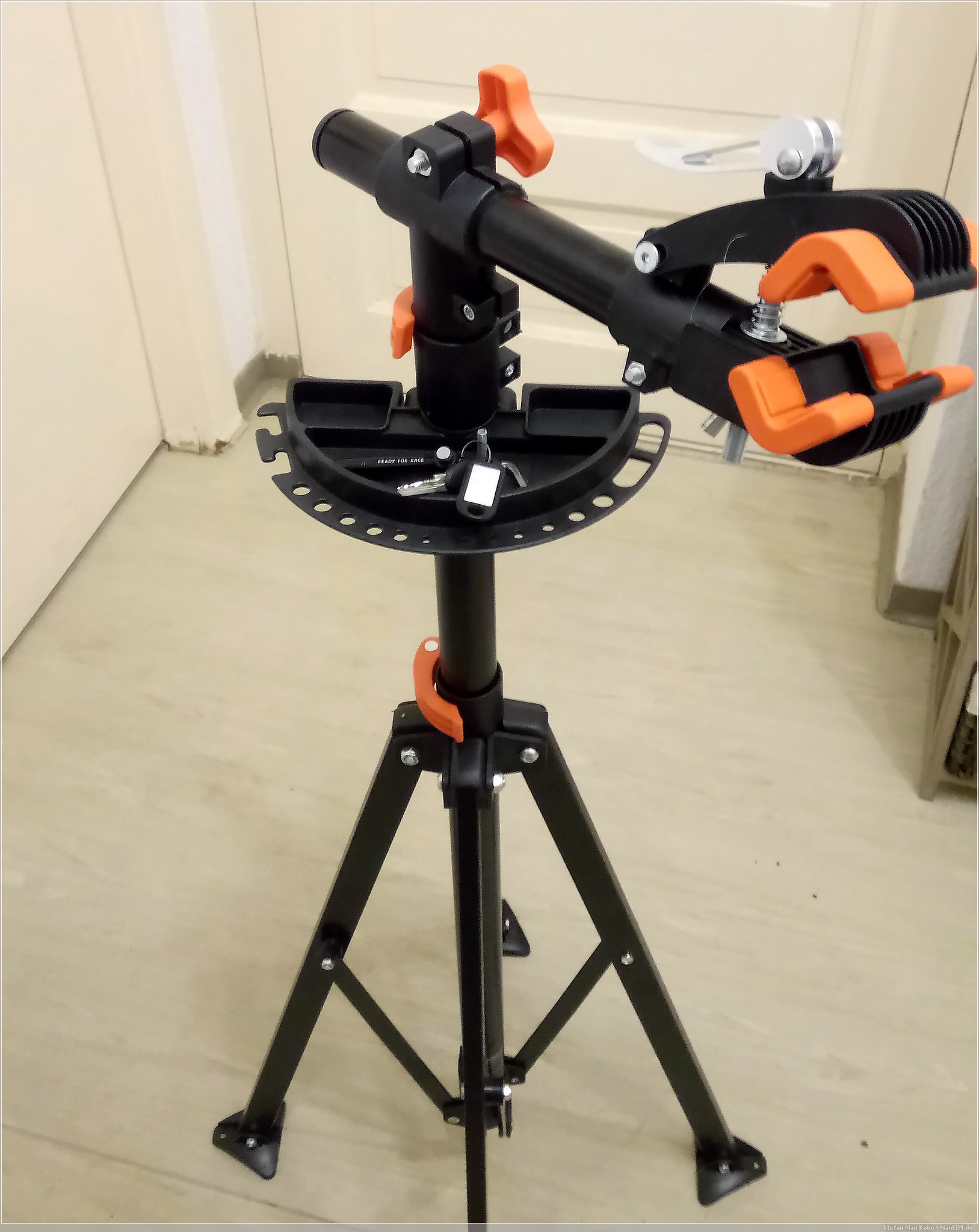 Die Werkzeugablage ist magnetisch und hält damit kleinere Metallteile fest, je nach Auszug des Ständers und Position zum Fahrrad und in Abhängigkeit der Rahmengeometrie kann sie aber auch mal im Weg sein. Wen das stört, kann sie natürlich weglassen oder nach hinten drehen.