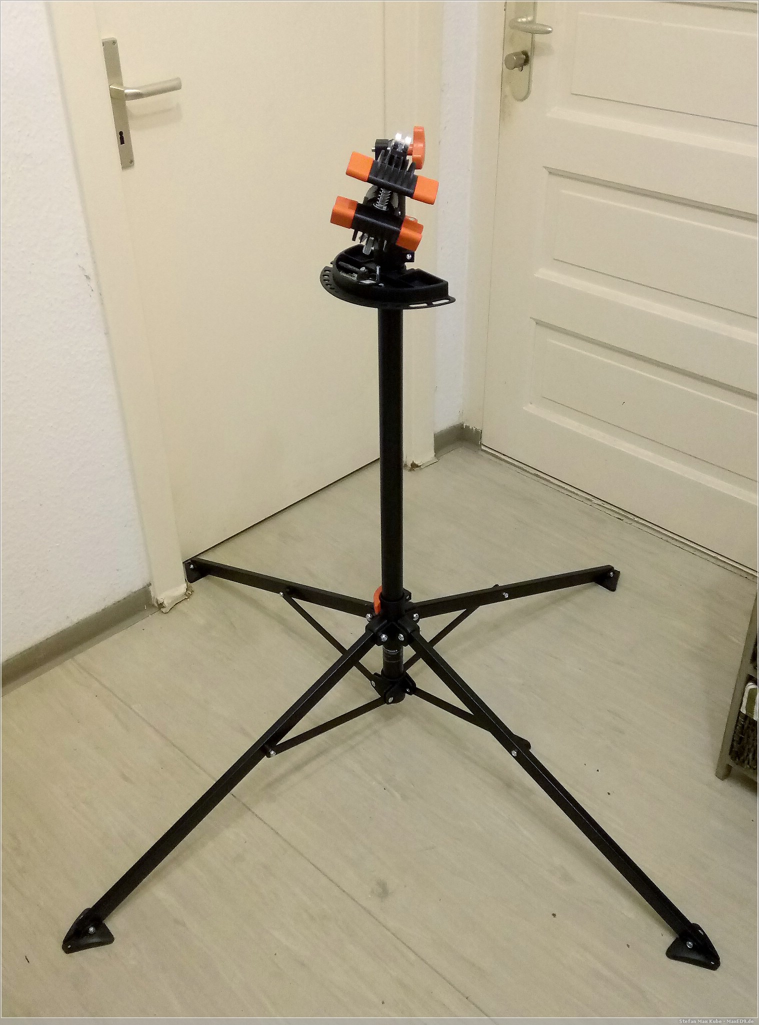 Der knapp 7kg schwere Montageständer kommt teilzerlegt und ist in wenigen Handgriffen montiert. Zusammengeklappt nimmt er nur wenig Platz weg und passt somit fast in jede Ecke.