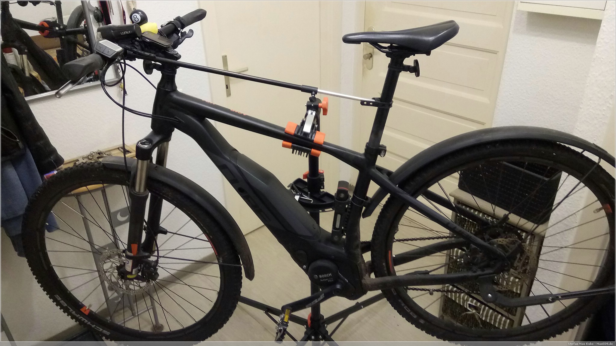 Die Länge des Auslegers ist ausreichen, so dass auch die Kurbel im angehängten Zustand gedreht werden kann. Damit lässt sich auch die Kette leichter fetten.