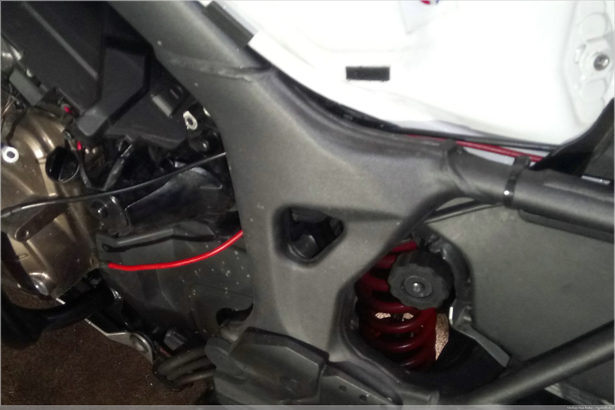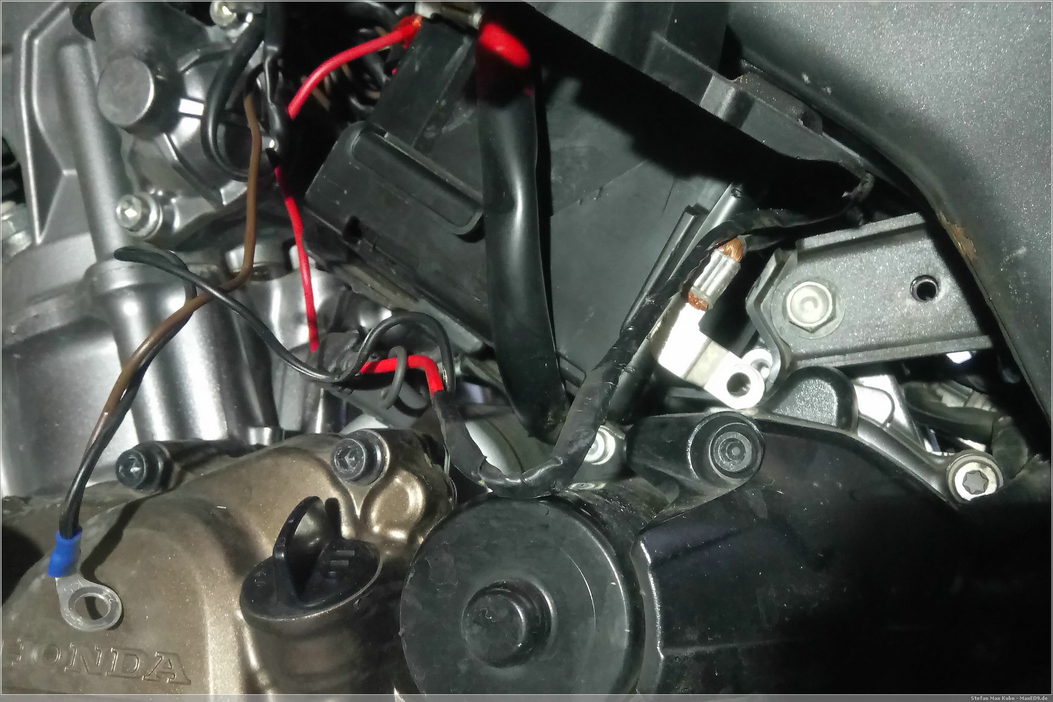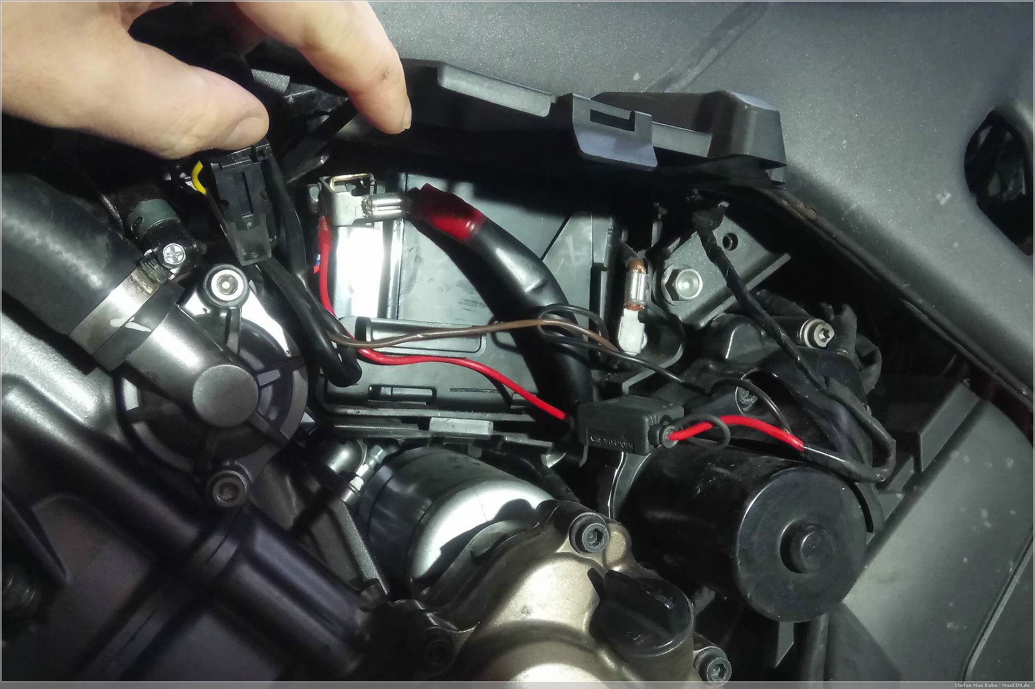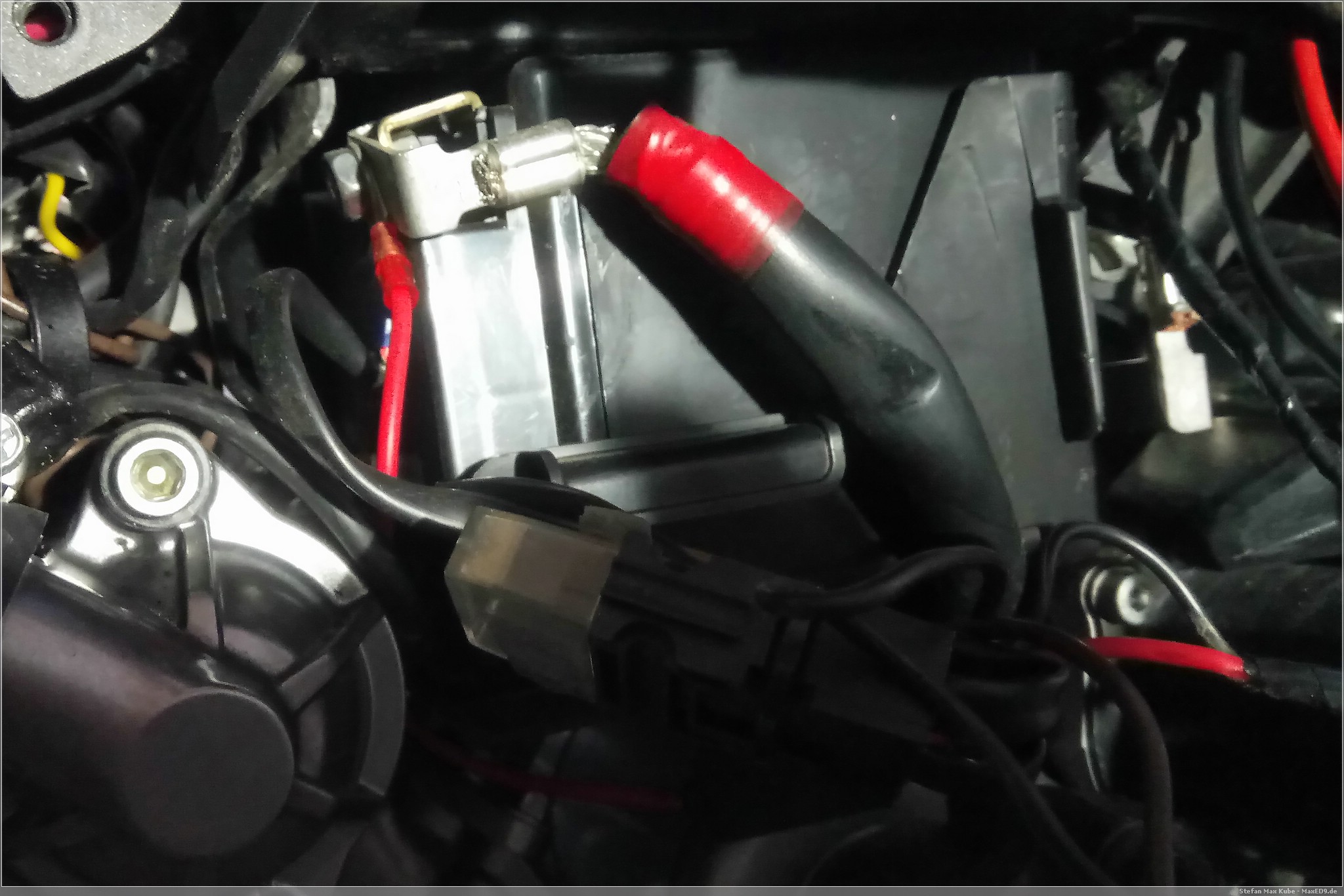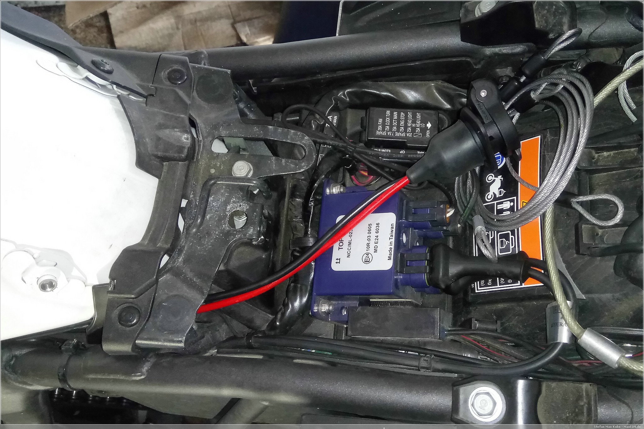 Nach dem die Kabel gelöst sind, lege ich die Steckdose unter die Sitzbank und verlege die Anschlusskabel entlang des Tanks zur Batterie, um sie dort an Plus- und Minuspol anzuschließen.