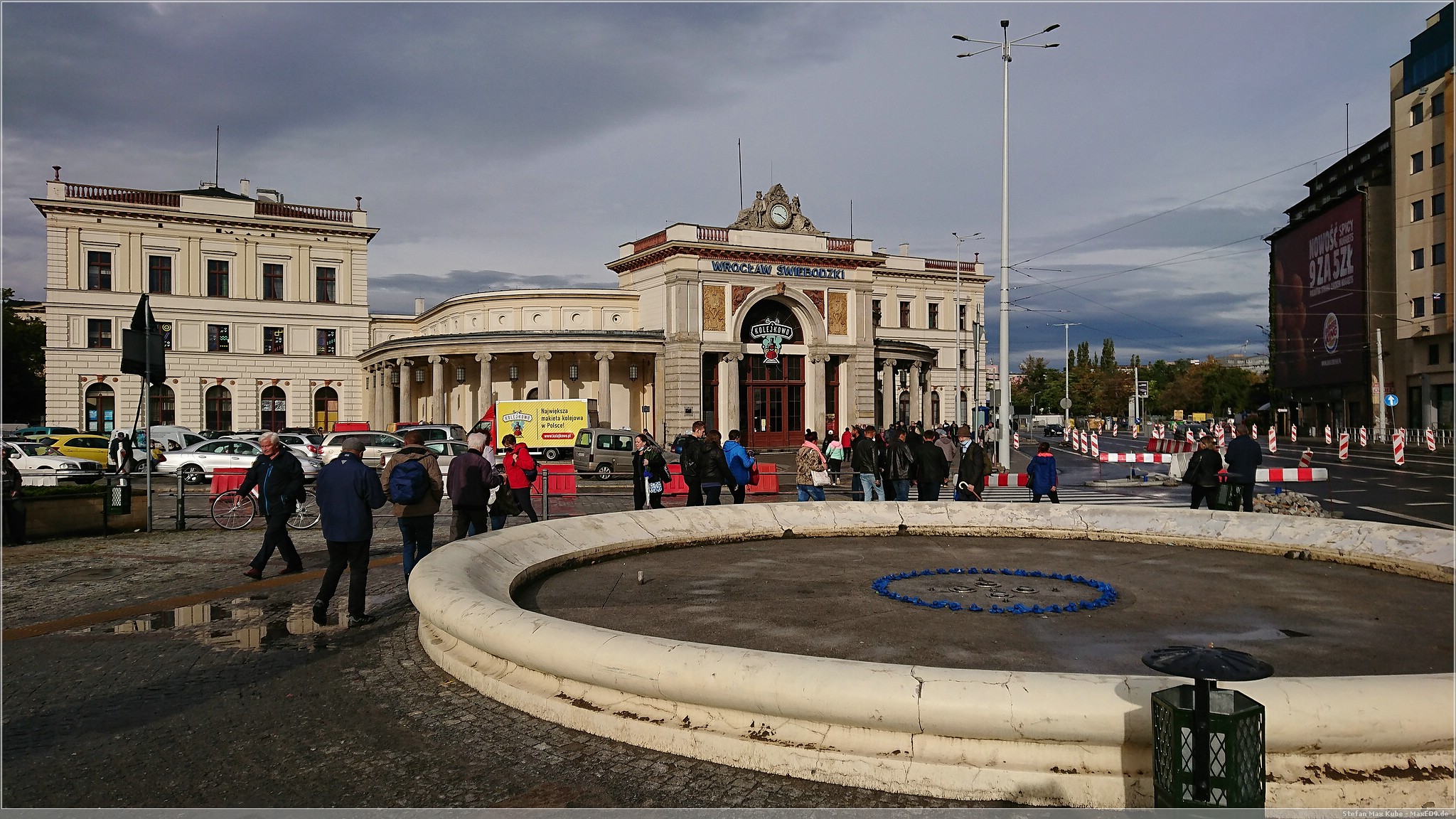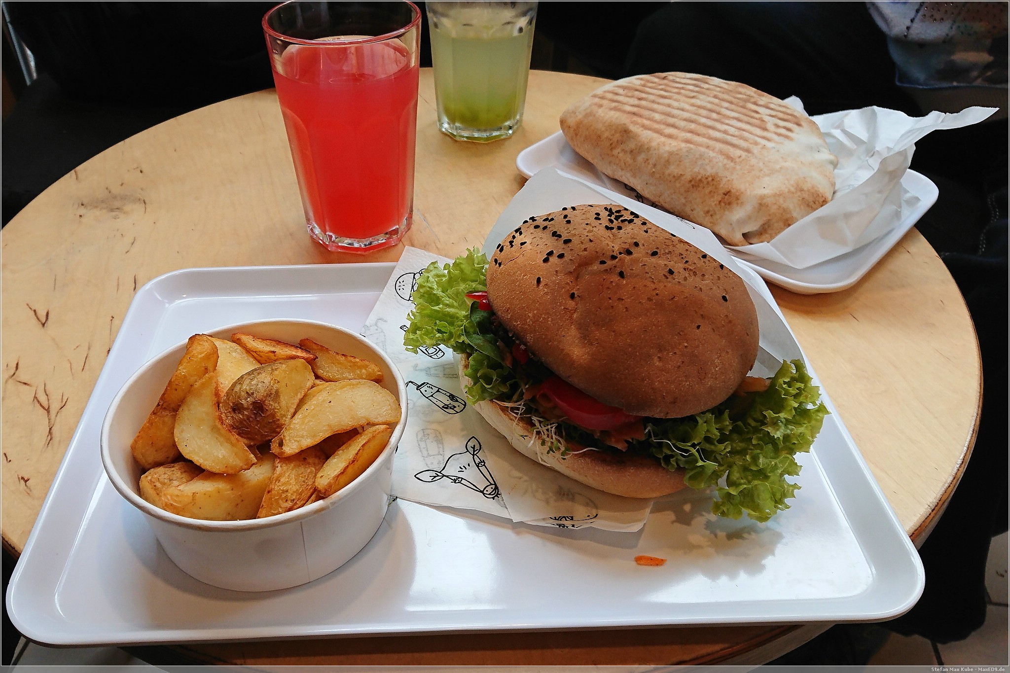 Zurück ins Zentrum nahmen wir dann den Bus. Dieser brachte uns an einen westlichen Zugang zum großen Ring. Mittlerweile war es auch schon zeit für einen Mittagssnack und wie der Zufall es so wollte, kamen wir an einer Krowarzywa-Filiale[4] vorbei. Die Kette kannte ich bereits aus Warschau. Hunger hatten wir genug, also gab es Limo und Burger.