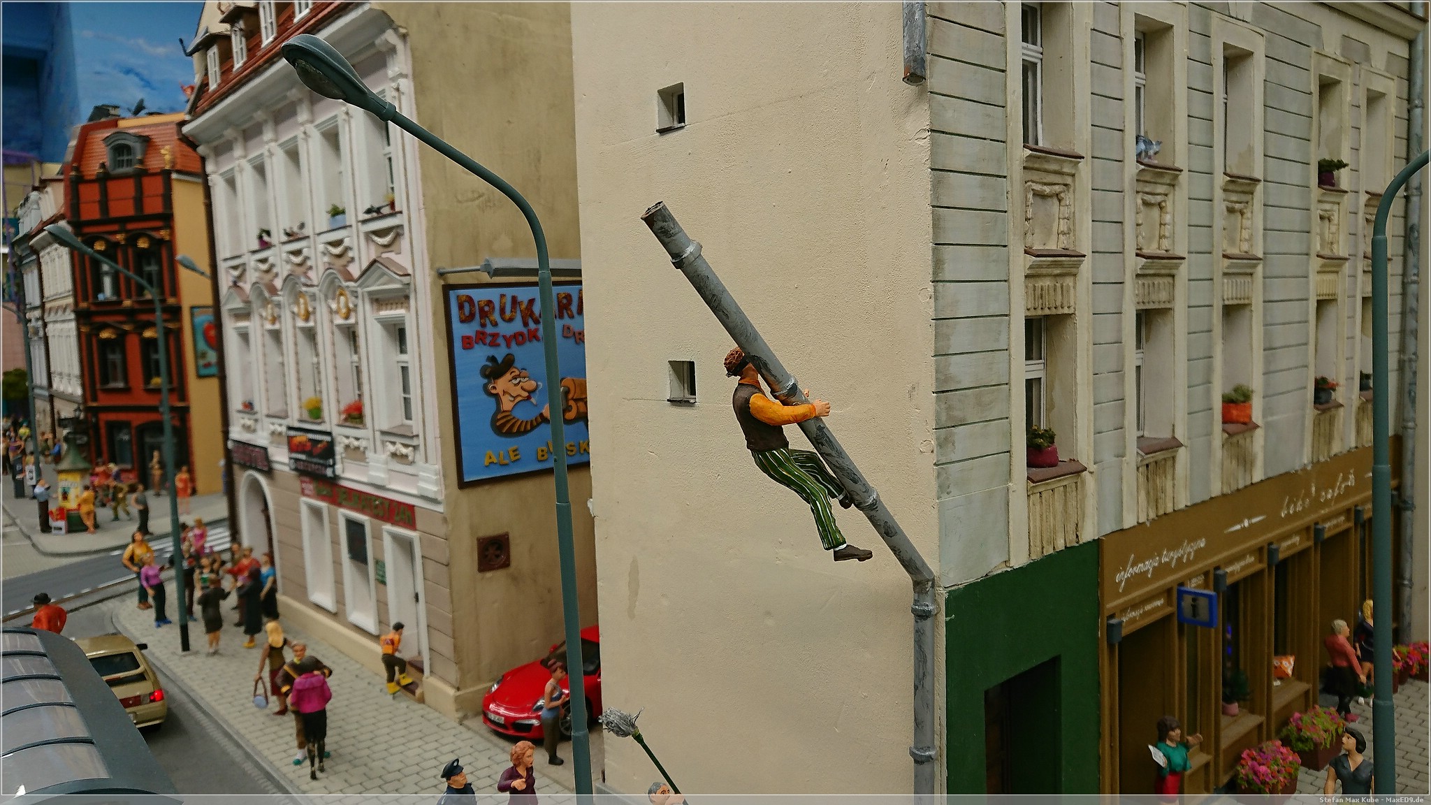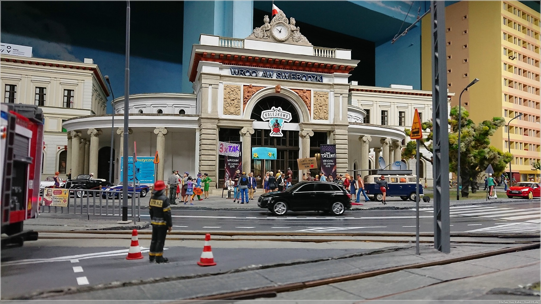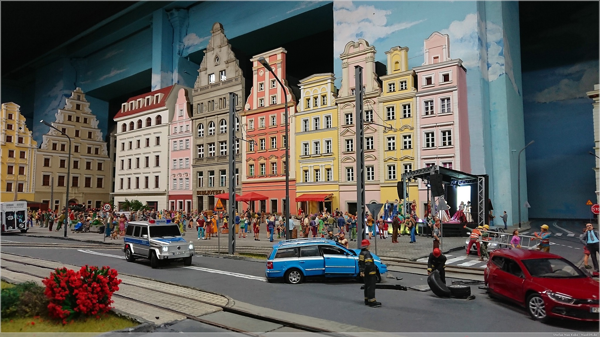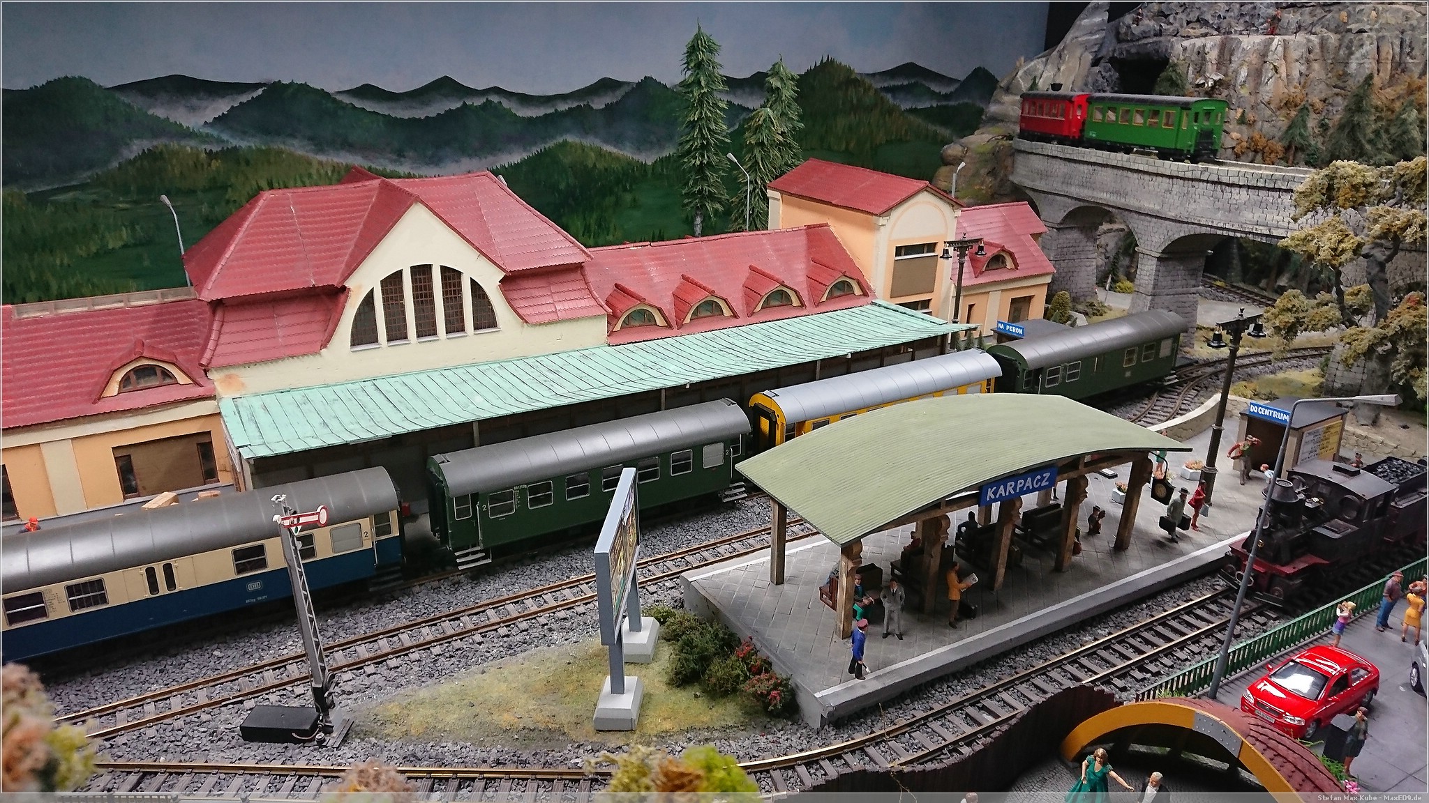 Wir wollten hier zur Modellbahnanlage, da aber noch Zeit war, bis die Ausstellung öffnete, schlenderten wir auch mal kurz über den Markt. Doch dann konnten wir endlich in das Kolejkowo[1], die Modellbahnausstellung. Die Anlage bildet in Spurweite G Ausschnitte der polnischen Landschaft ab.