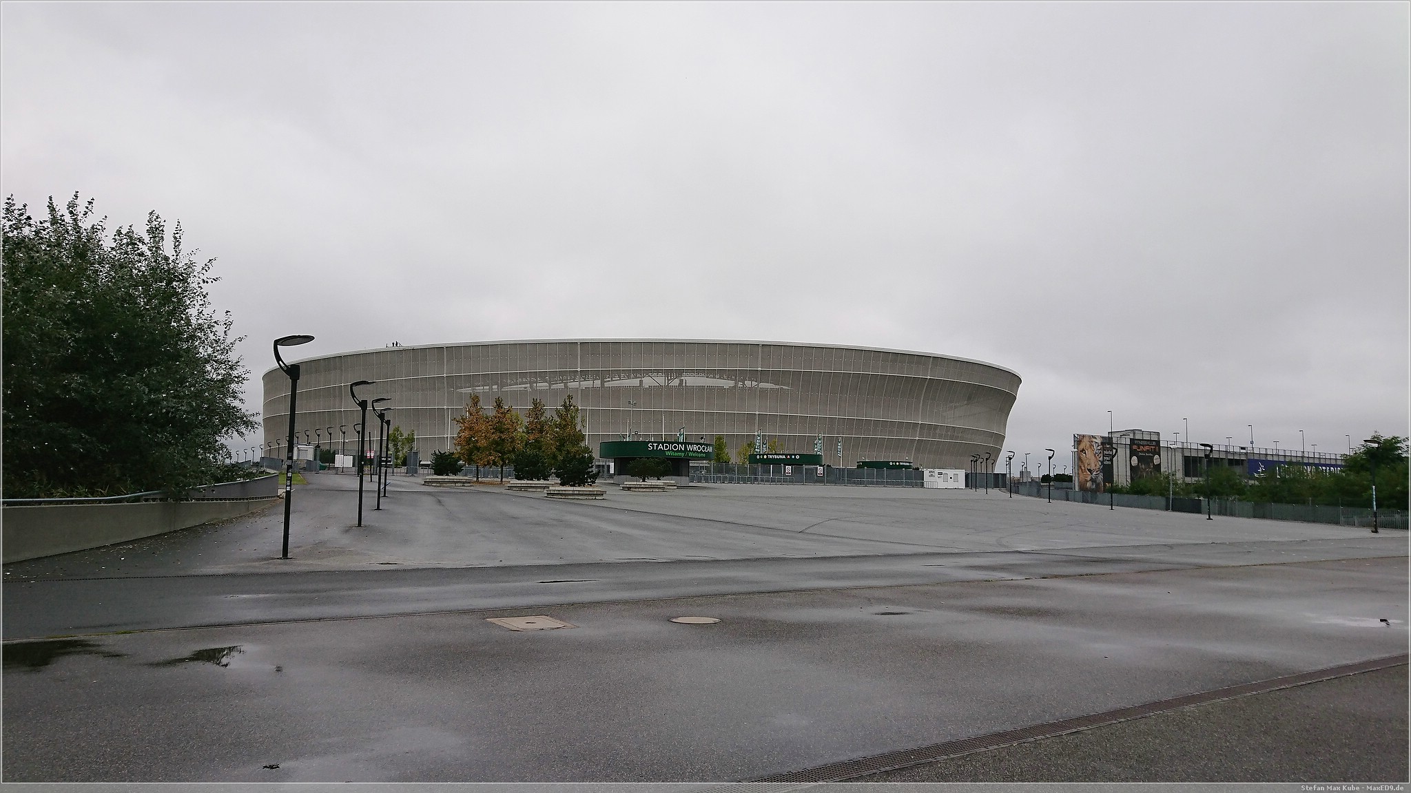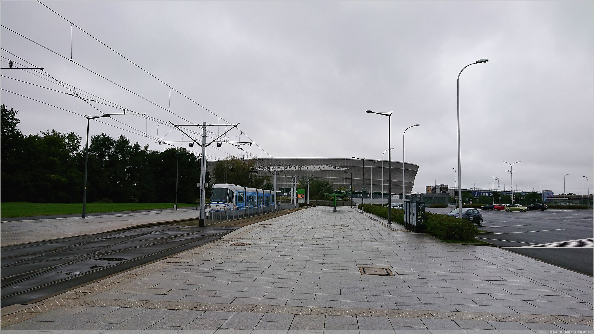 Als wir aus dem Museum raus kamen, regnete es noch doller und es war noch so viel Zeit, bis unser Zug nach Berlin fuhr. Wir überlegten kurz und stiegen dann einfach in die nächste Tram ein, mit der wir einfach bis zur Endhaltestelle fuhren. Zufälligerweise war dies die Linie zum Stadion, welche uns nordwestlich an den Stadtrand brachte. Der Regen ließ nach und so suchten wir hier bei noch leichtem Nieselregen den Cache[3] zum Stadion. Die Suche gestaltete sich etwas schwieriger. Der Hinweis, obwohl auch in Englisch verfügbar, sorgte zunächst für mehr Unklarheiten, aber mit etwas Geduld wurden wir doch noch fündig.