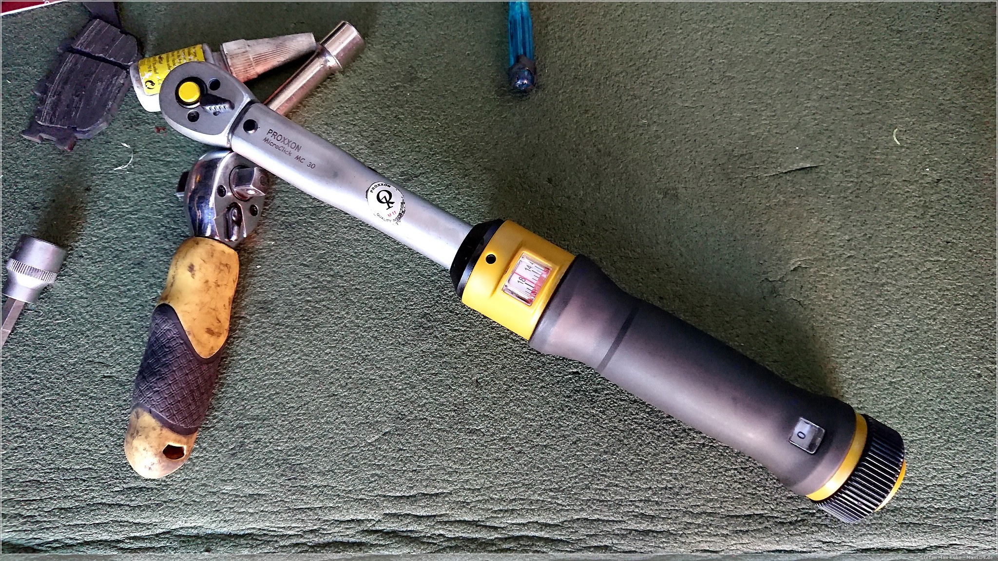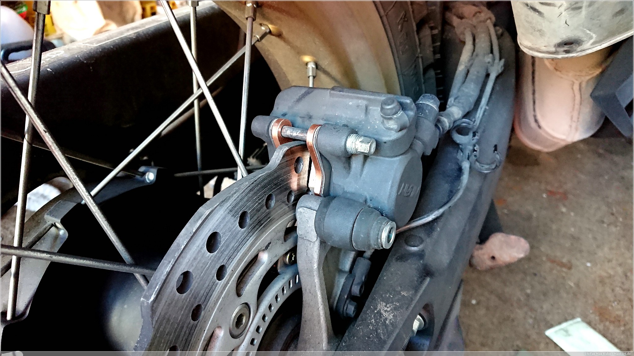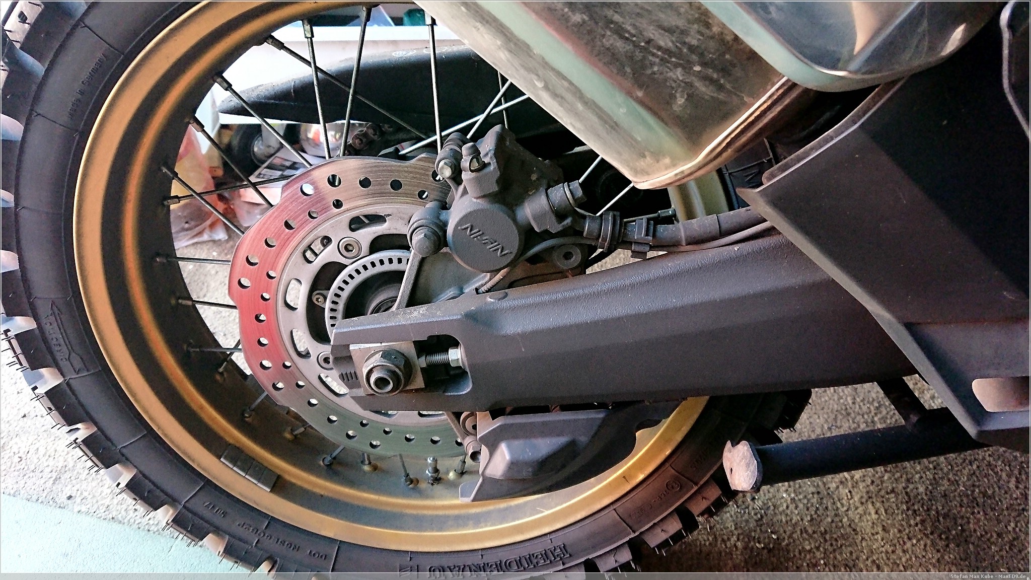 Nun zurück zur Hinterradbremse der Africa Twin, speziell zu den Belägen im Bremssattel. Theoretisch lässt sich der Aus- und Einbau mit dem Bordwerkzeug durchführen, einzig für die Anzugsdrehmomente sind dann entsprechend passende Nüsse und Drehmomentschlüssel notwendig. Zusätzlich sollte ein Drahtbürste, ein Kratzer oder dünner Schlitzschraubendreher, etwas Bremsenreiniger und Lappen bereit liegen. Kupfer- und/oder Keramikpaste aka Bremsenfett ist ebenfalls hilfreich.