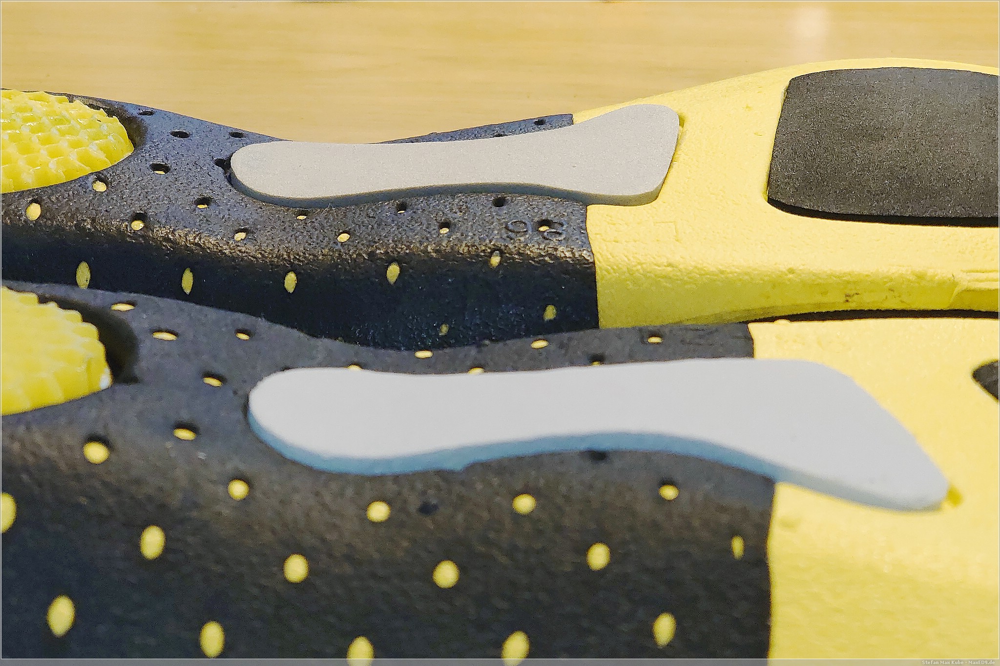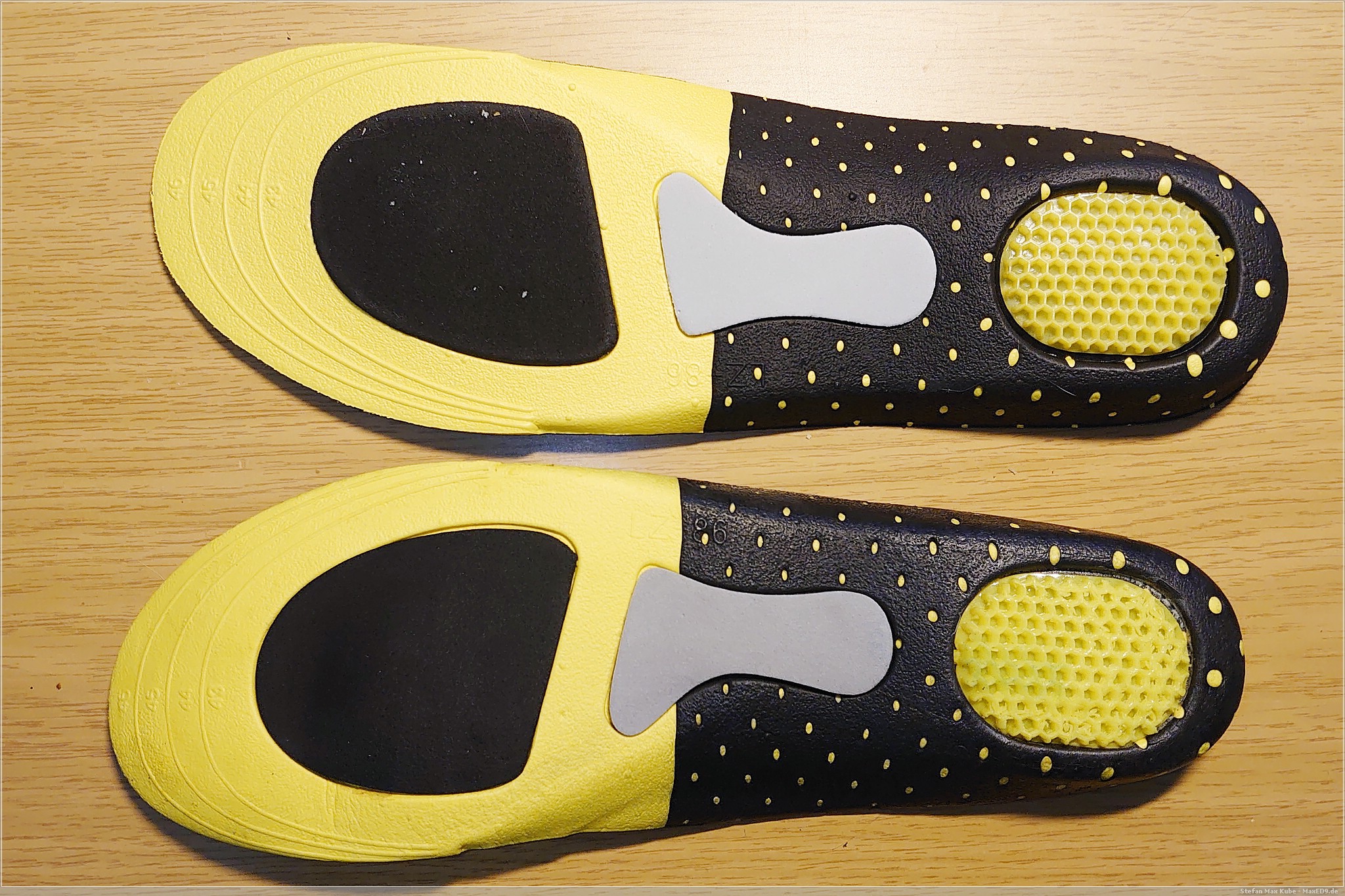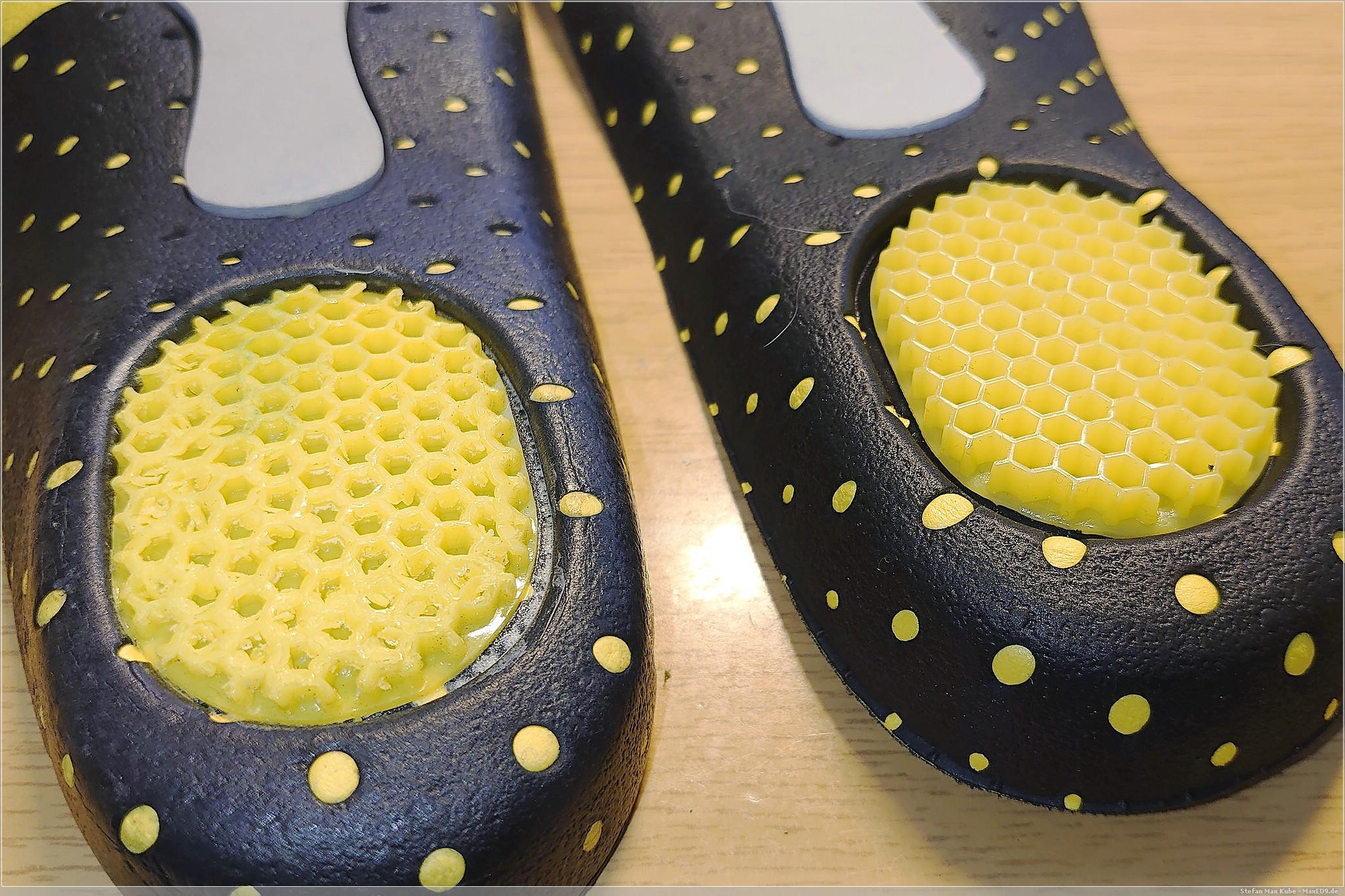 Während die Wabenstruktur an der Ferse langsam die Form verlieren, sind die beiden anderen Zonen entsprechend komprimiert und flacher. Die Mittelfußtütze hingegen, nimmt bei mir kaum ab, eventuell wirkt hier die Abflachung an Zehen und Ferse entsprechend entgegen.