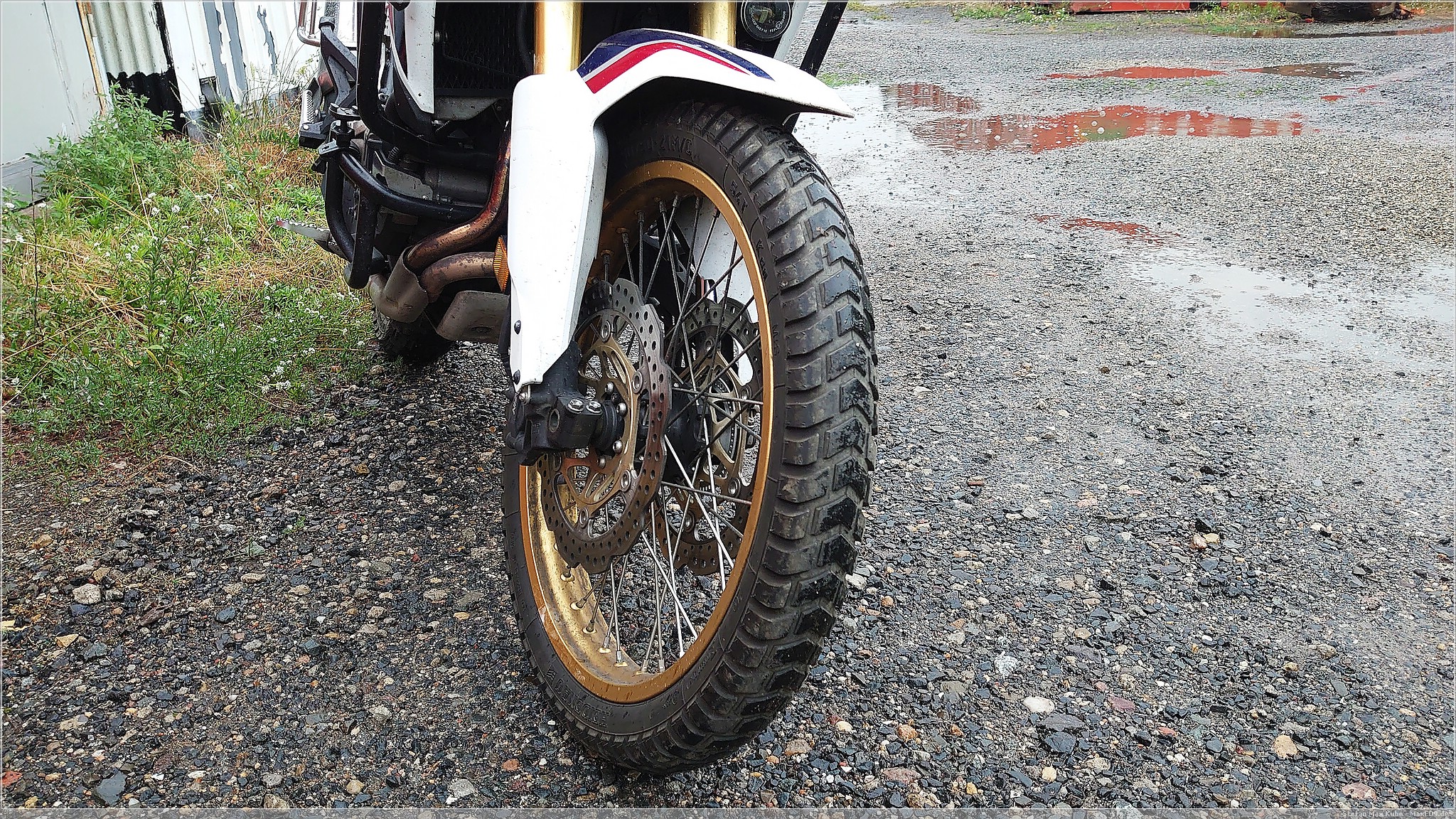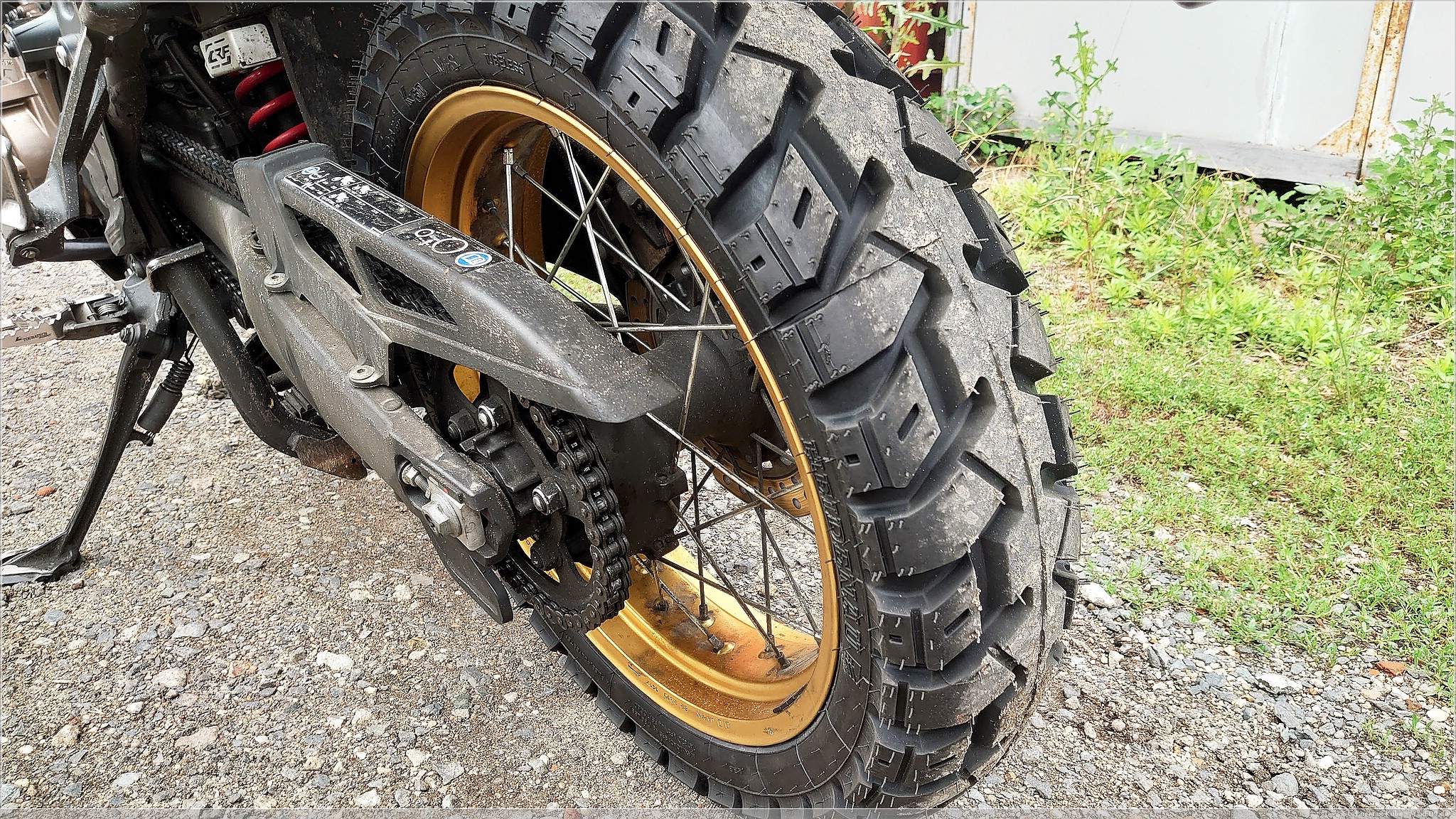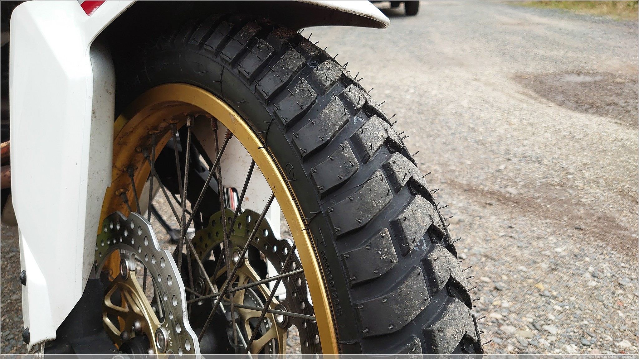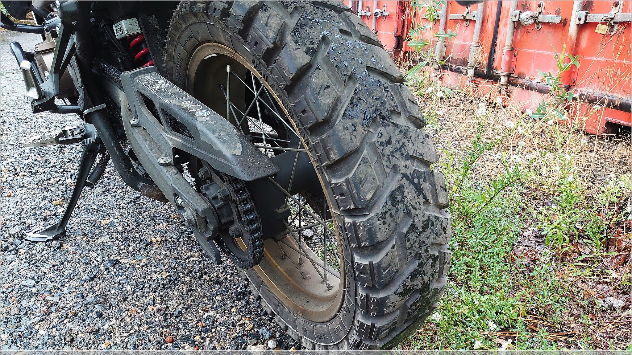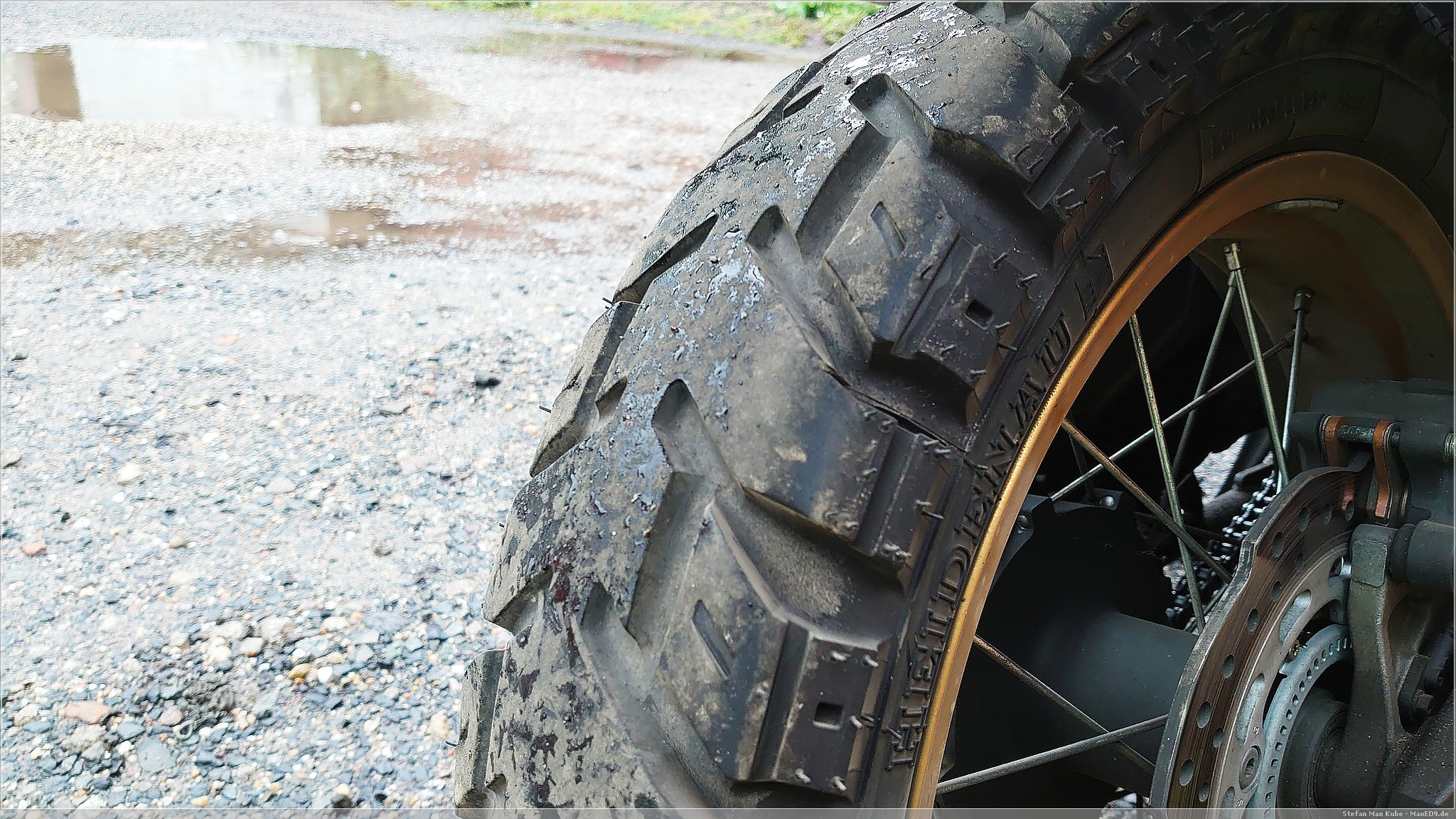 Das berühmte Eckigfahren sieht man gut an dem abgefahrenen Hinterrad, die teilweise langen Anfahrten über die Autobahn sind halt nicht sonderlich reifenfreundlich, dennoch bot der Reifen, ob der Laufleistung, immer noch guten Halt und dies auch auf losem Untergrund. Dennoch, der Wechsel war offensichtlich nötig, denn hinten merkte man eben auch schon das Kippen in der Kurve.