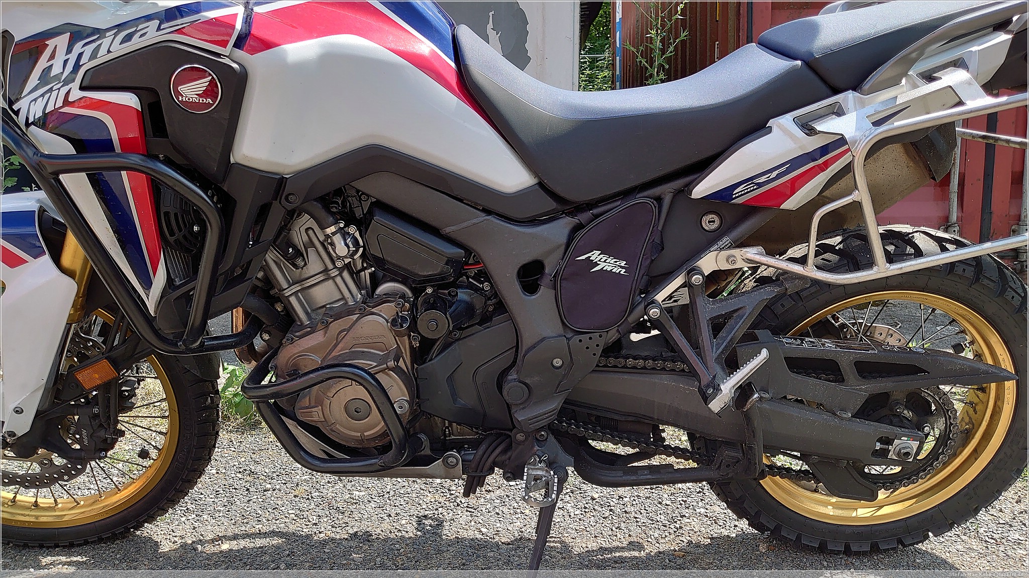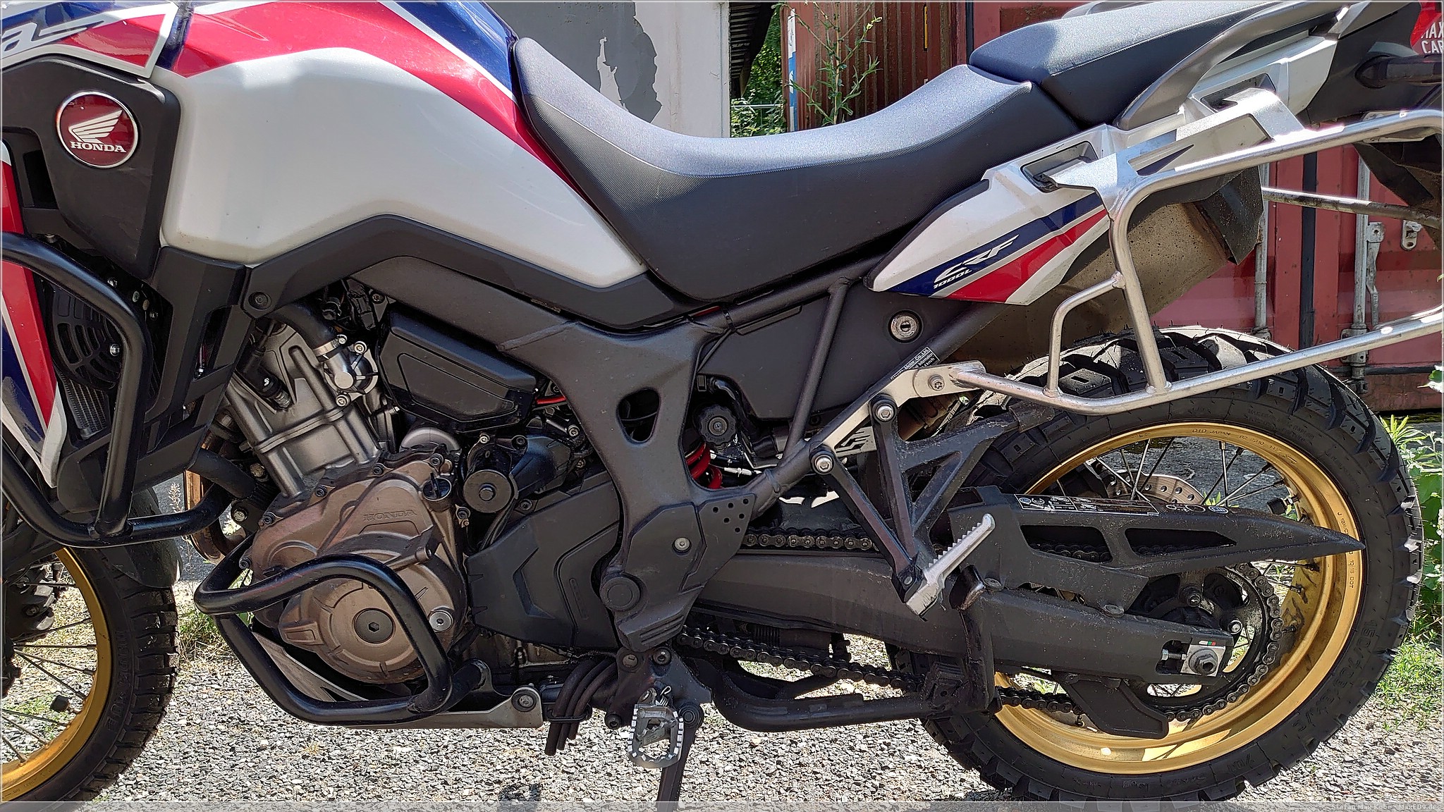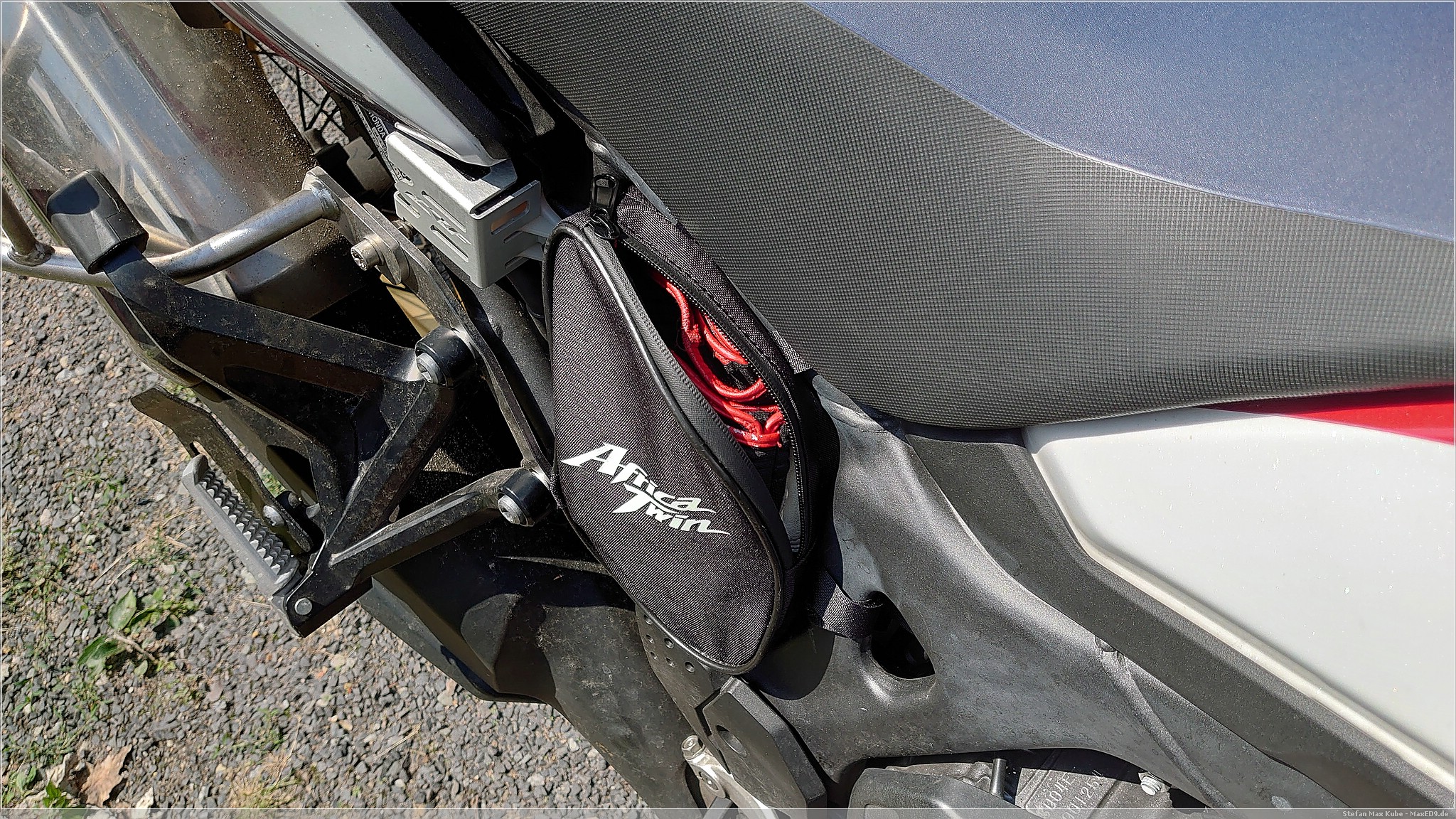 Die die CRF1000L bietet unter dem Sitz schon recht viel Platz, da aber dort die Treiber der Nebelscheinwerfer, der CLS-Kettenöler, eine Verbandstasche und ein paar Stahlkabel schon fast den ganzen Platz verbrauchen, bleibt kein weiterer Stauraum. Das wurde teilweise mit dem Adventure Sports und Nachfolge-Modellen verbessert.