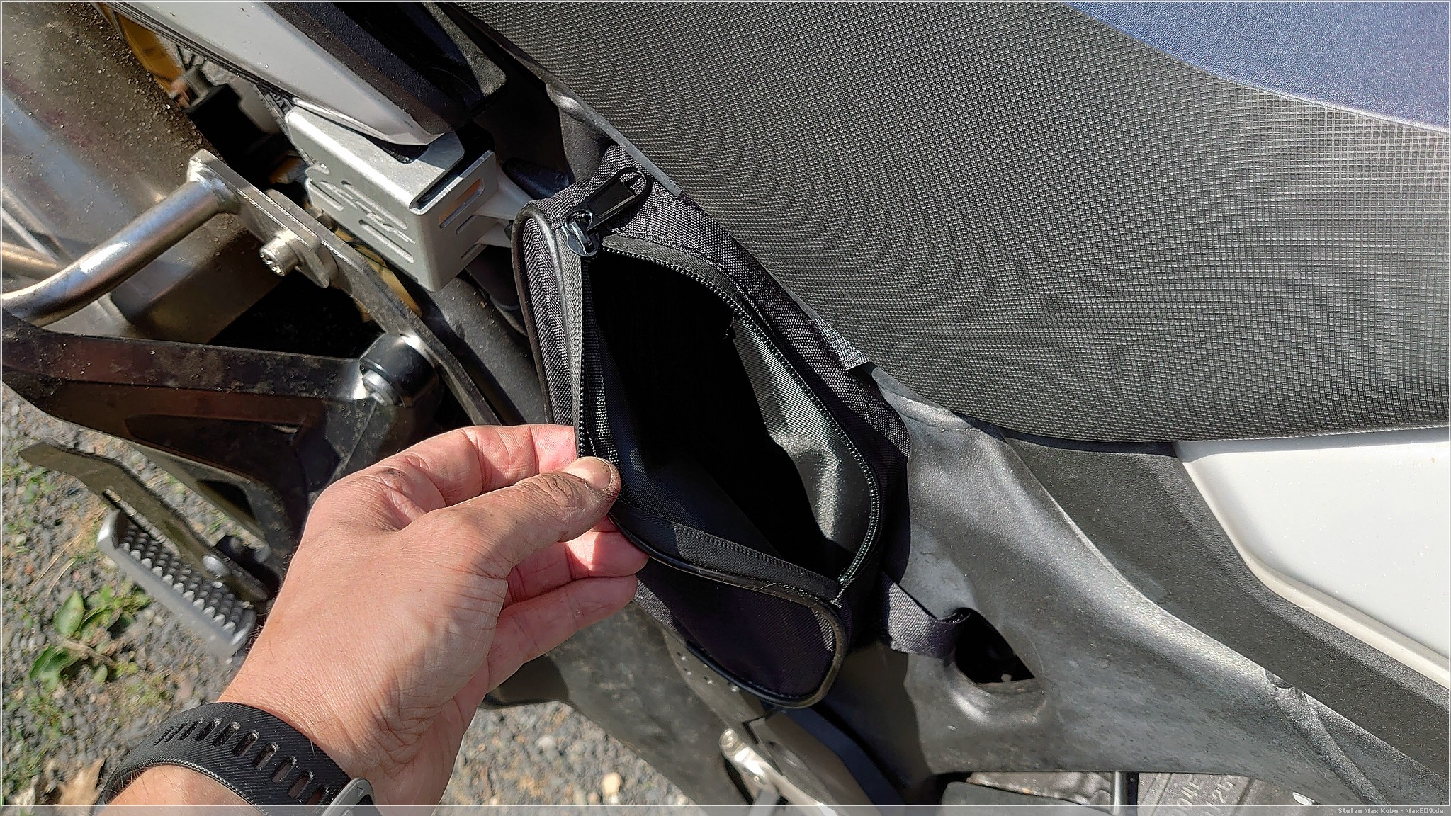 Glücklicherweise bietet der Zubehörmarkt aber auch immer Lösungen für nicht ganz so ernste Probleme in Form von Rahmentasche, welche ich auf einer kleinen chinesichen Handelsplattform fand[1], gibt es aber auch anderswo. Die Taschen kommen in die Rahmenlücke rechts und links direkt unter dem Fahrersitz.