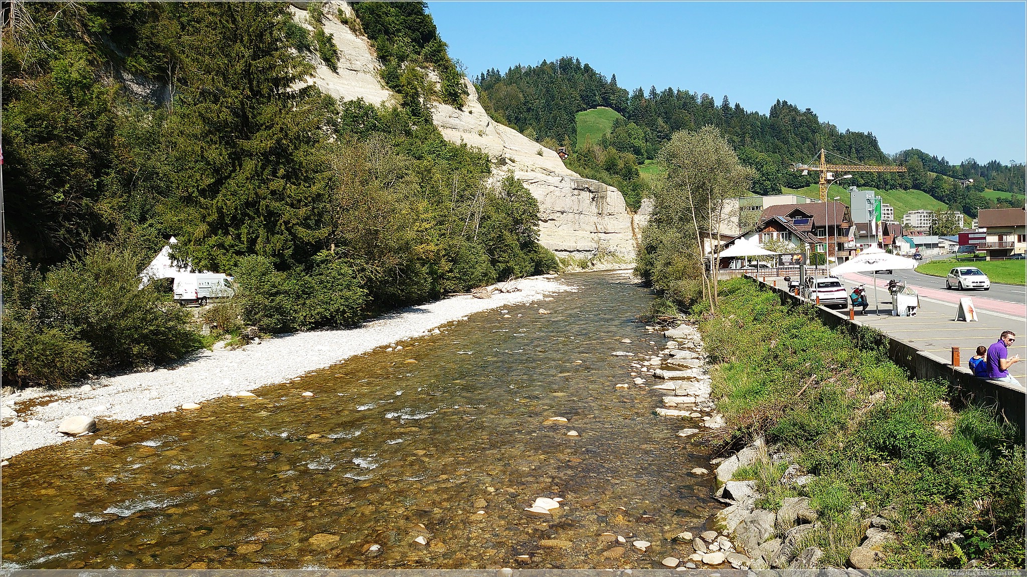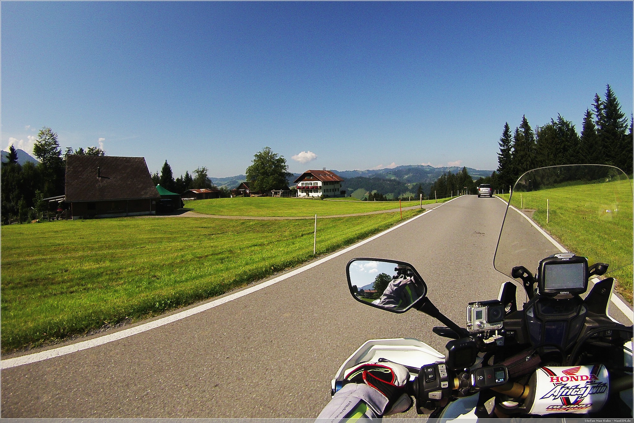 Nach dem Frühstück ging es bei bestem Sonnenschein mit den Töffs zunächst durch Sarnen und dann Richtung Entlebuch über den Glaubenbergpass. Kurz vor dem Ziel, an einer etwas neueren Holzbrücke, der Badbrücke, gab es noch einen Cache[3] am Wegesrand zu pflücken, bevor es zum Tropenhaus ging.