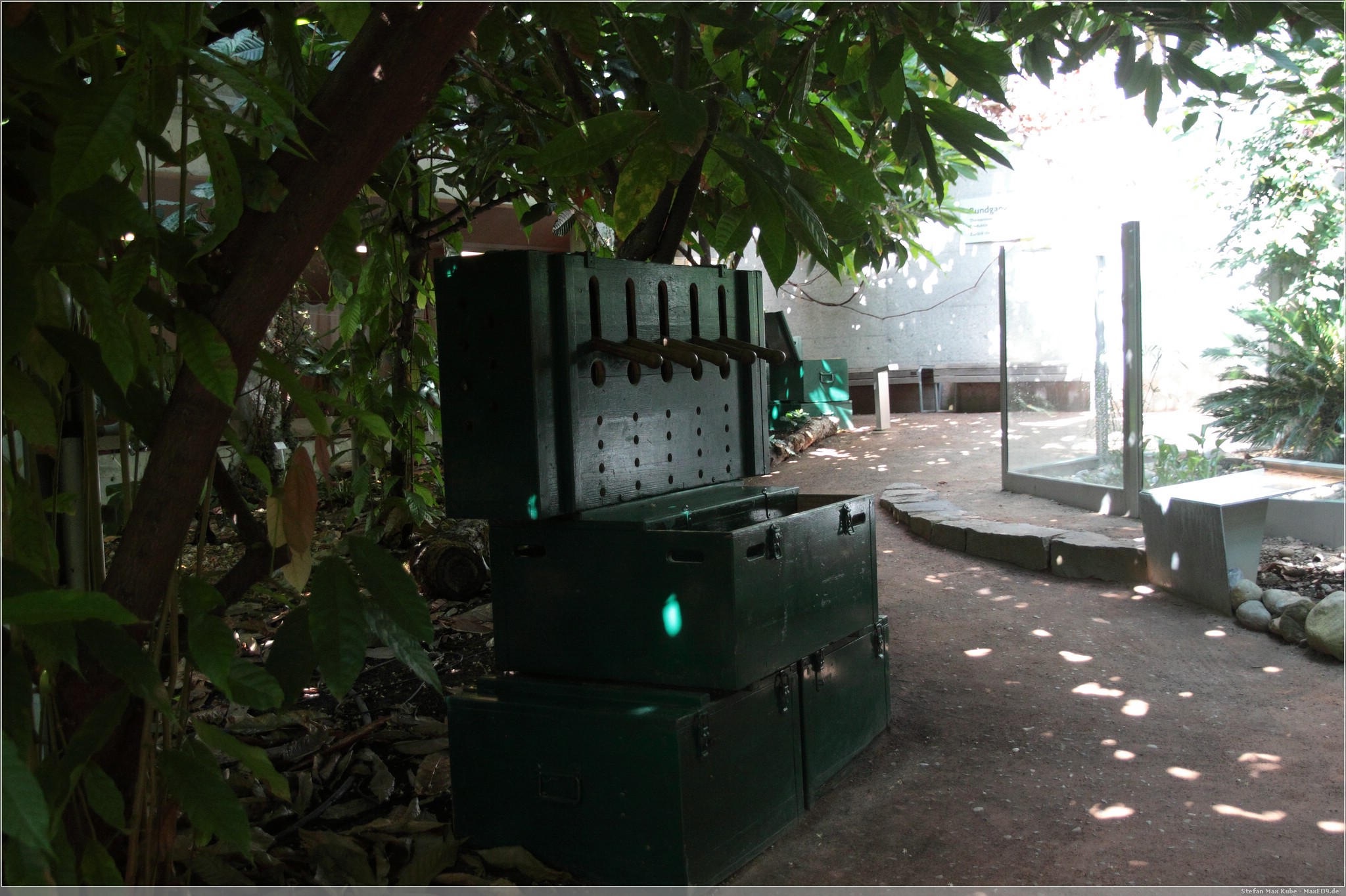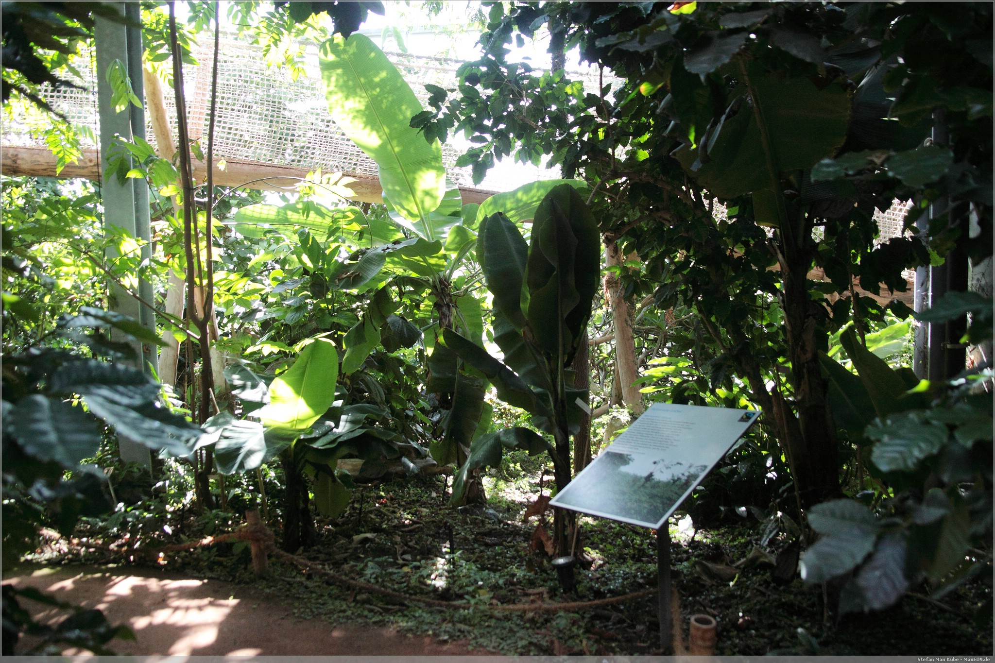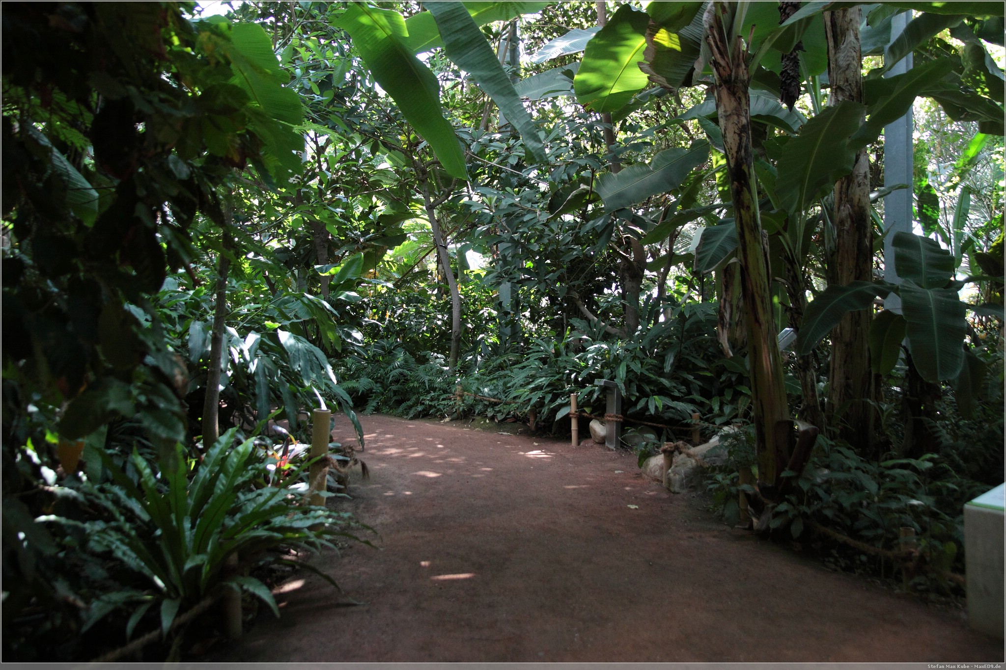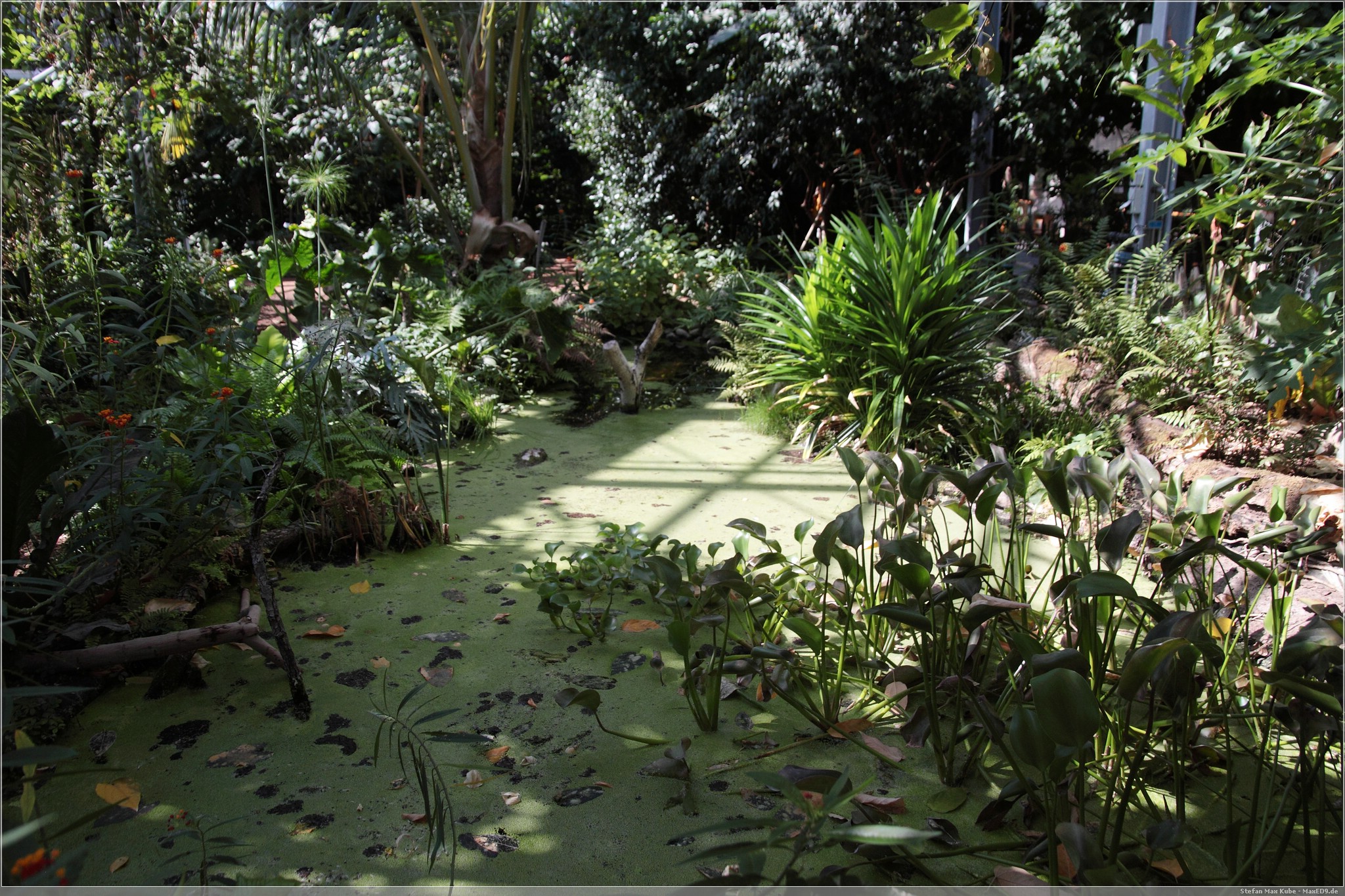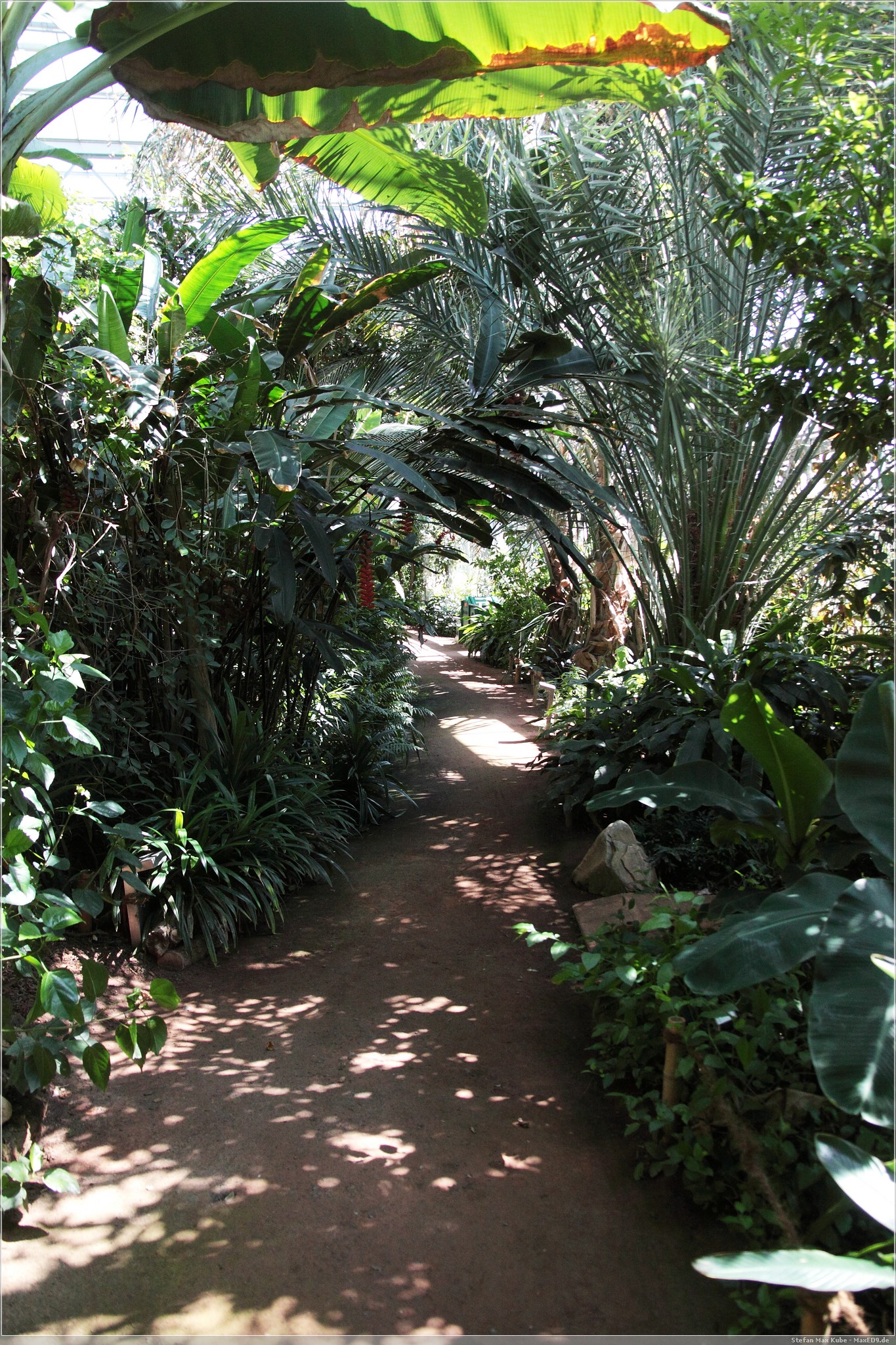 Ein interessanter Bau erwartete uns mit reichlich grünen Pflanzen, interessanten Informationen und auch einigen tierischen Bewohnern, wie Schildkröten, Drachenkopfschrecke und dem Palmendieb. Auf die Schildkröten wies man uns beim Kartenkauf direkt hin, dass dort 5 freilaufend leben und wir vielleicht Glück haben, sie zu sehen, denn die verstecken sich gerne in den tropischen Pflanzen und naschen hier und da auch davon.