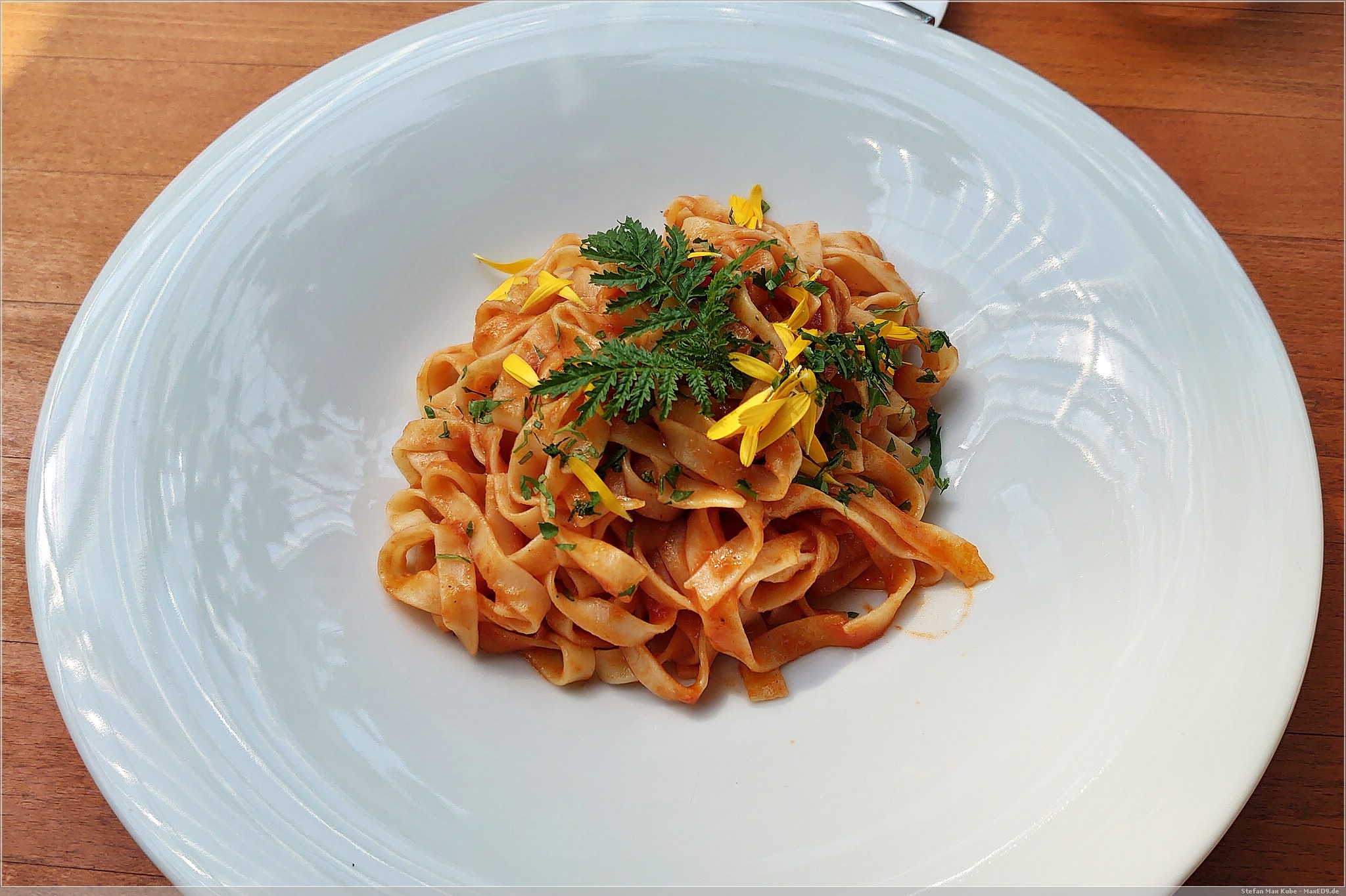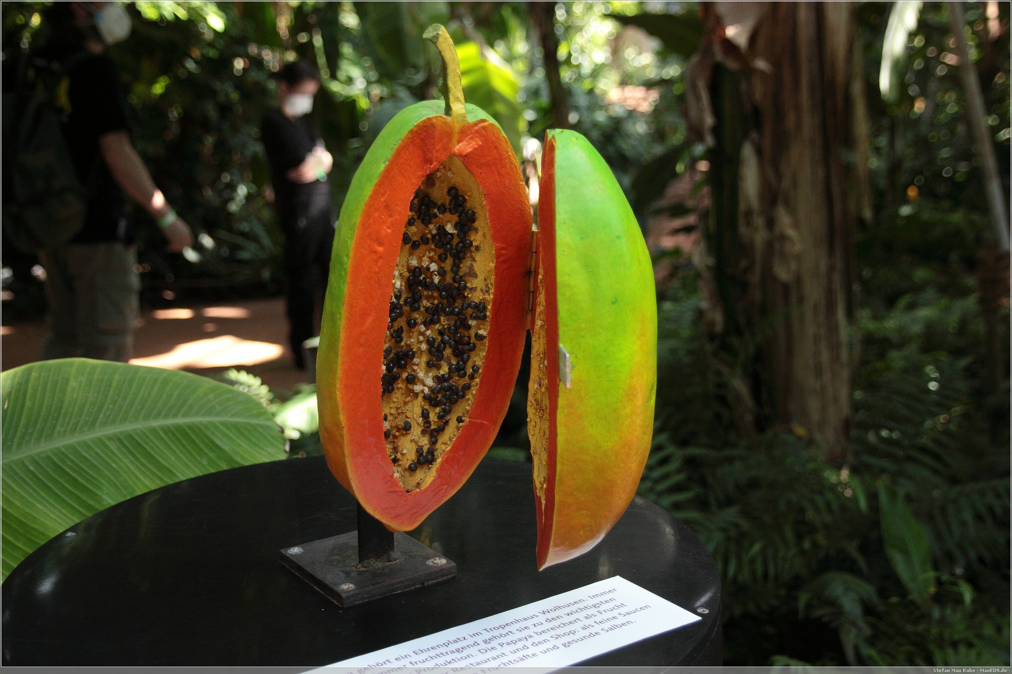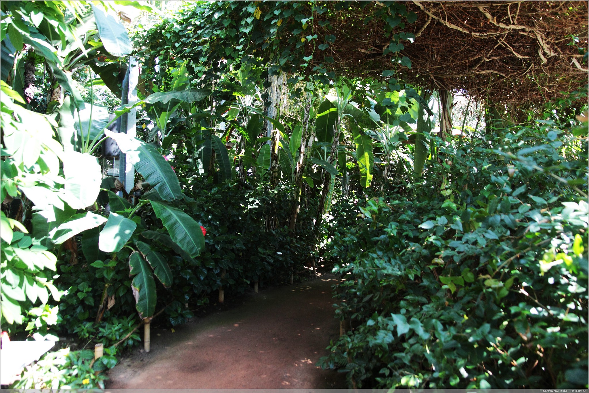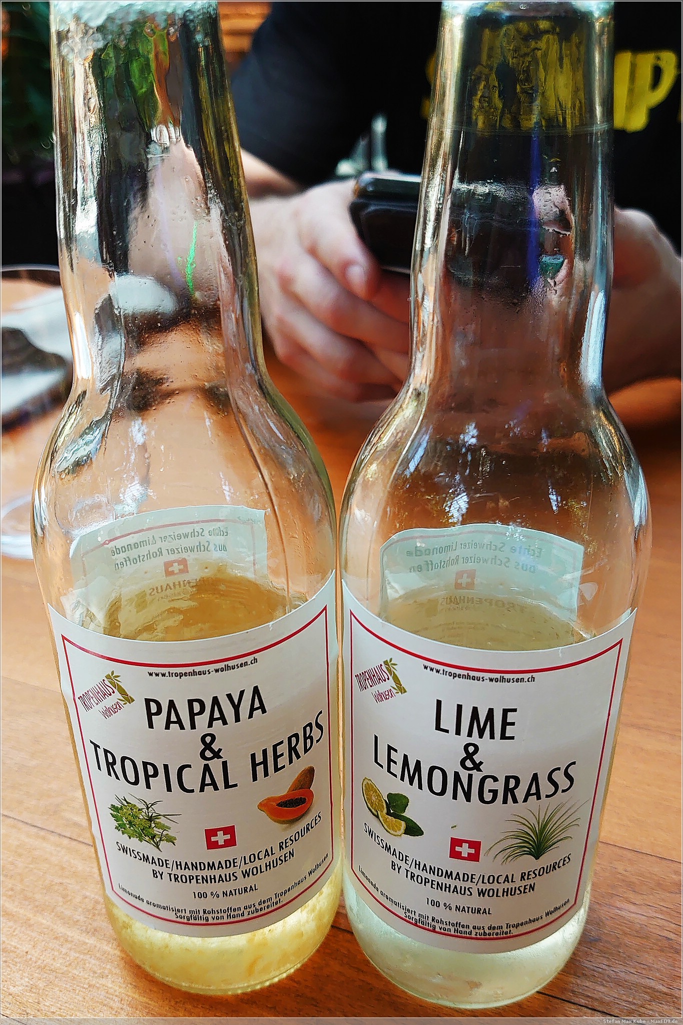 Nach gut 3 Stunden in den künstlichen Tropen, die gar nicht so warm waren, wie es draußen in der Sonne war, hatten wir auch etwas Hunger und so nutzten wir die Gelegenheit das direkt im Tropenhaus integrierte Resataurant zu nutzen. Unter Palmen sitzend werden hier Getränke und frisch zubereitete Speisen angeboten, welche ganz oder teilweise auch Zutaten aus den angebauten Pflanzen enthalten.