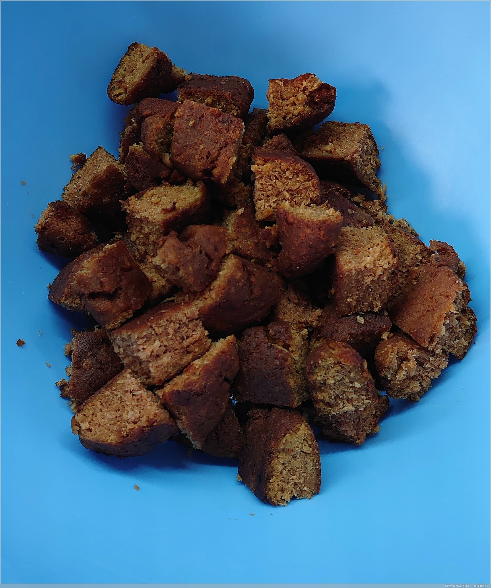 Ansonsten Buletten wie gewohnt zubereiten, braten, kalt werden lassen und in kleinere Stückchen zerteilen.