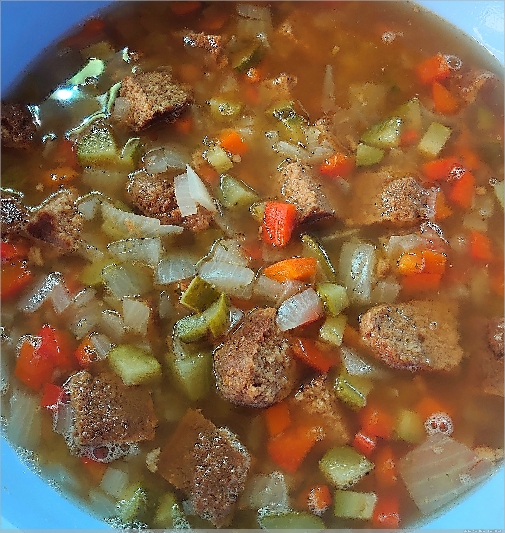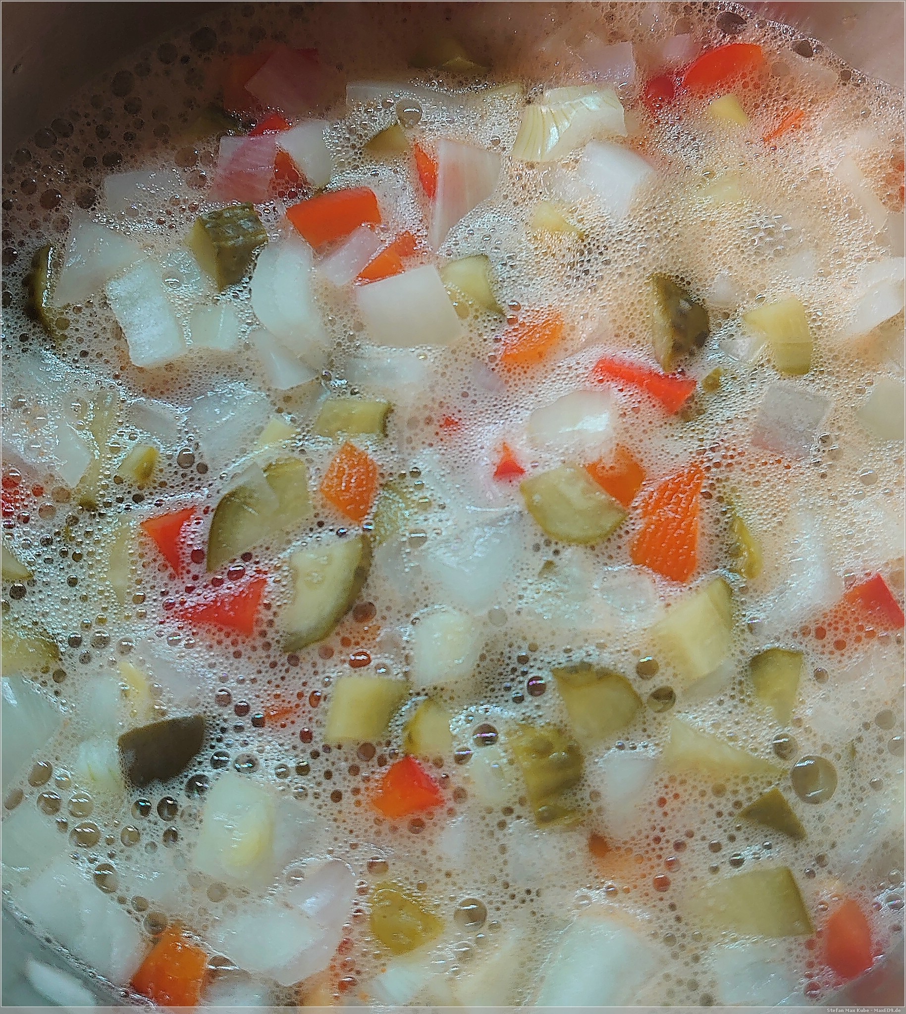 Zwiebeln, Knoblauch, Paprika und Gurken klein schneiden und in etwas Wasser aufkochen und 2-3 Minuten köcheln lassen. Die Brühe zum kochen bringen, dann die Zwiebeln, Knoblauch, Paprika und Gurken dazugeben, mit den Gewürzen abschmecken und noch etwas (Gurken-)Essig nach Belieben dazugeben.