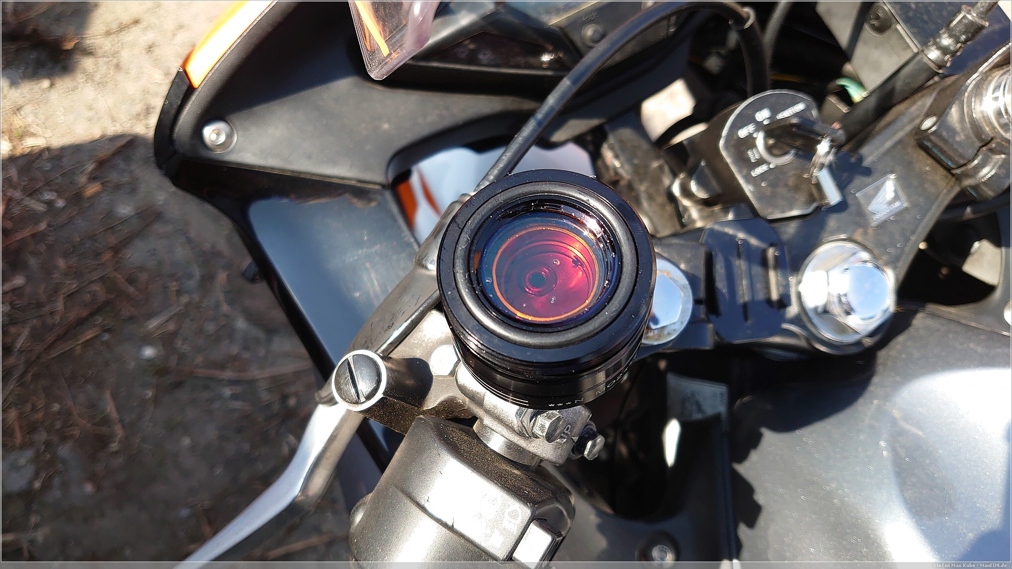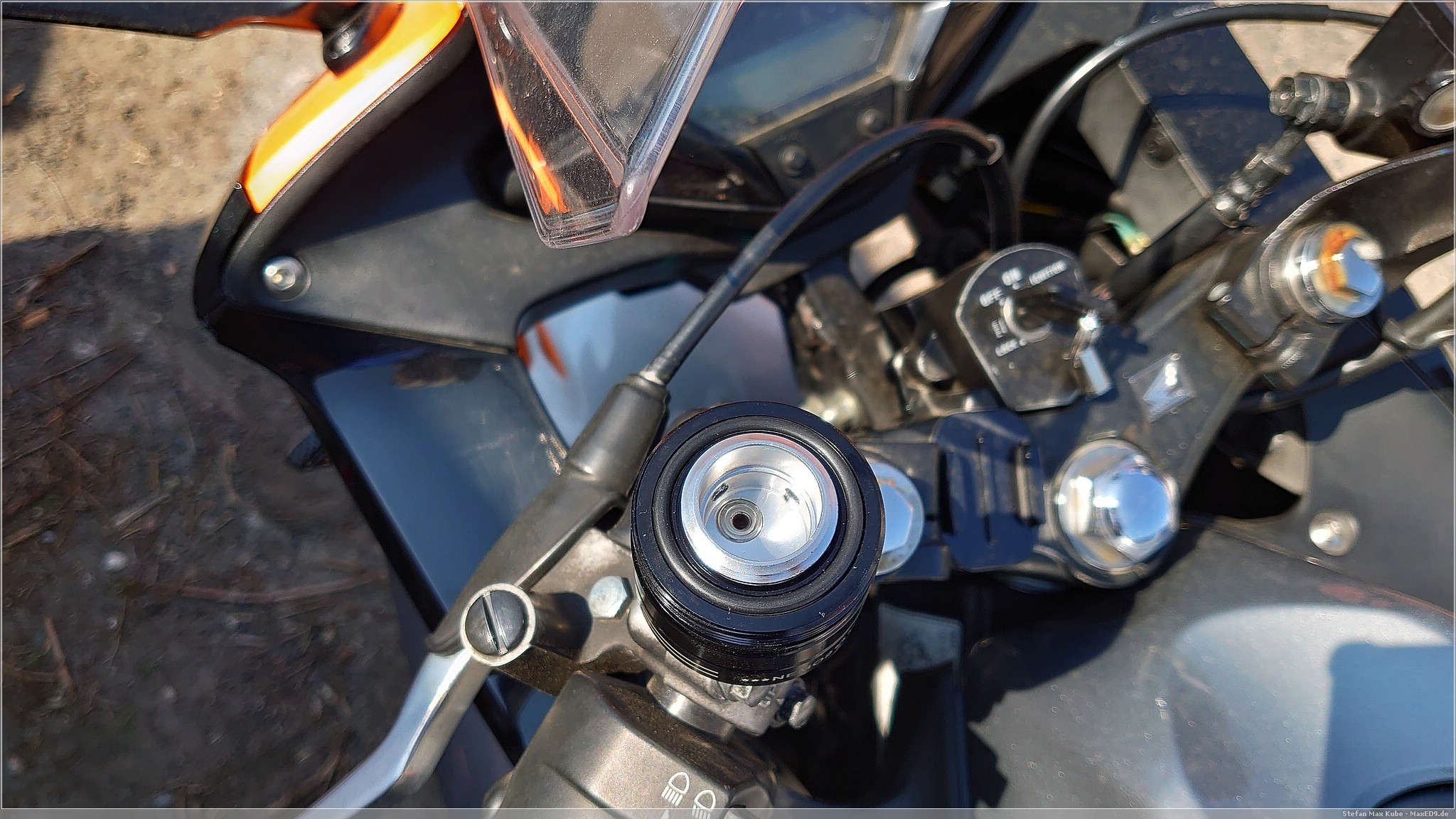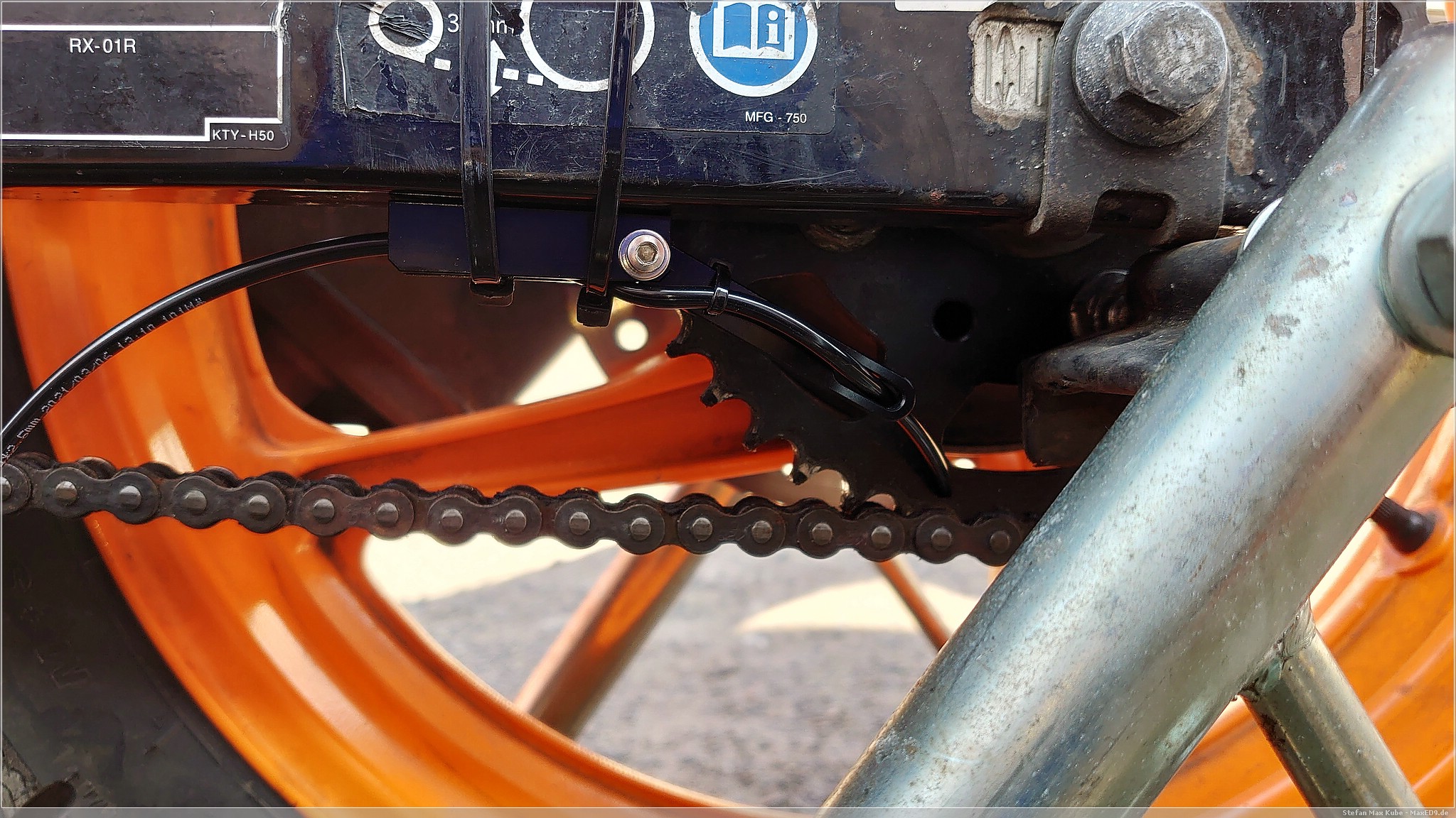 Den Tropfaustrittsöffnung habe ich, entgegen der Beschreibung, auf das Kettenblatt gerichtet. So ist dies auch bei der Scottoilermontage empfohlen. Vorteil, das Öl tropft nicht einfach runter, sondern kriecht entlang das Kettenblatts in die Kette. Den Schlauch habe ich dann entlang der Schwinge hinter den Drehpunkt gelegt und dann wurde es etwas knifflig wegen der Verkleidung, aber mit etwas Geduld und Fingerspitzengefühl konnte ich ohne Demontage den Förderschlauch bis zum Lenker verlegen.