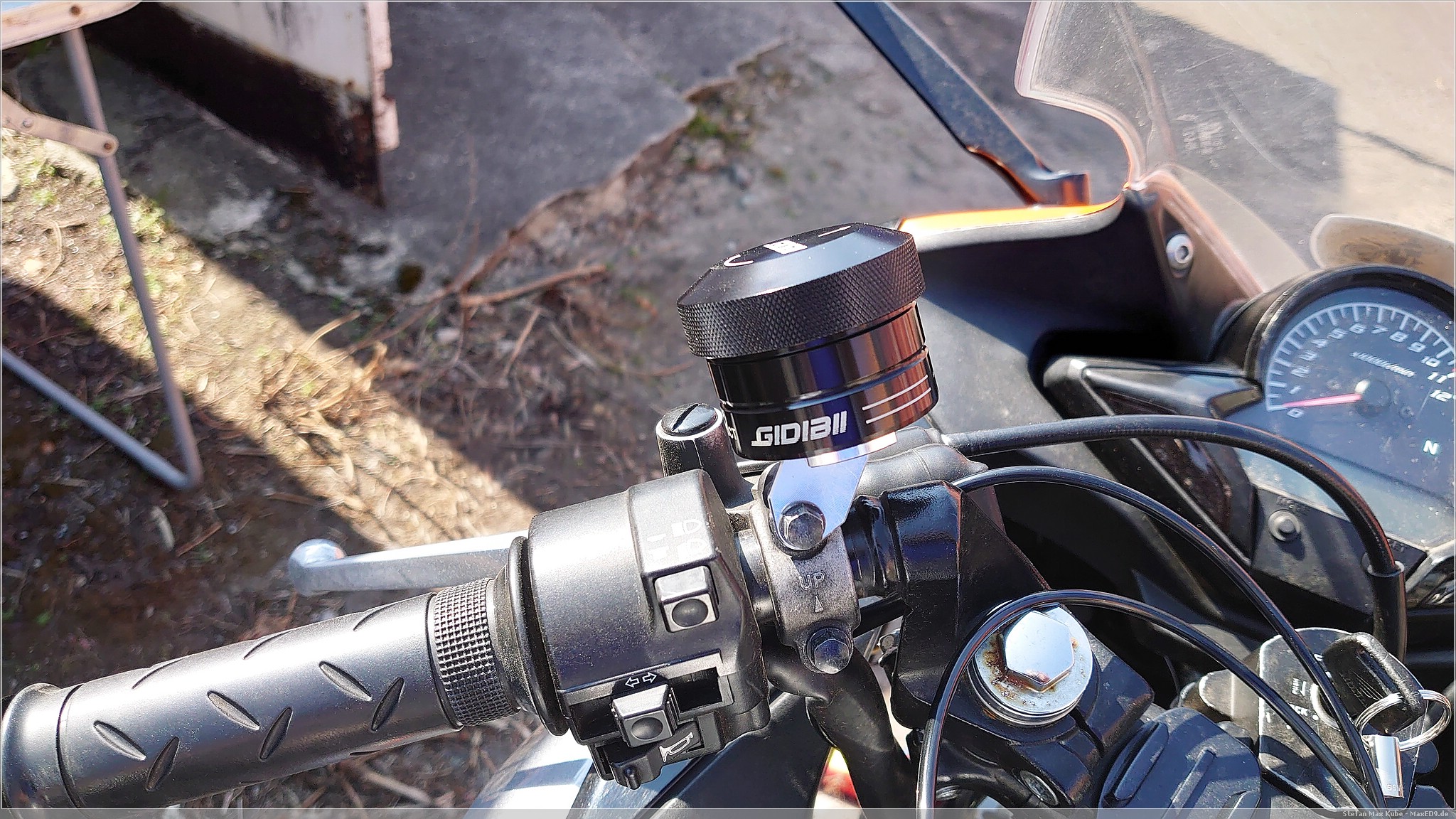 Den Behälter habe ich an der Kupplungshebelschelle montiert. Die Montagelasche musste ich etwas biegen, damit der Behälter halbwegs Waagerecht in der Geradeausposition steht. Das vereinfacht das Befüllen ungemein. Nun kann der Schlauch noch entsprechend gekürzt und unten am Behälter eingeschoben werden.