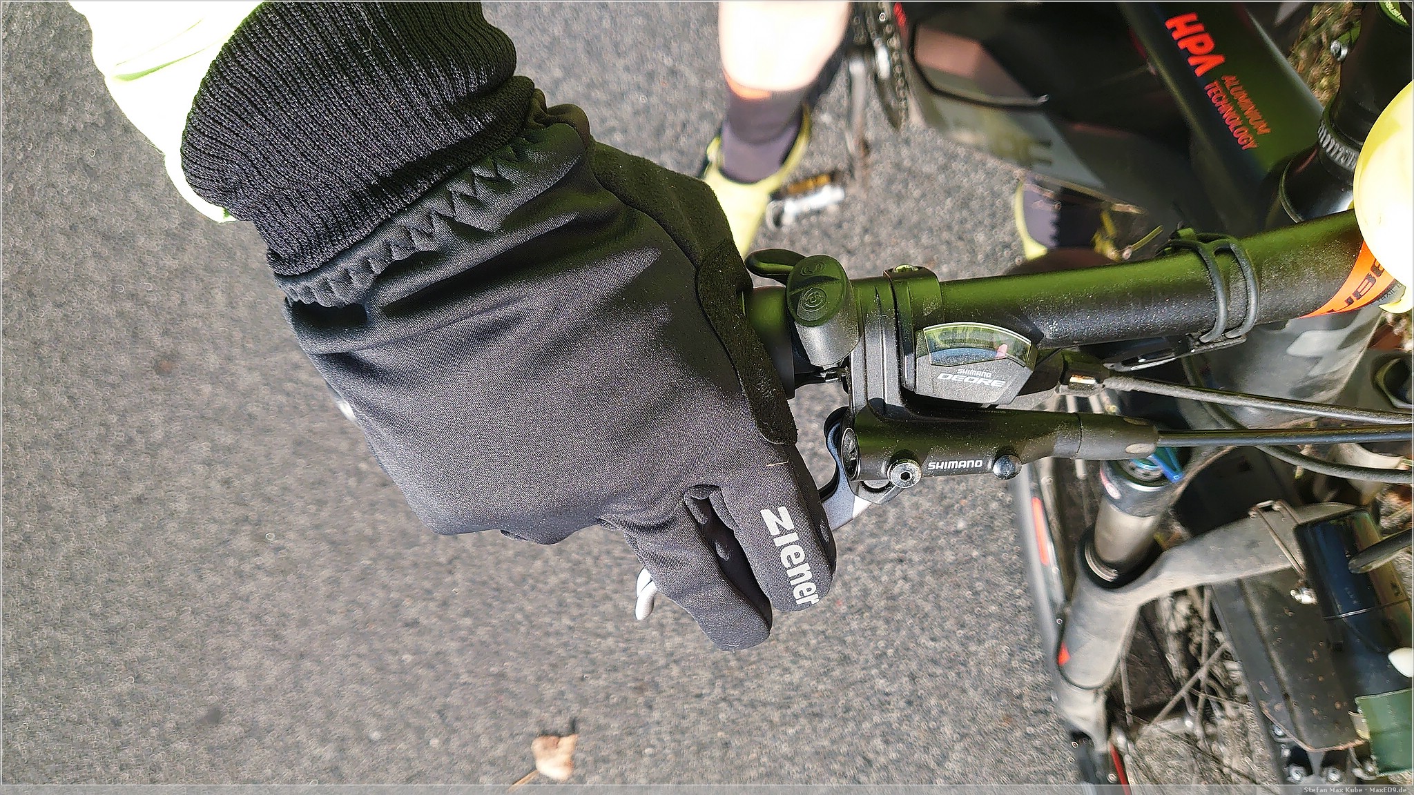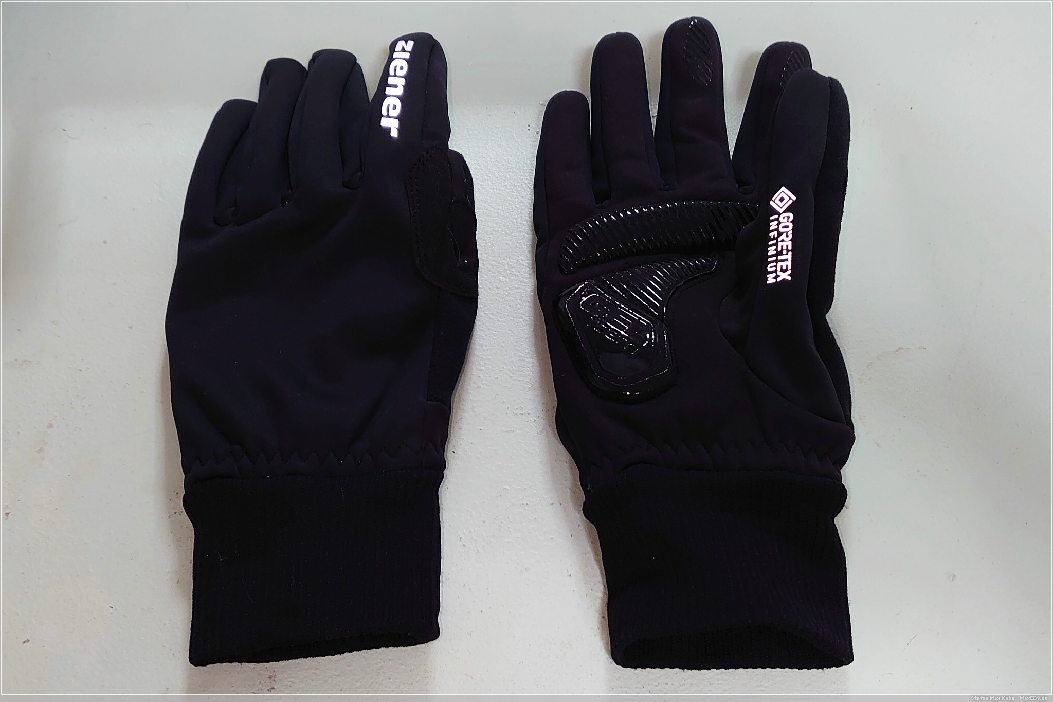 Ganz neu im Kleiderschrank sind die Ziener 414 Infinium mit Goretex[2]. Ähnlich dünn wie die Sealskinz, aber fühlen sich ein wenig wärmer an, beim Anziehen. Das Bündchen ist zwar weich, aber auch ein Designfehler. Während der Handschuh dank Goretex doch lange wasserdicht ist, ist das Stoffbündchen ein Wassermagnet, einmal vollgesaugt wird auch der Handschuh innen nass. Also Bündchen unter den Ärmel fummeln und keine Lücke lassen.