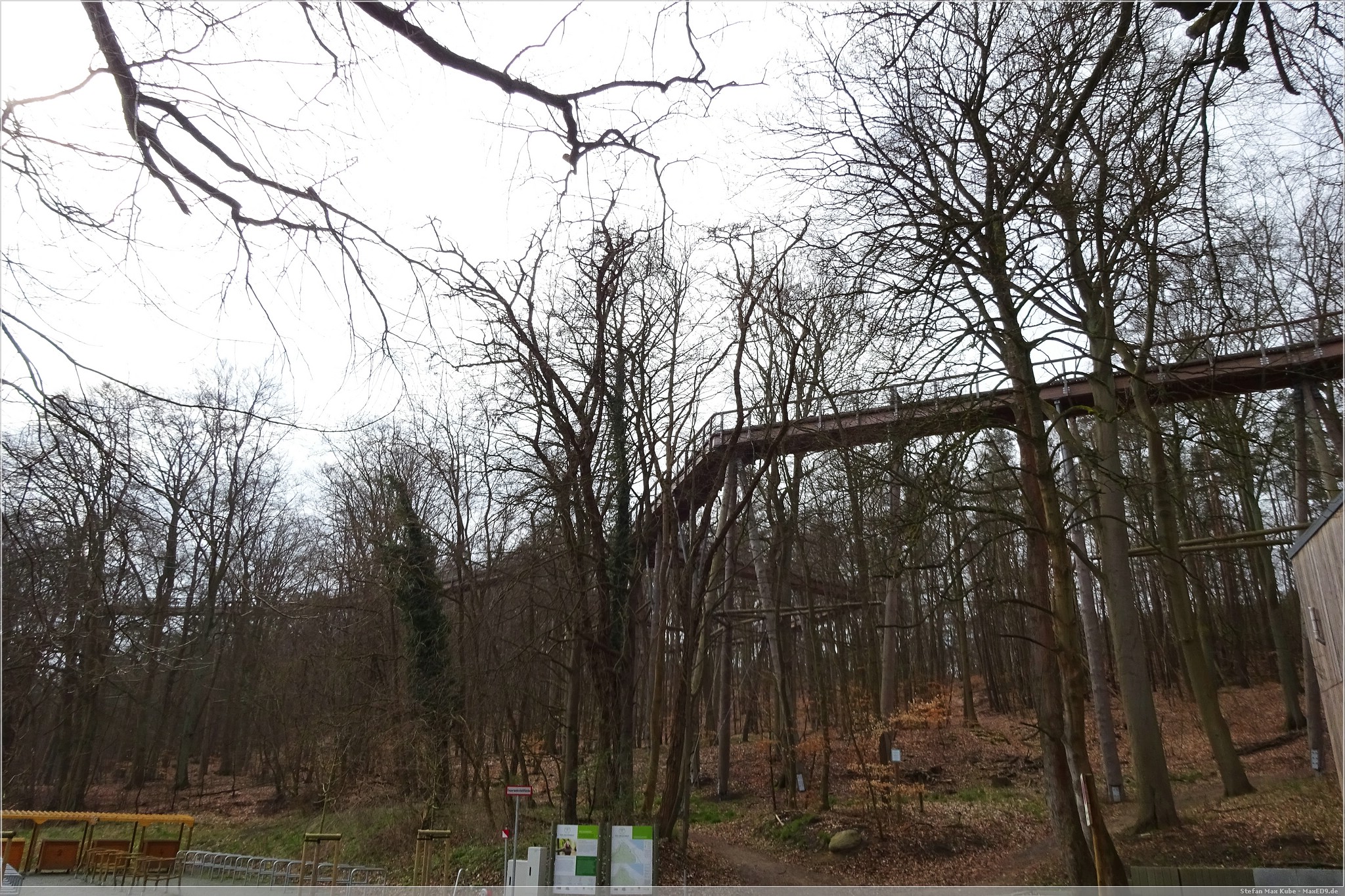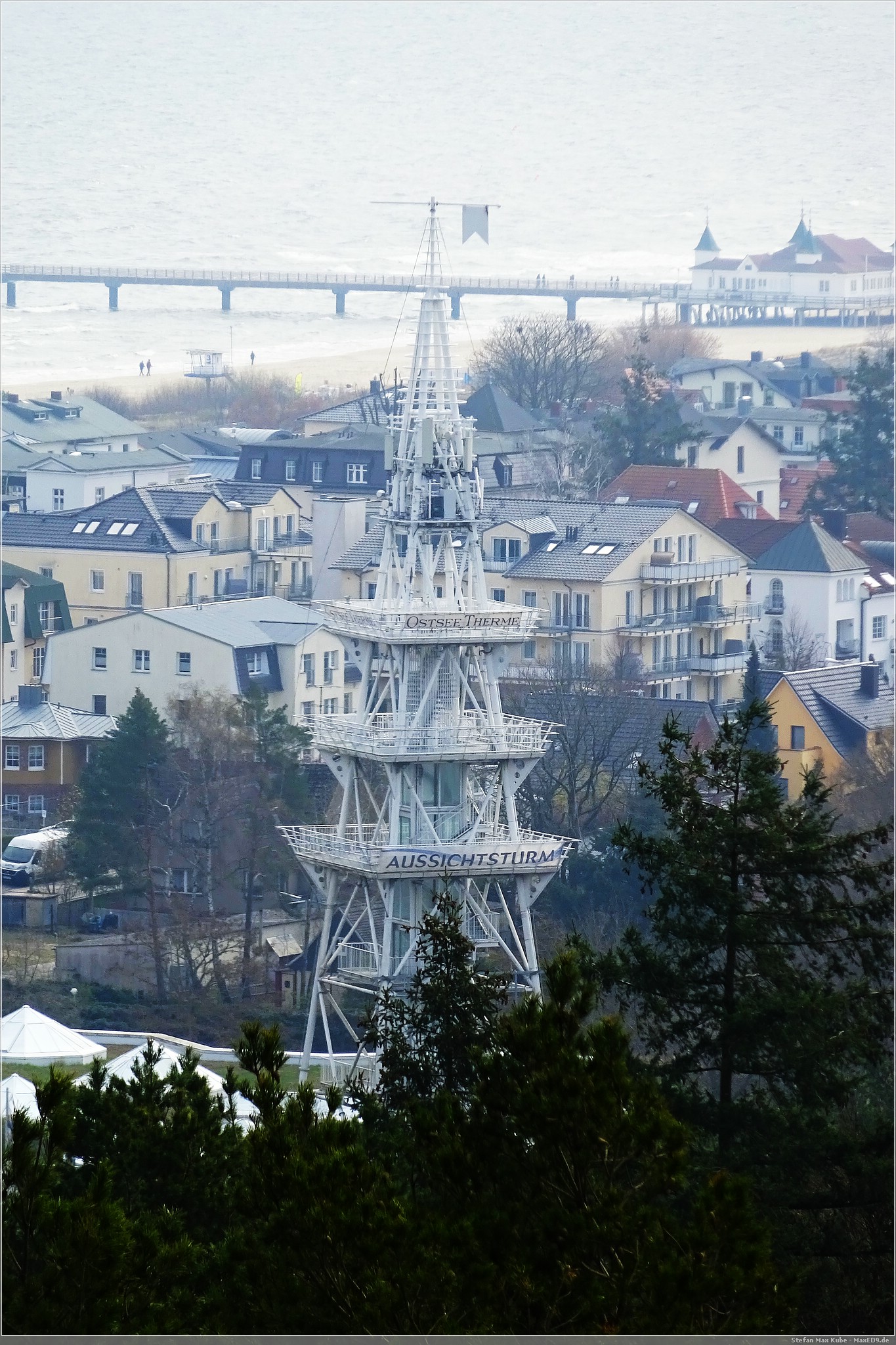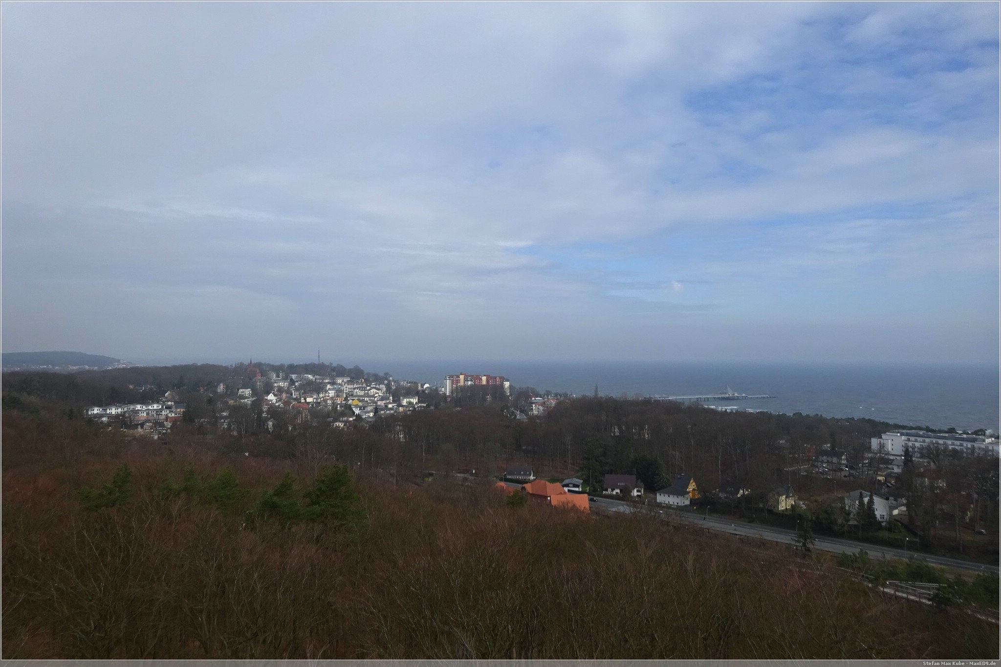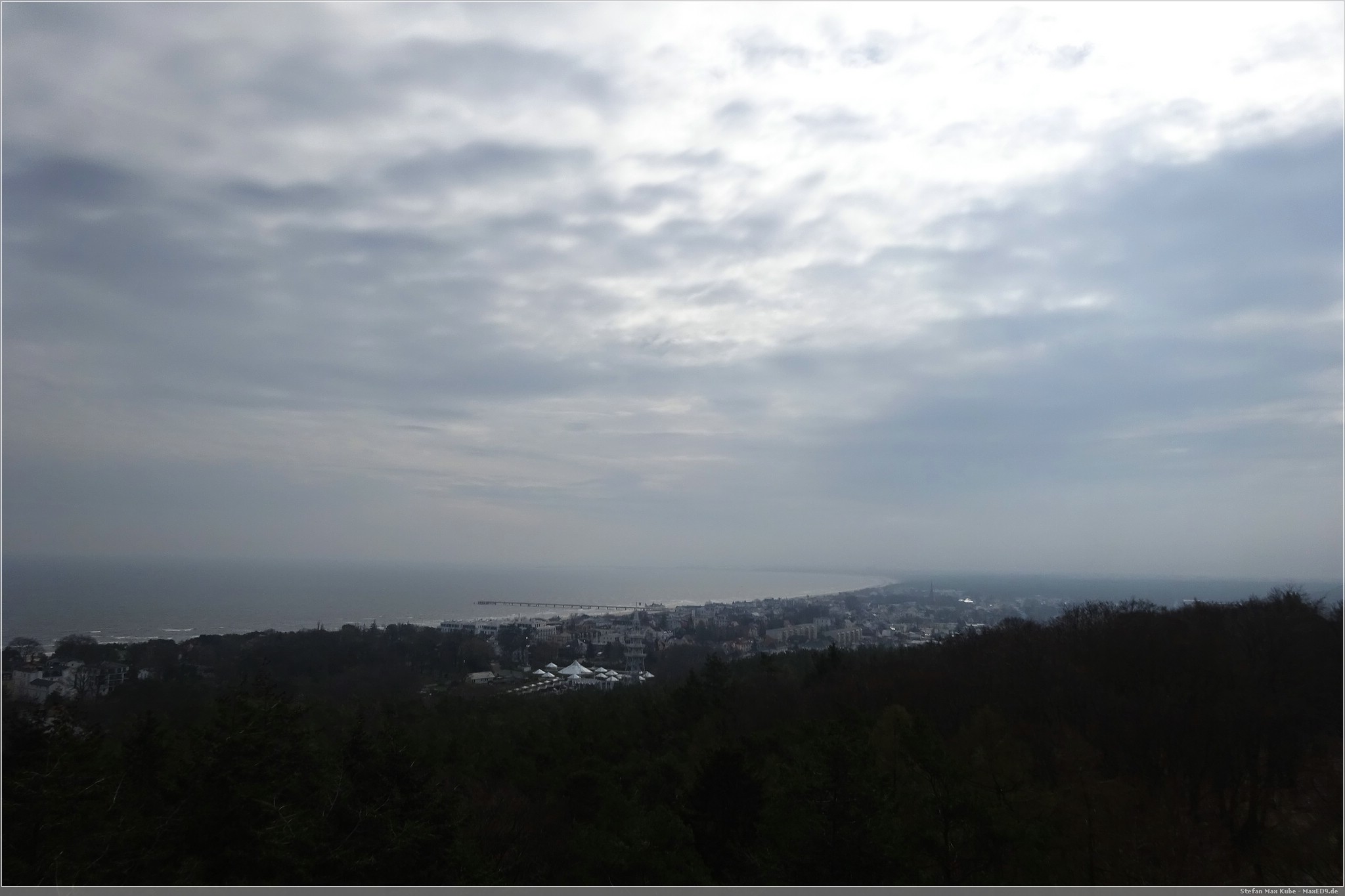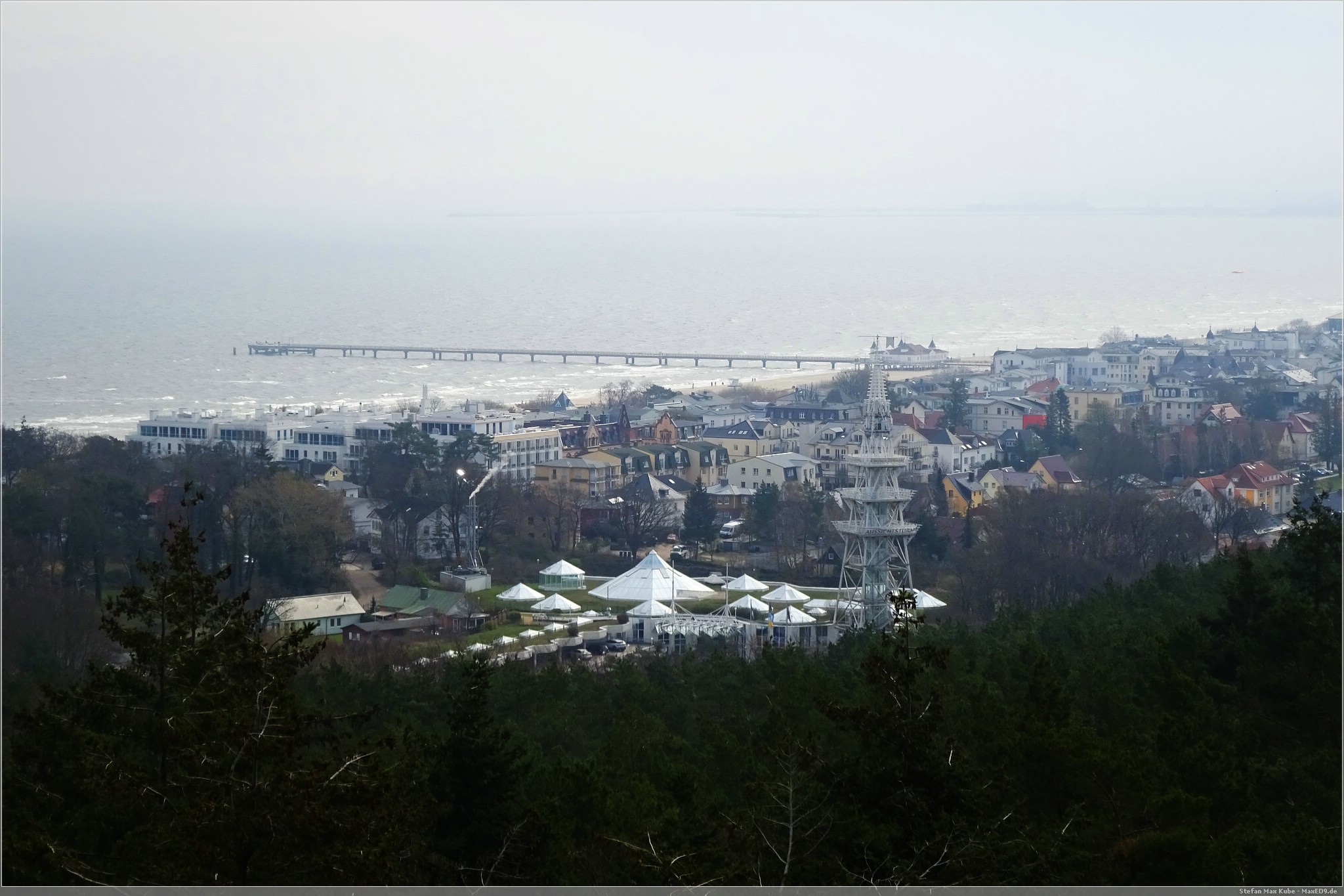 Hier thront der Baumwipfelpfad Heringsdorf[1] über dem Ort und da auch die Sonne schien, war das eine gute Gelegenheit, hier einmal die Aussicht zu genießen. Der hölzerne Pfad ist rund 1,3 km lang und auf bis zu 23 m Höhe. Schon von hier hat man einen wunderbaren Blick über Usedom und auf die Ostsee.