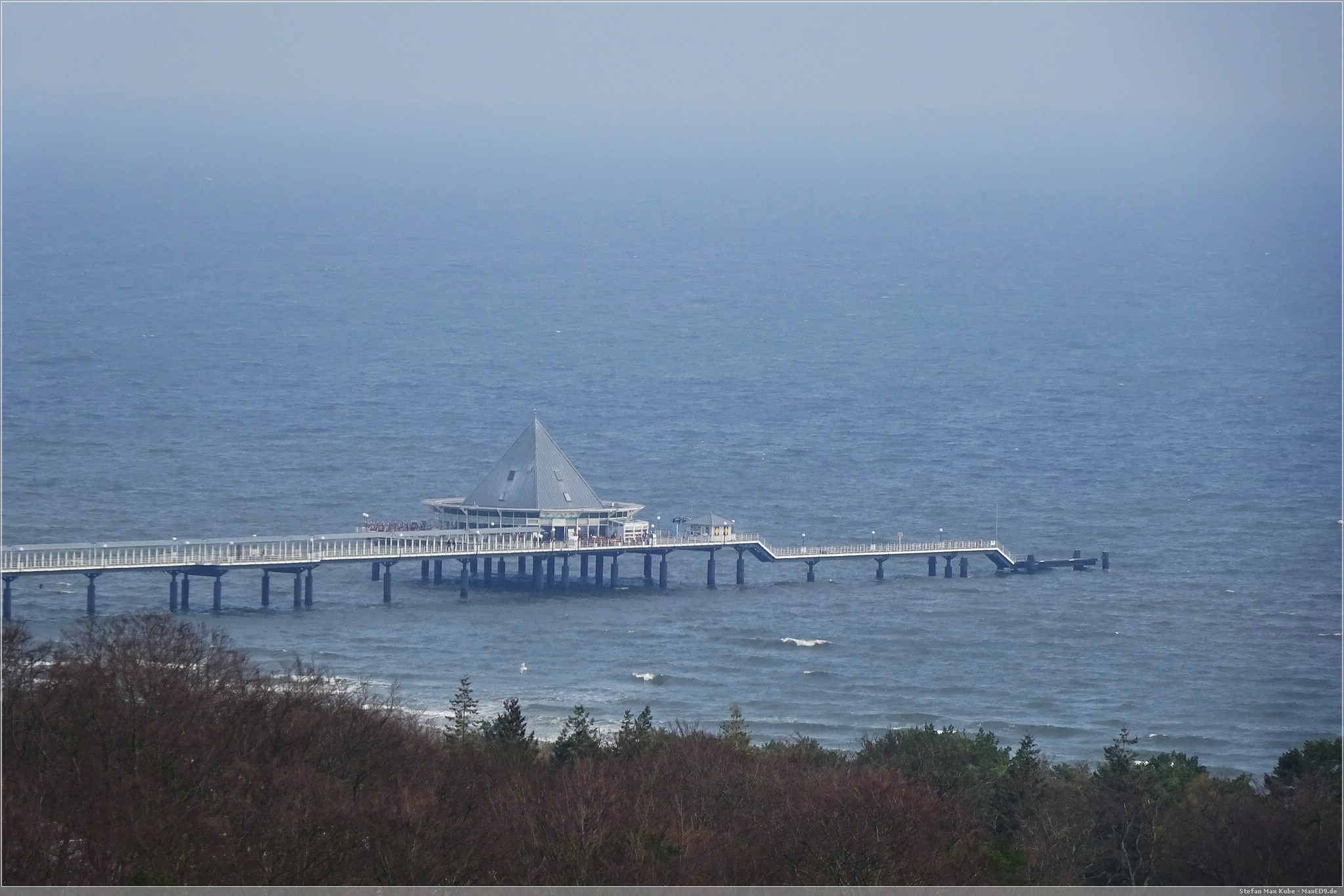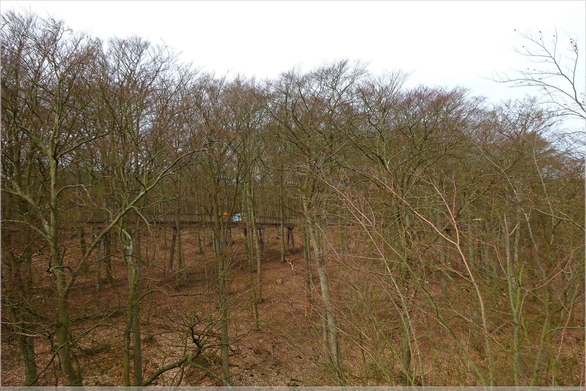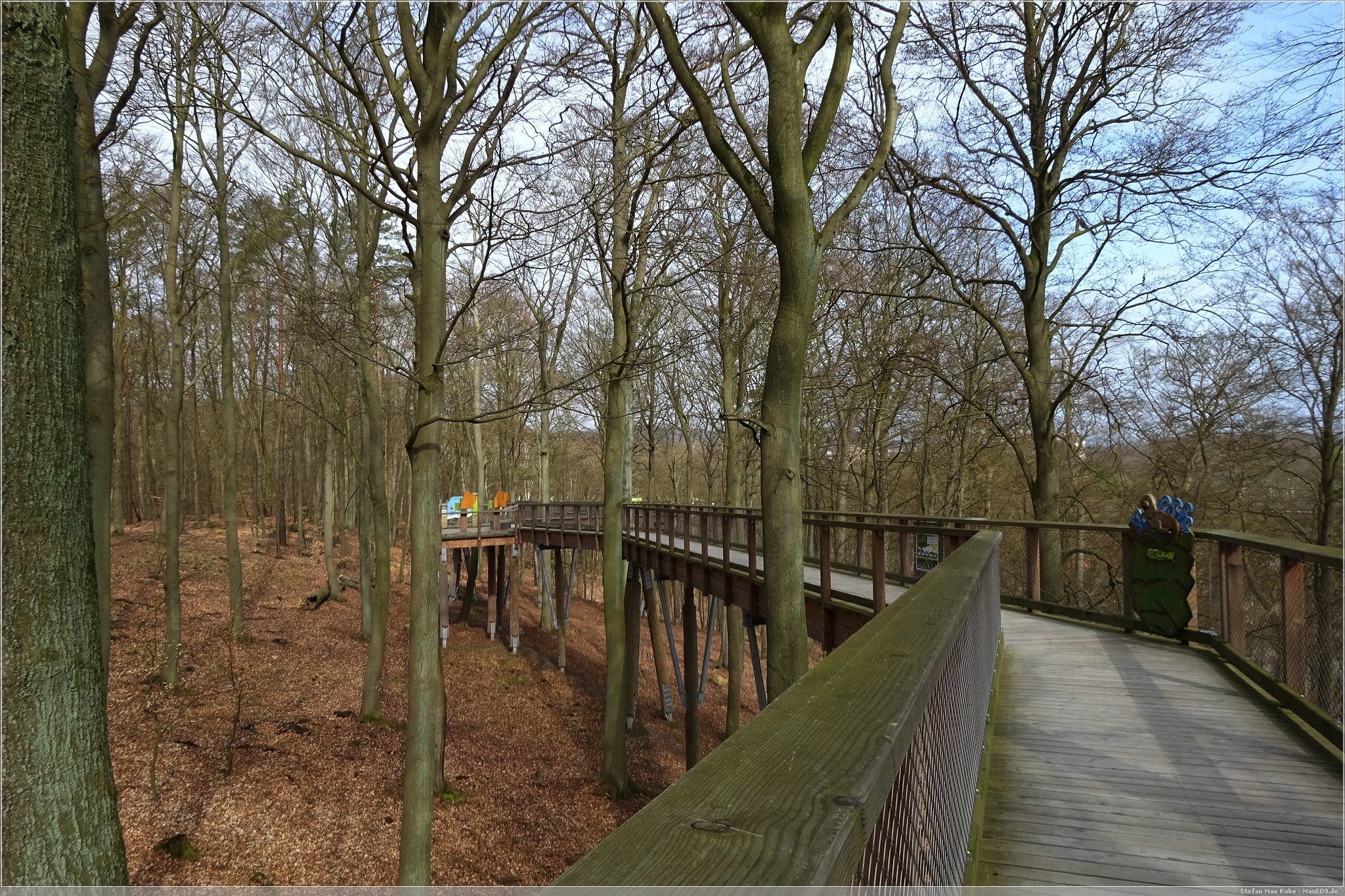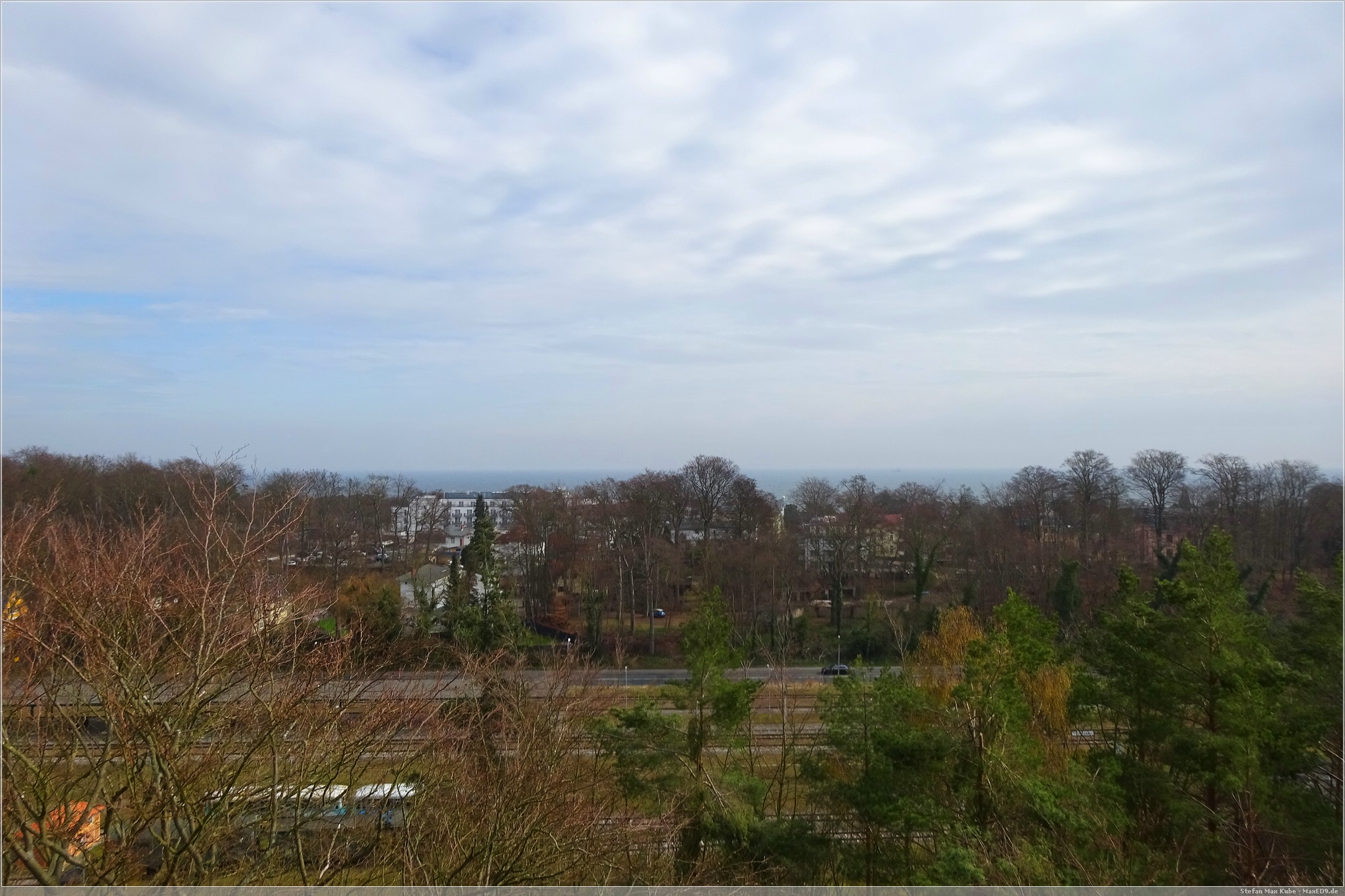 Hier thront der Baumwipfelpfad Heringsdorf[1] über dem Ort und da auch die Sonne schien, war das eine gute Gelegenheit, hier einmal die Aussicht zu genießen. Der hölzerne Pfad ist rund 1,3 km lang und auf bis zu 23 m Höhe. Schon von hier hat man einen wunderbaren Blick über Usedom und auf die Ostsee.