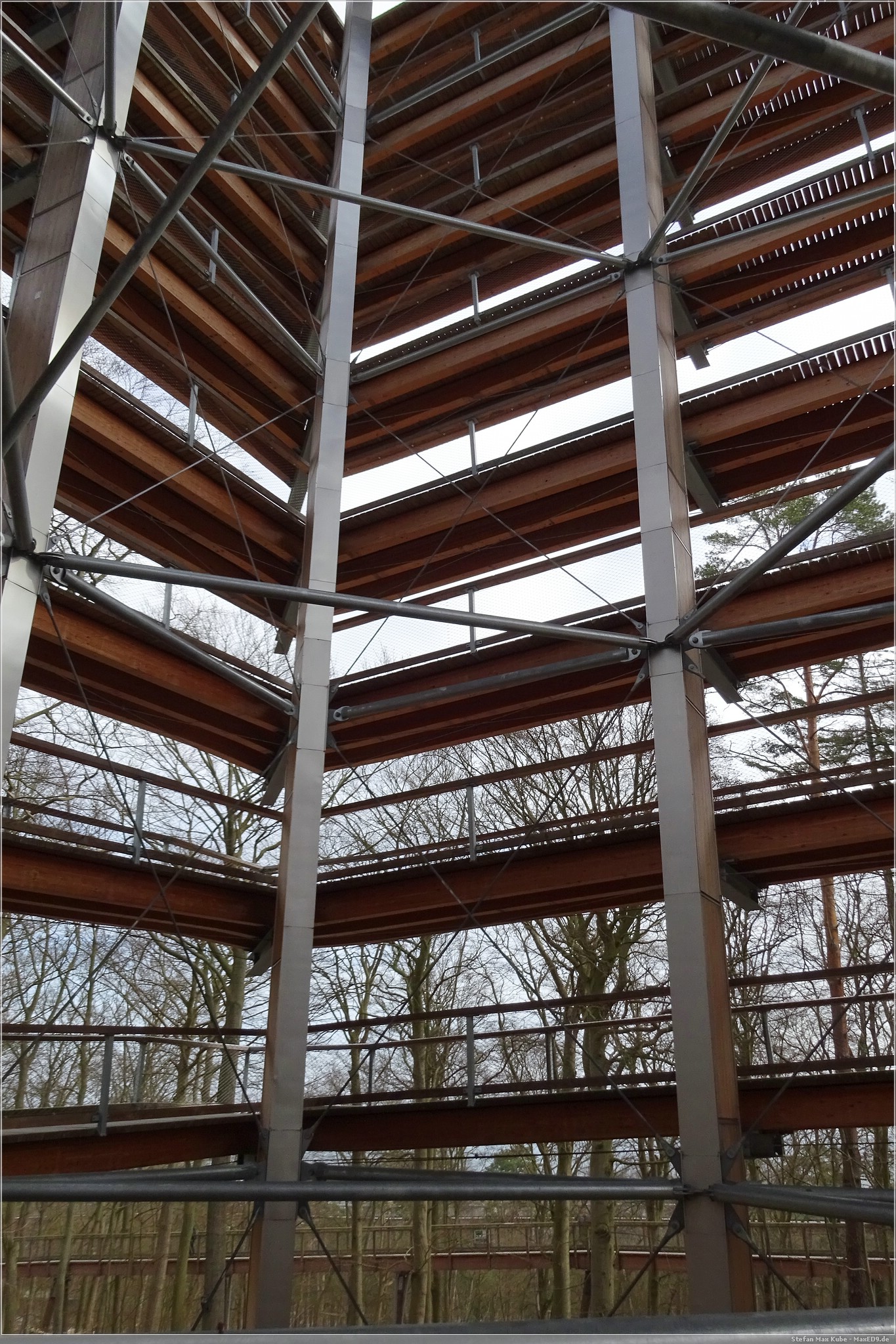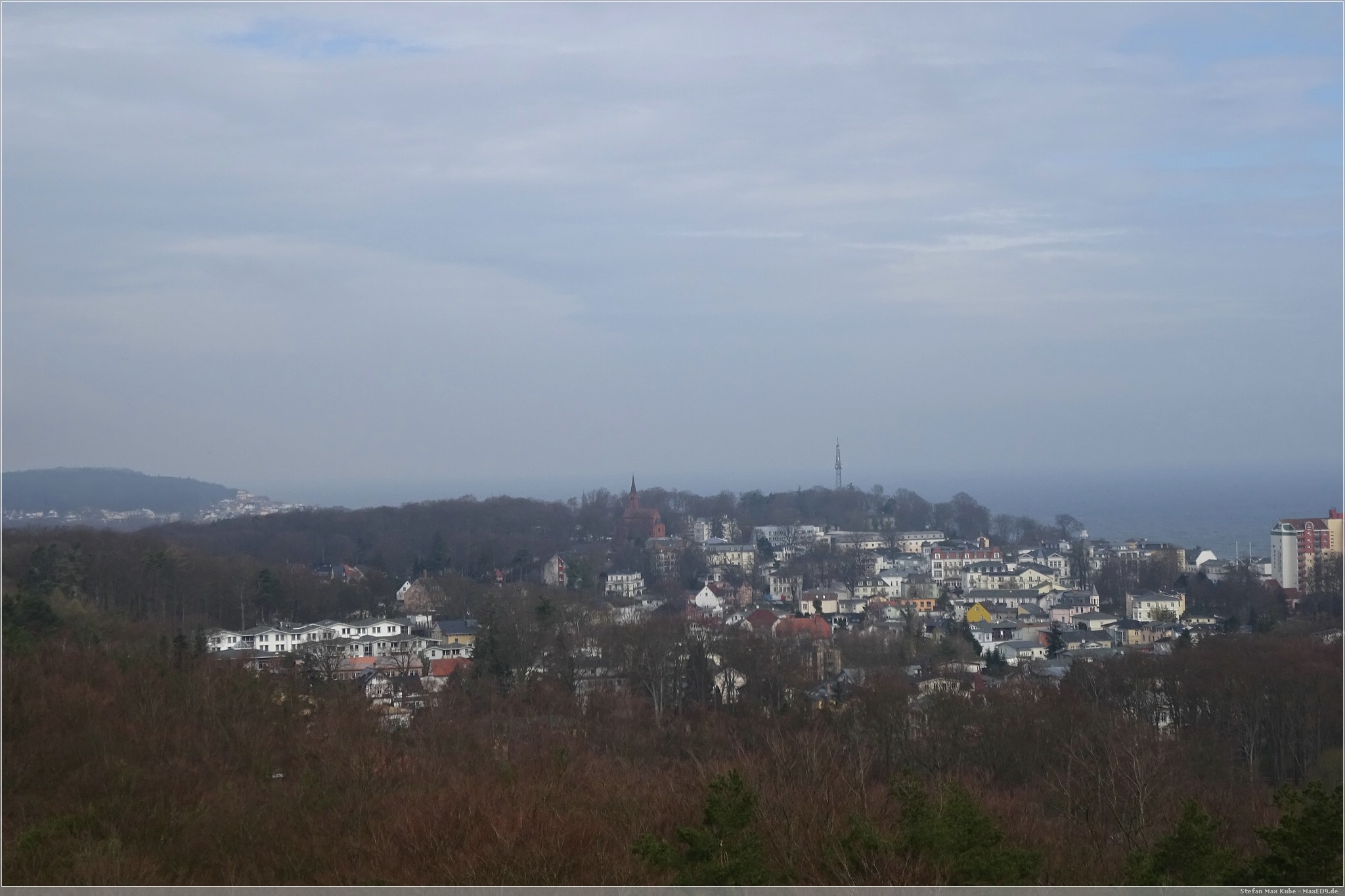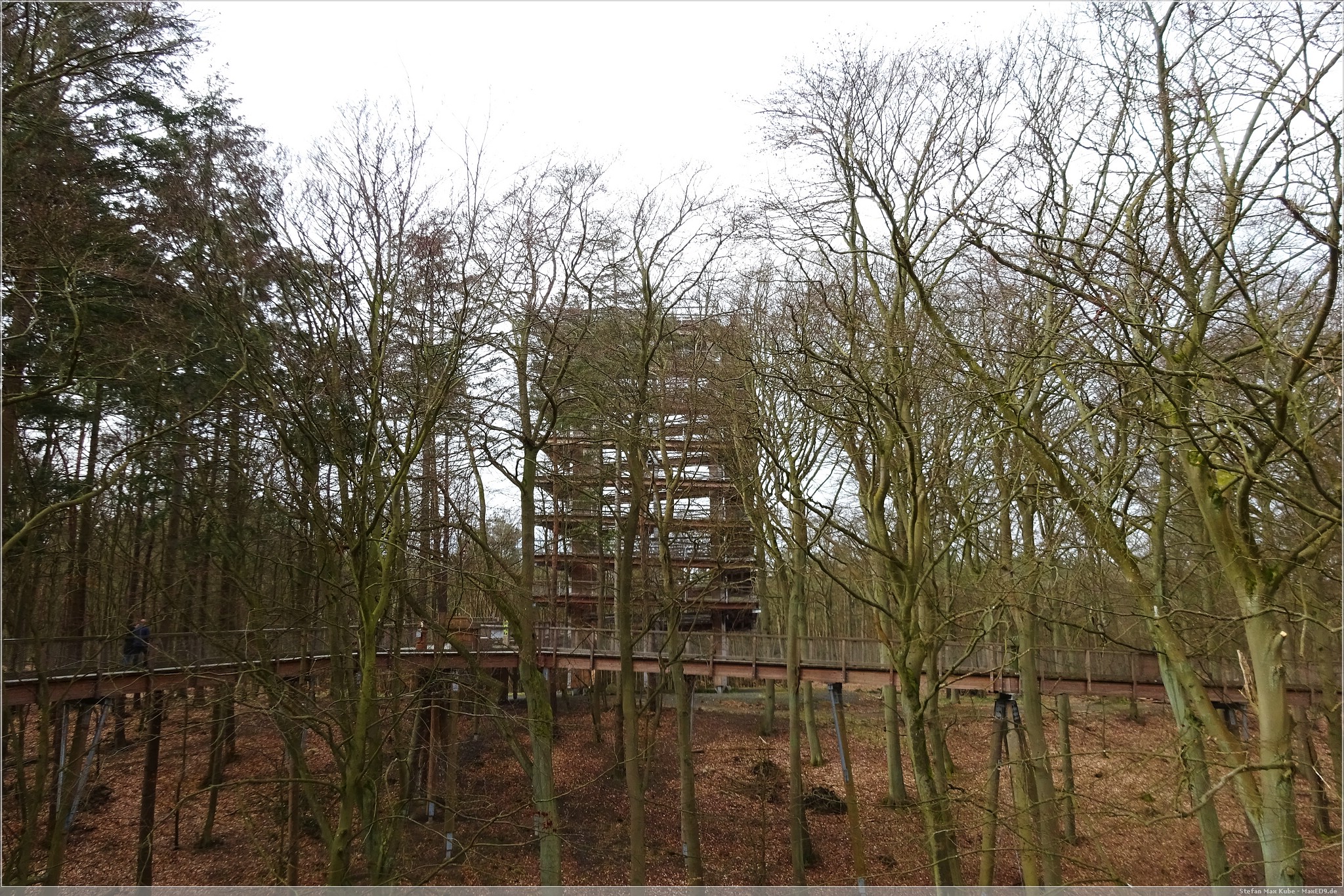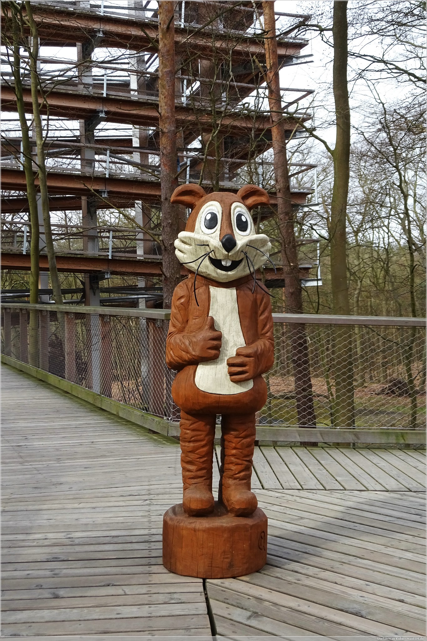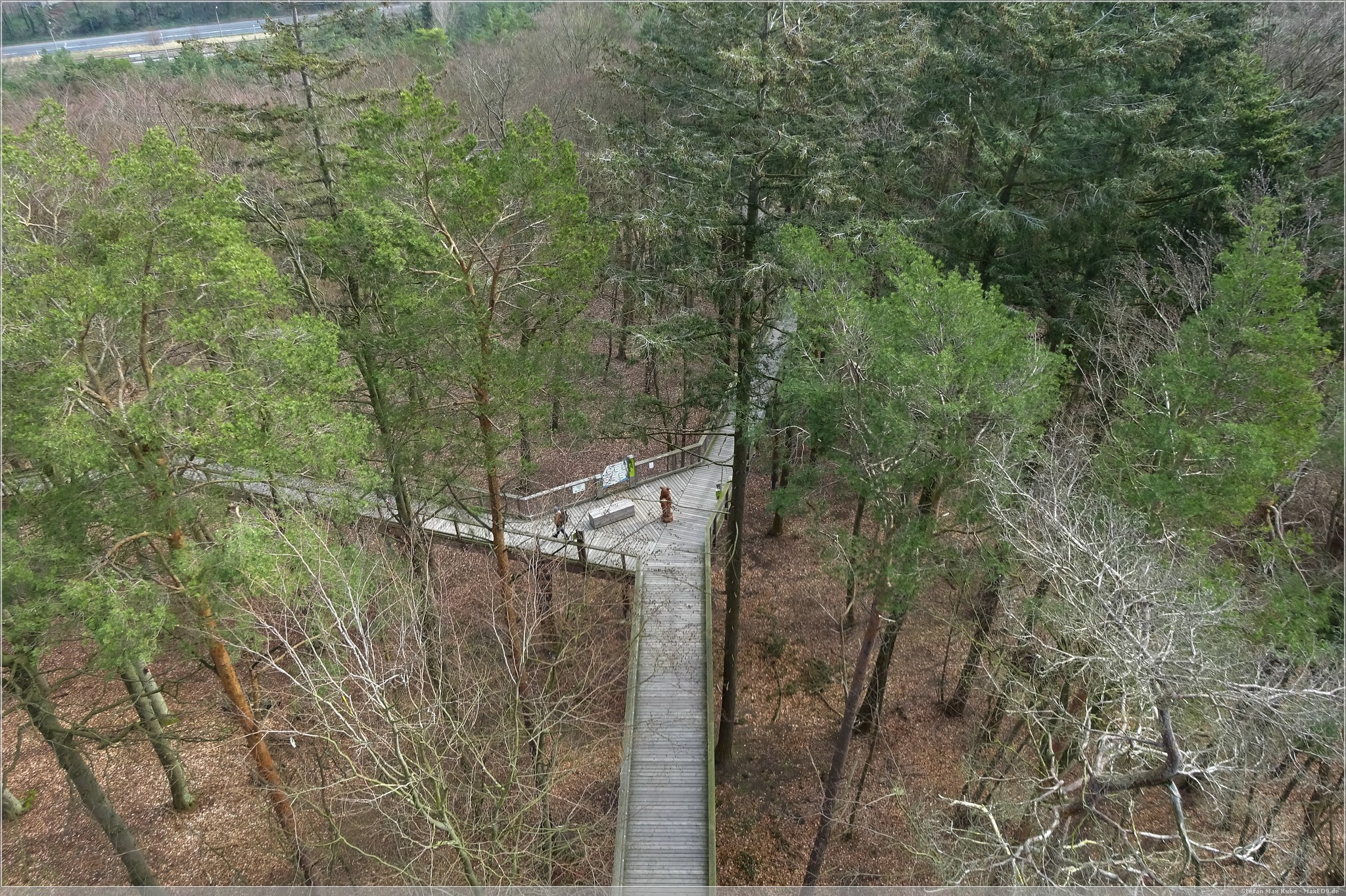 Hier thront der Baumwipfelpfad Heringsdorf[1] über dem Ort und da auch die Sonne schien, war das eine gute Gelegenheit, hier einmal die Aussicht zu genießen. Der hölzerne Pfad ist rund 1,3 km lang und auf bis zu 23 m Höhe. Schon von hier hat man einen wunderbaren Blick über Usedom und auf die Ostsee.