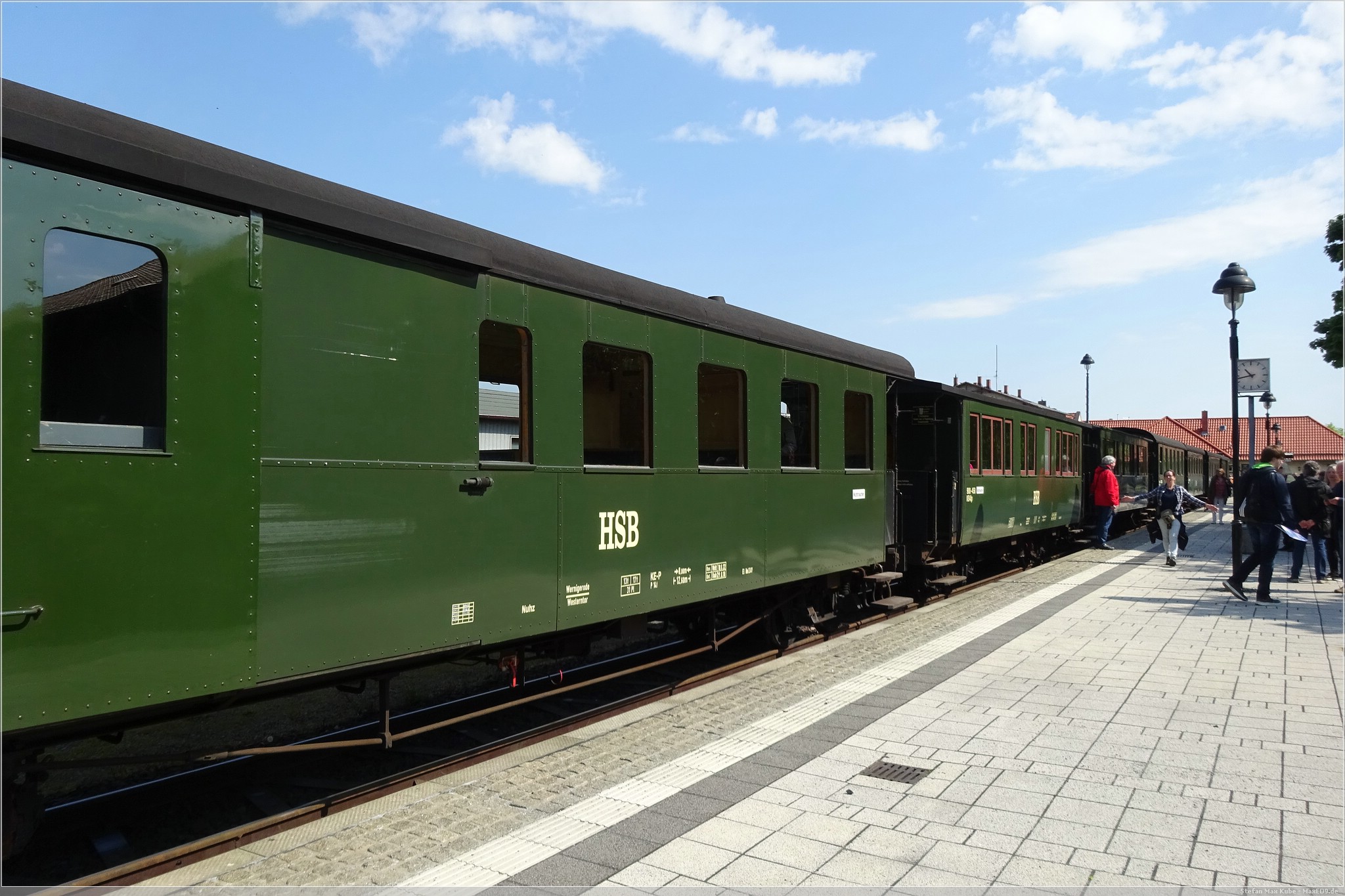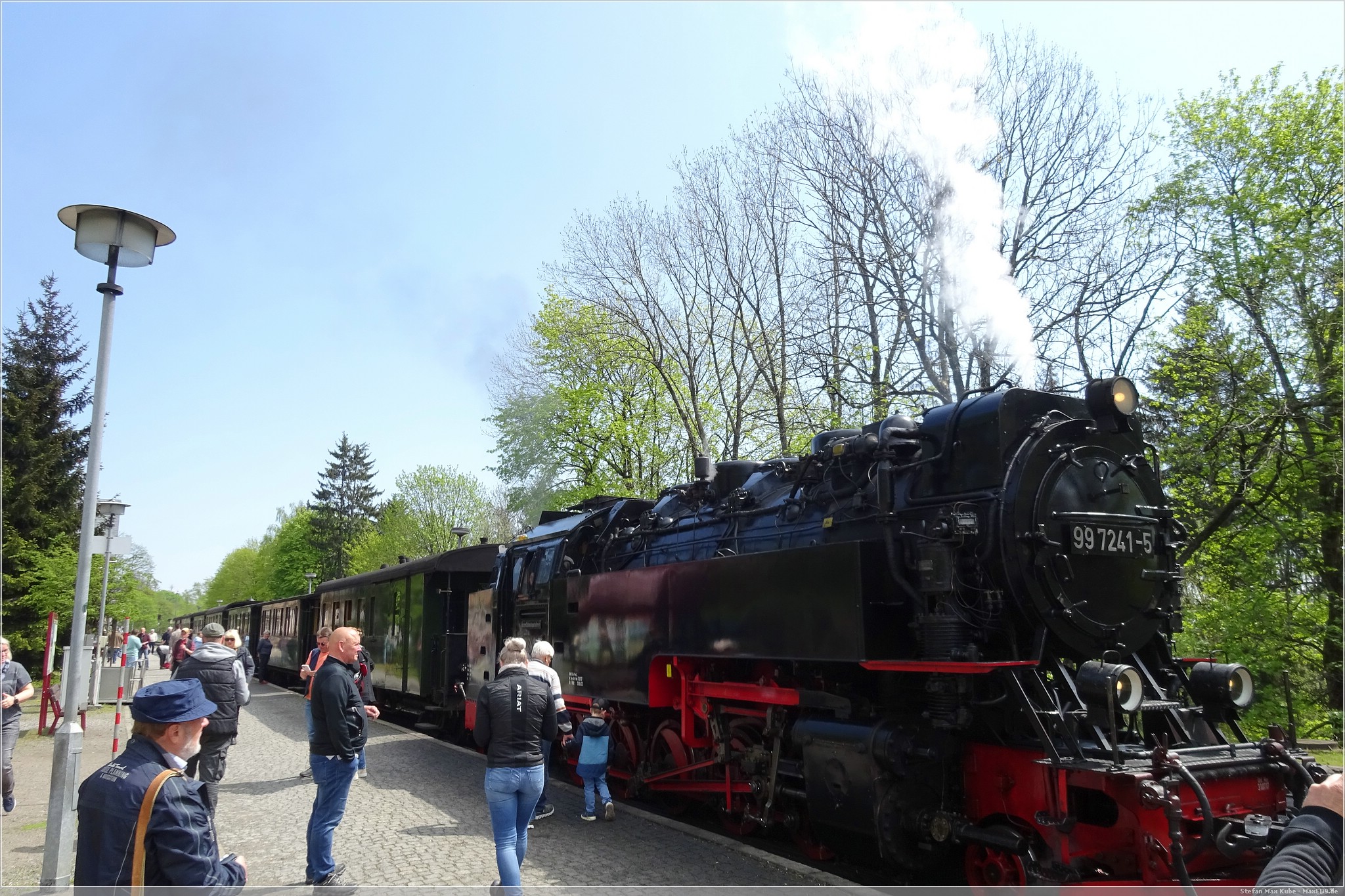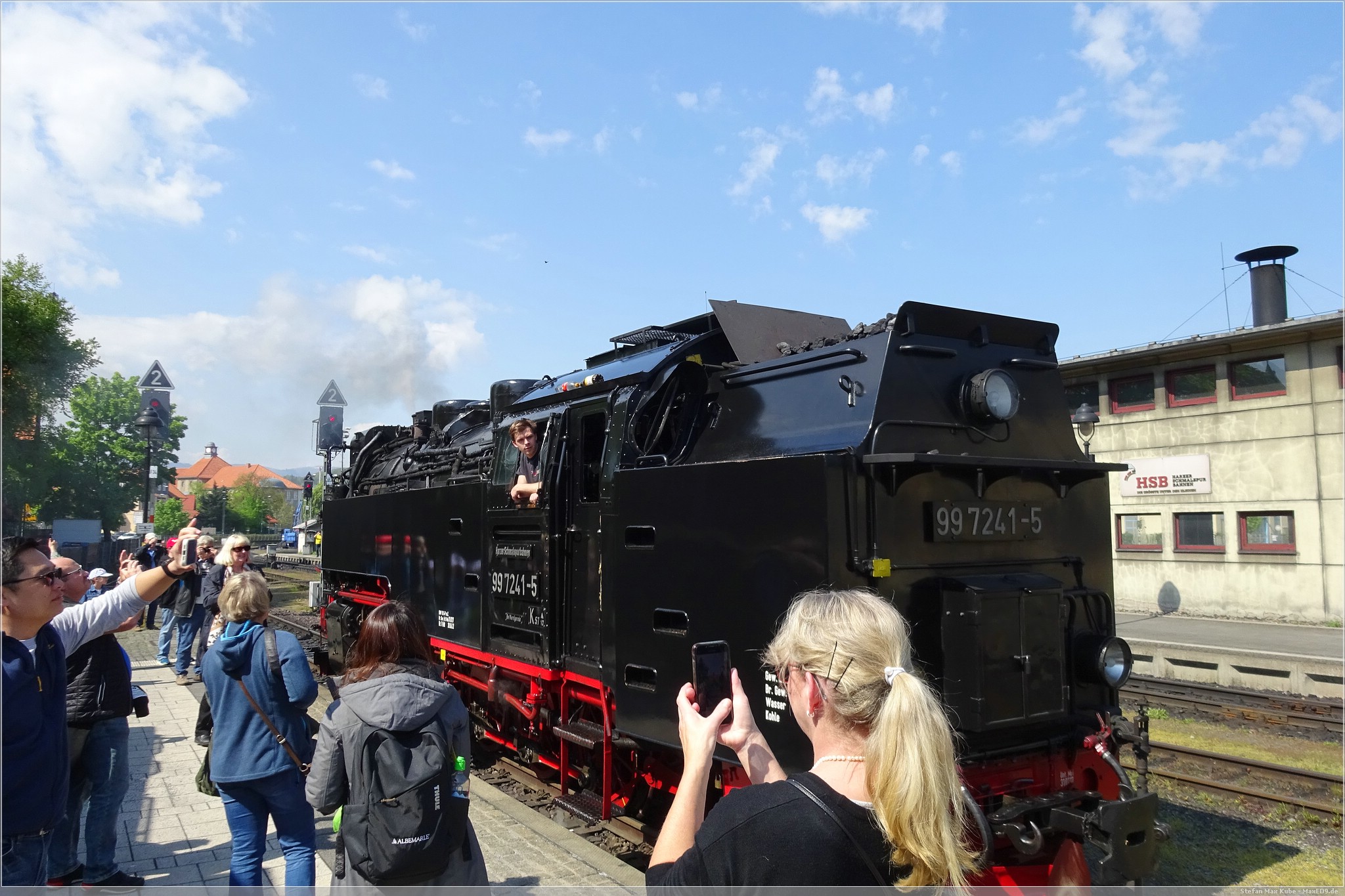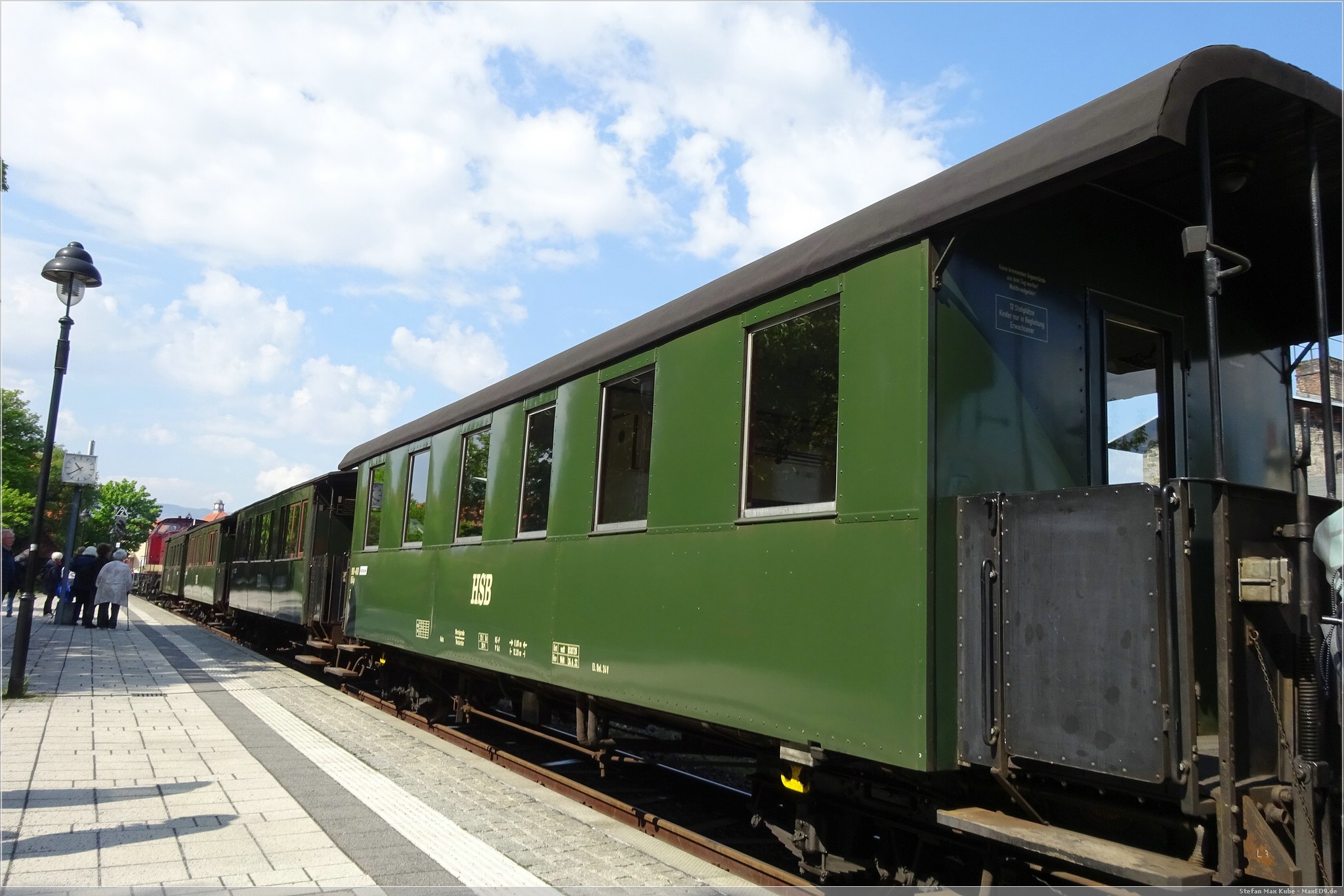 Am Samstagmorgen ging es mir deutlich besser und ich freute mich auf das Frühstück. Frisch gestärkt spazierten wir wieder zum Bahnhof. Auf dem Plan stand die Fahrt mit dem Traditionszug der Harzer Schmalspurbahn. Es war noch viel Zeit und wir konnten daher die Bereitstellung der Dampflokomitven und Bespannung des Linienverkehrs beobachten. Ich nutzte die Gelegenheit auch noch für einen virtuellen Cache[3], bevor es für uns hieß: „Bitte alles einsteigen!“.