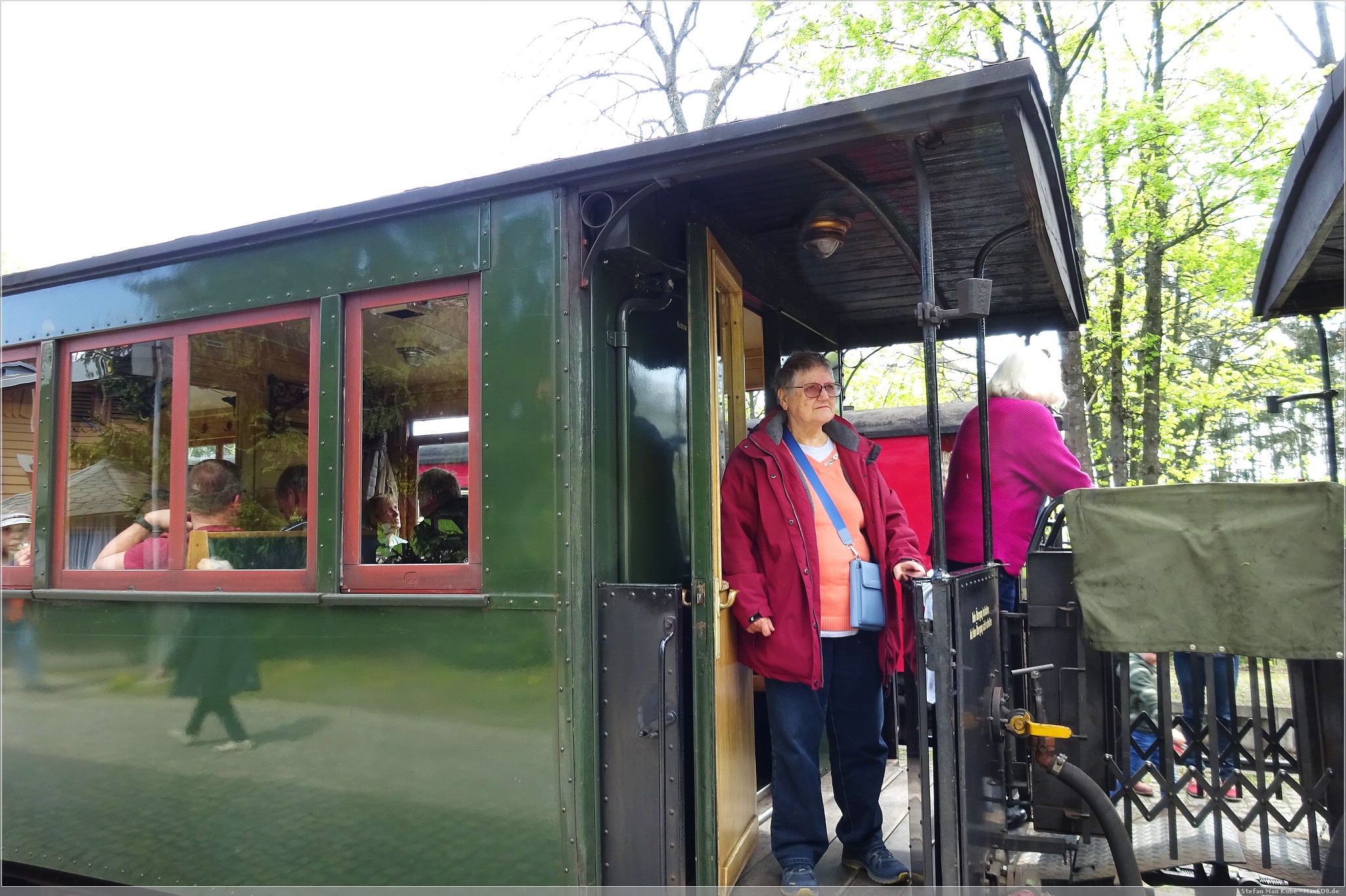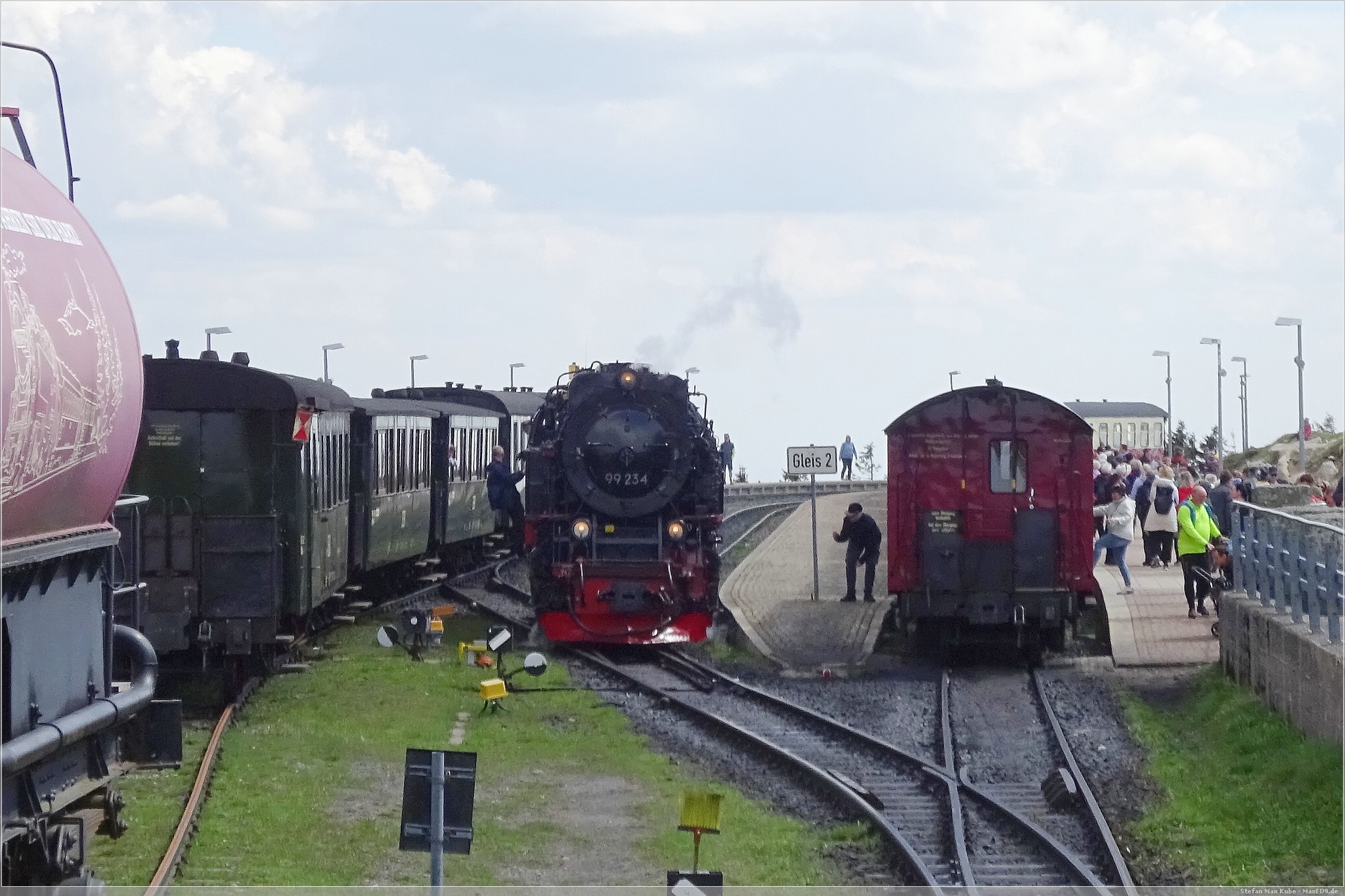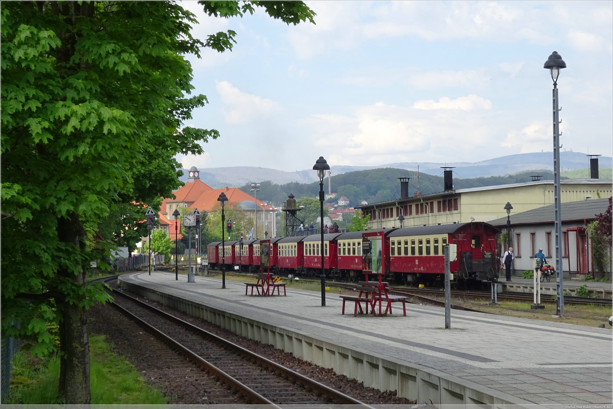 Am Samstagmorgen ging es mir deutlich besser und ich freute mich auf das Frühstück. Frisch gestärkt spazierten wir wieder zum Bahnhof. Auf dem Plan stand die Fahrt mit dem Traditionszug der Harzer Schmalspurbahn. Es war noch viel Zeit und wir konnten daher die Bereitstellung der Dampflokomitven und Bespannung des Linienverkehrs beobachten. Ich nutzte die Gelegenheit auch noch für einen virtuellen Cache[3], bevor es für uns hieß: „Bitte alles einsteigen!“.