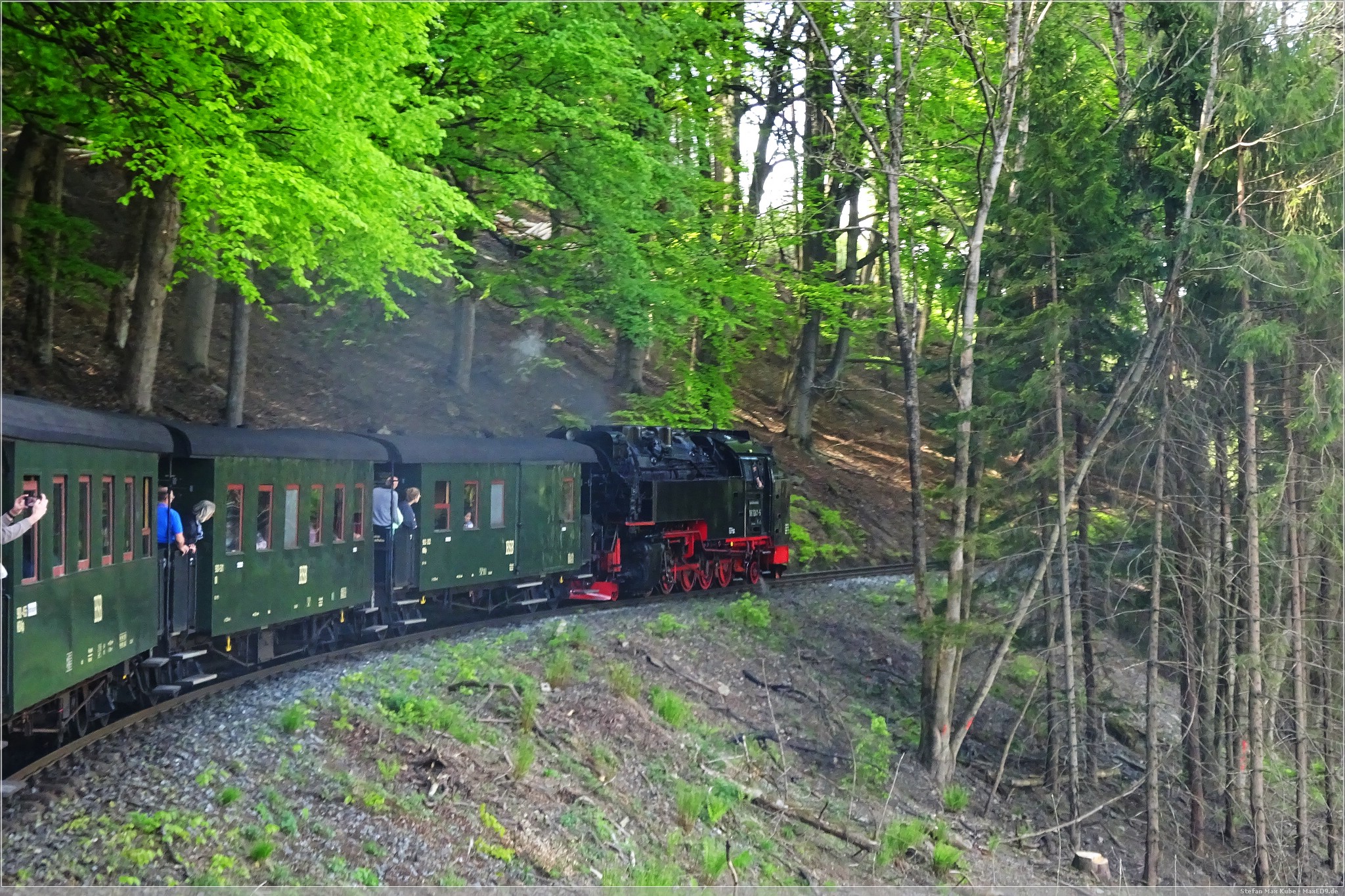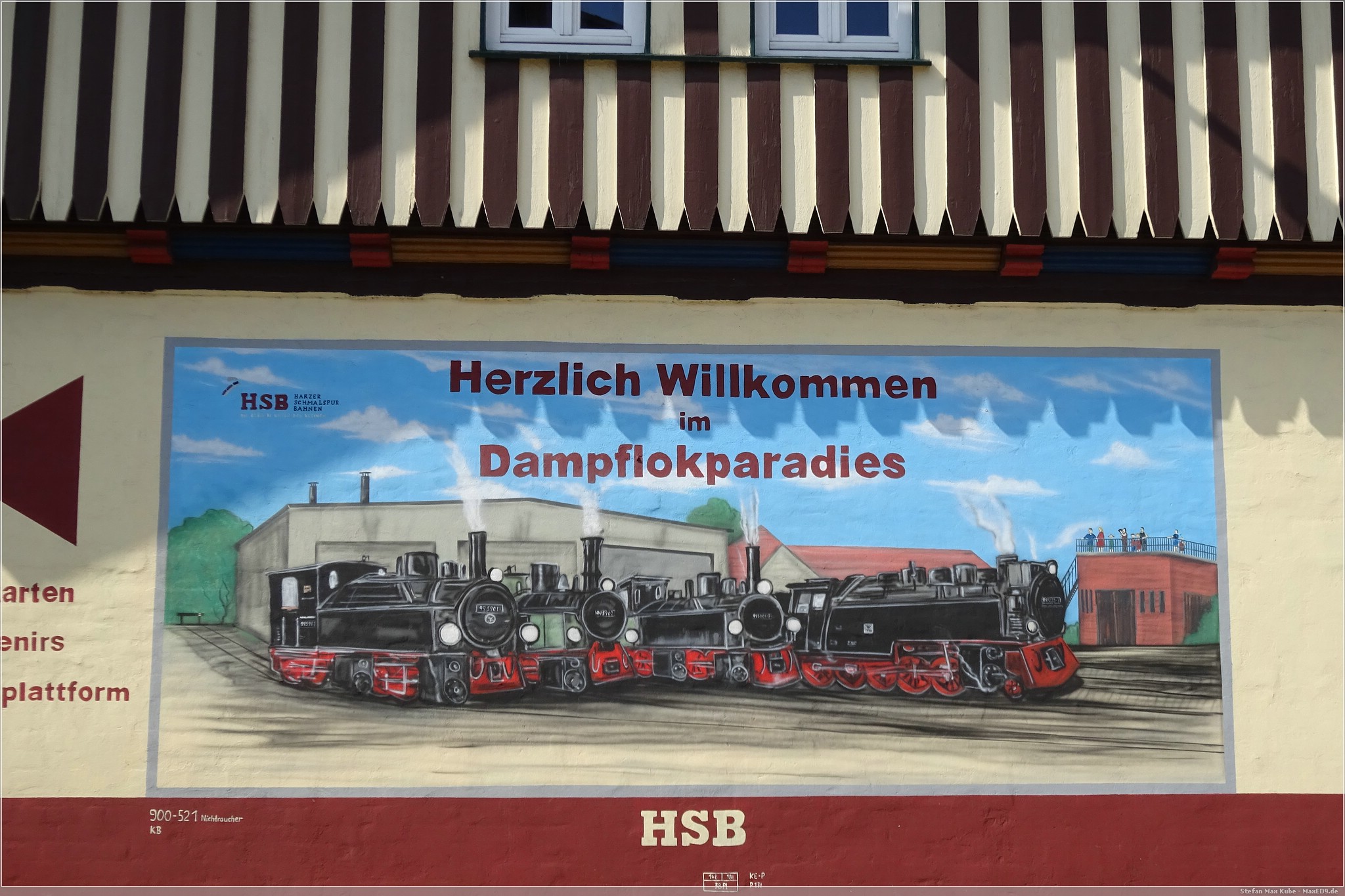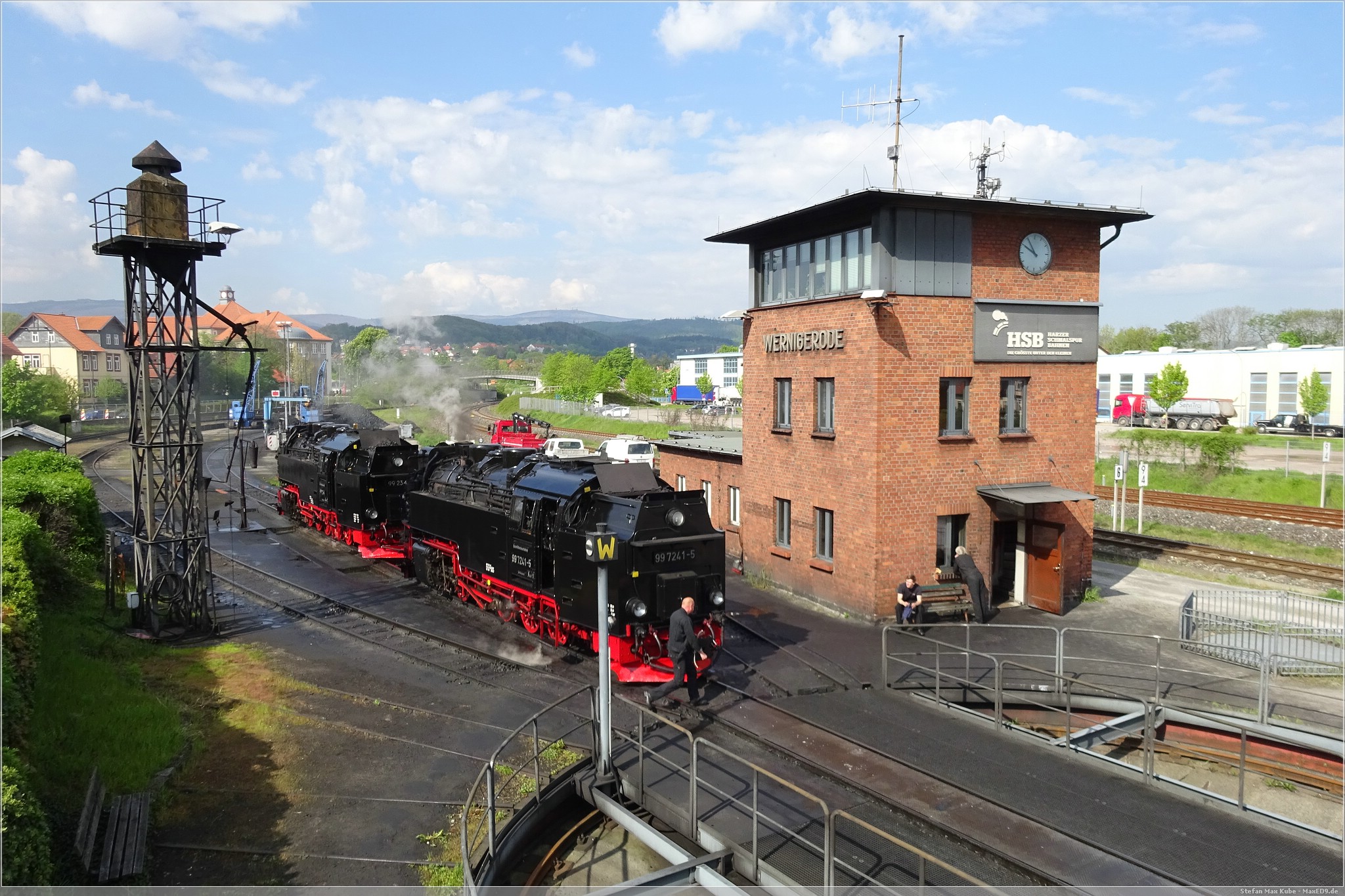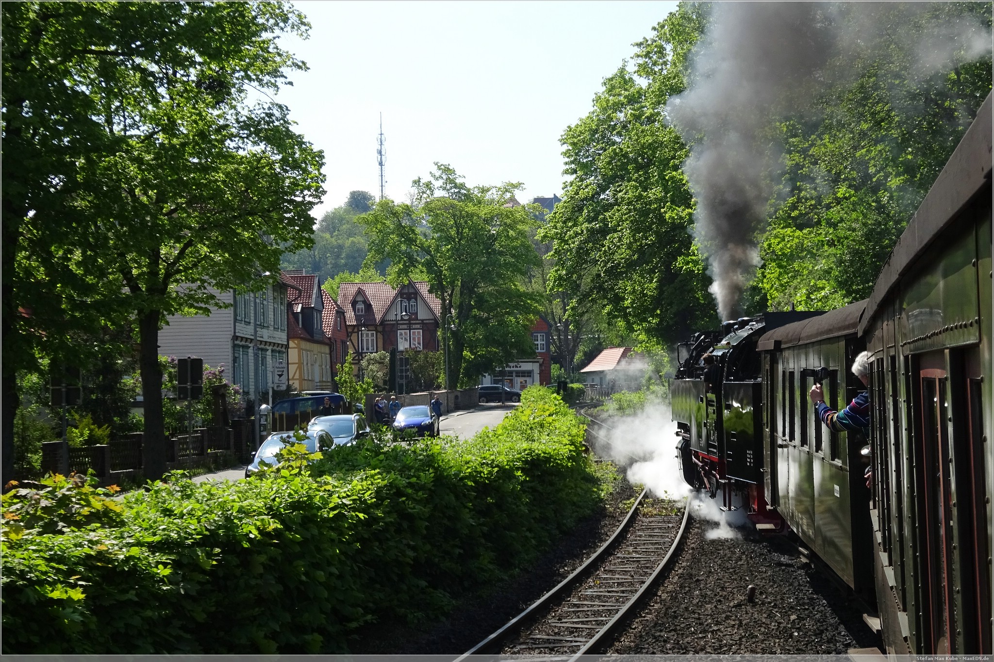 Am Samstagmorgen ging es mir deutlich besser und ich freute mich auf das Frühstück. Frisch gestärkt spazierten wir wieder zum Bahnhof. Auf dem Plan stand die Fahrt mit dem Traditionszug der Harzer Schmalspurbahn. Es war noch viel Zeit und wir konnten daher die Bereitstellung der Dampflokomitven und Bespannung des Linienverkehrs beobachten. Ich nutzte die Gelegenheit auch noch für einen virtuellen Cache[3], bevor es für uns hieß: „Bitte alles einsteigen!“.