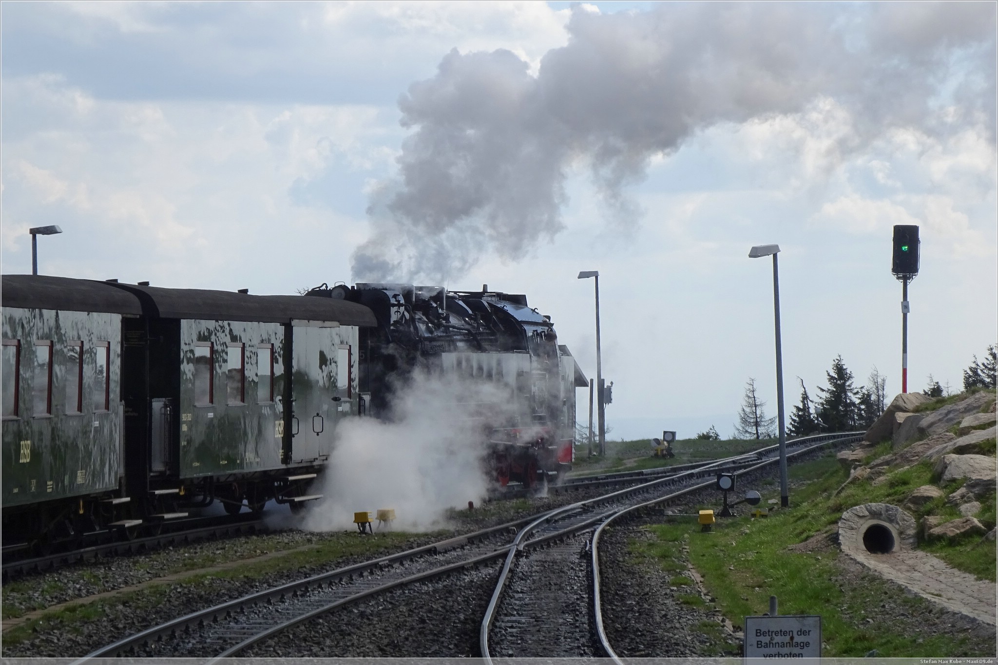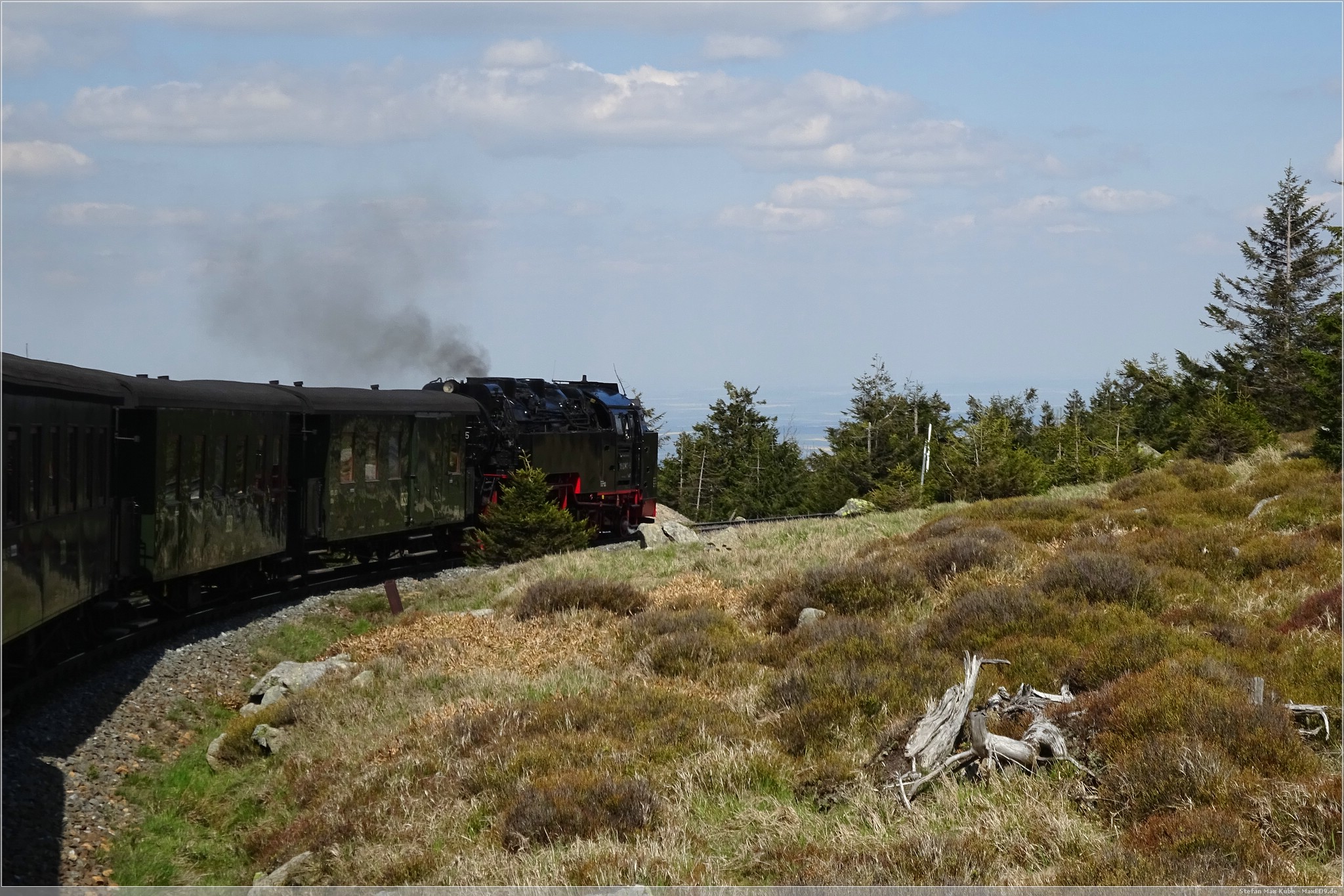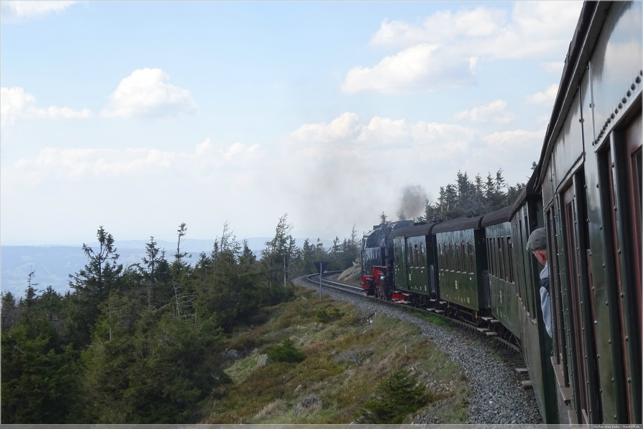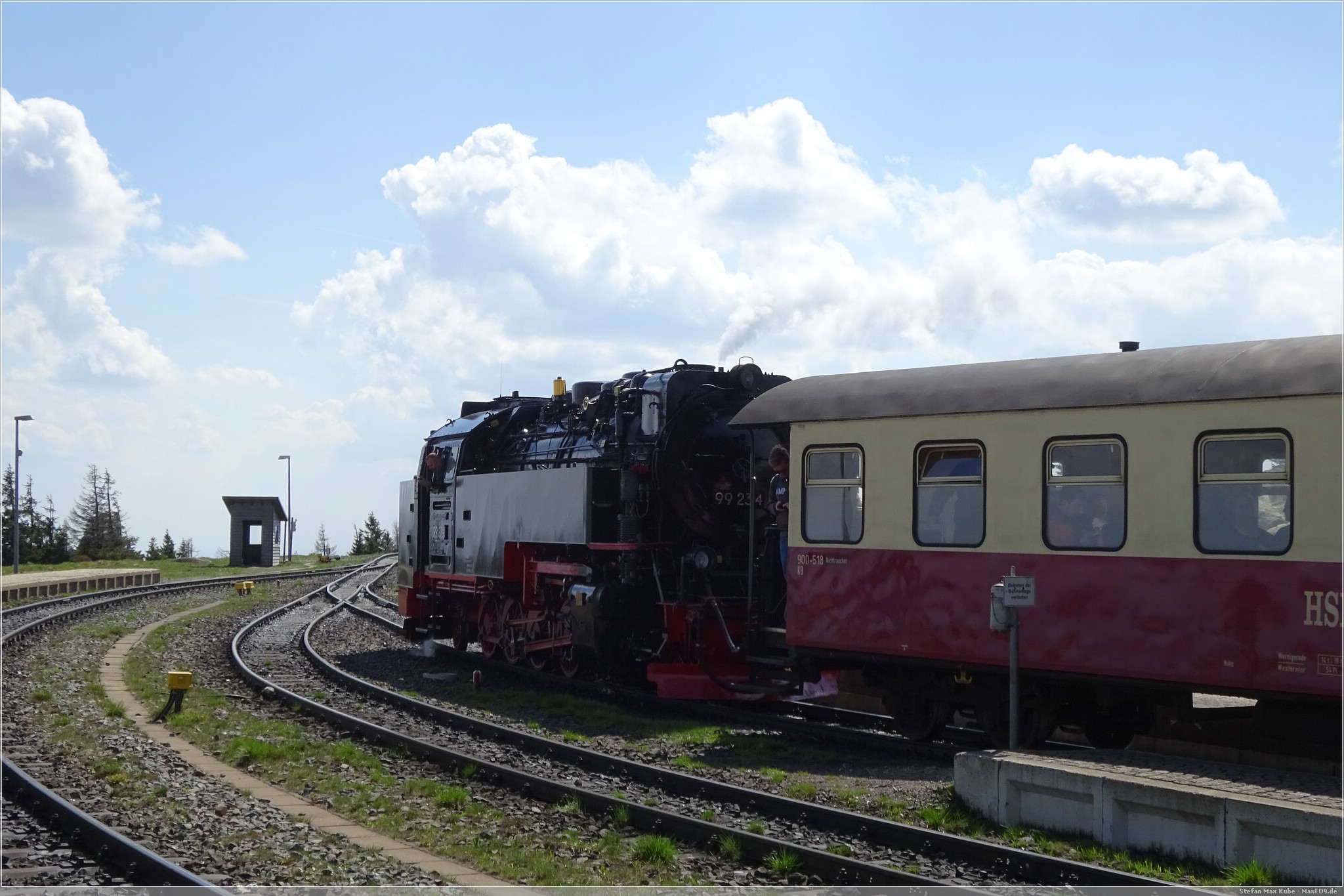 Mit Volldampf ging es dann gen Brocken. Das Wetter meinte es wirklich gut mit und, die Sonne schien reichlich und so war es eine schöne Fahrt. In Drei Annen Hohne als auch in Schierke gab es jeweils längere Aufenthalte. Einerseits um den regulären Linienverkehr Vorrang zu gewähren, aber auch um immer wieder Wasser für die Lok aufzunehmen.