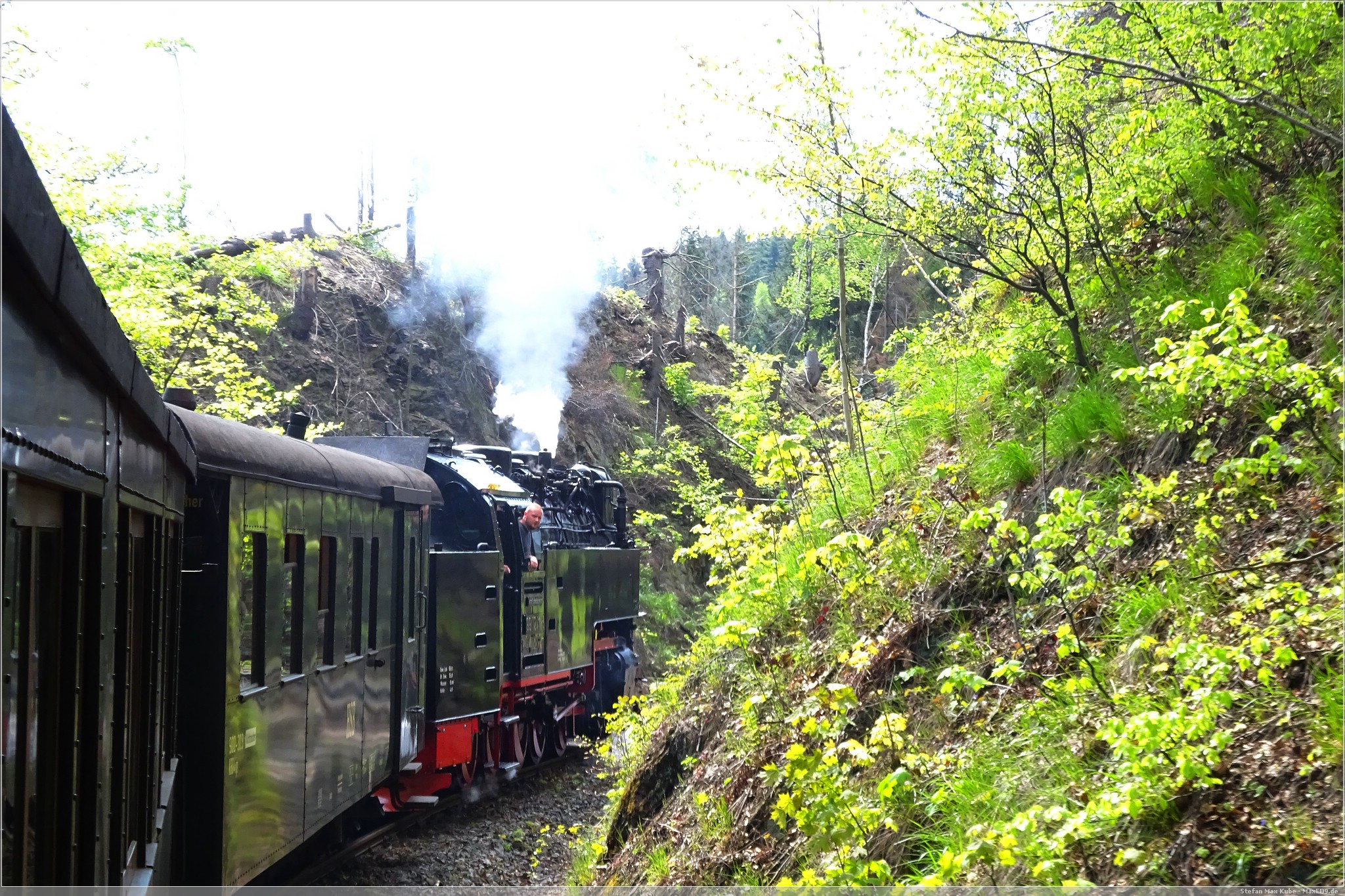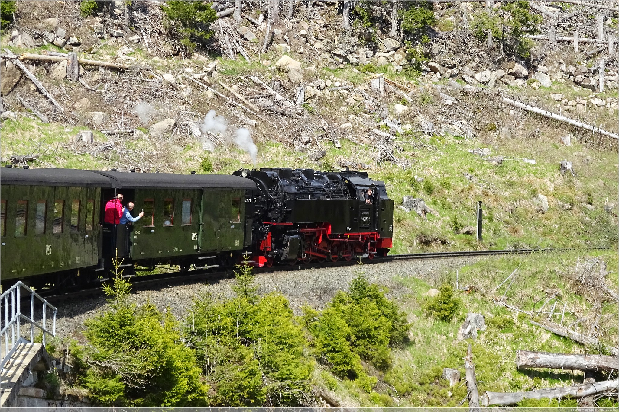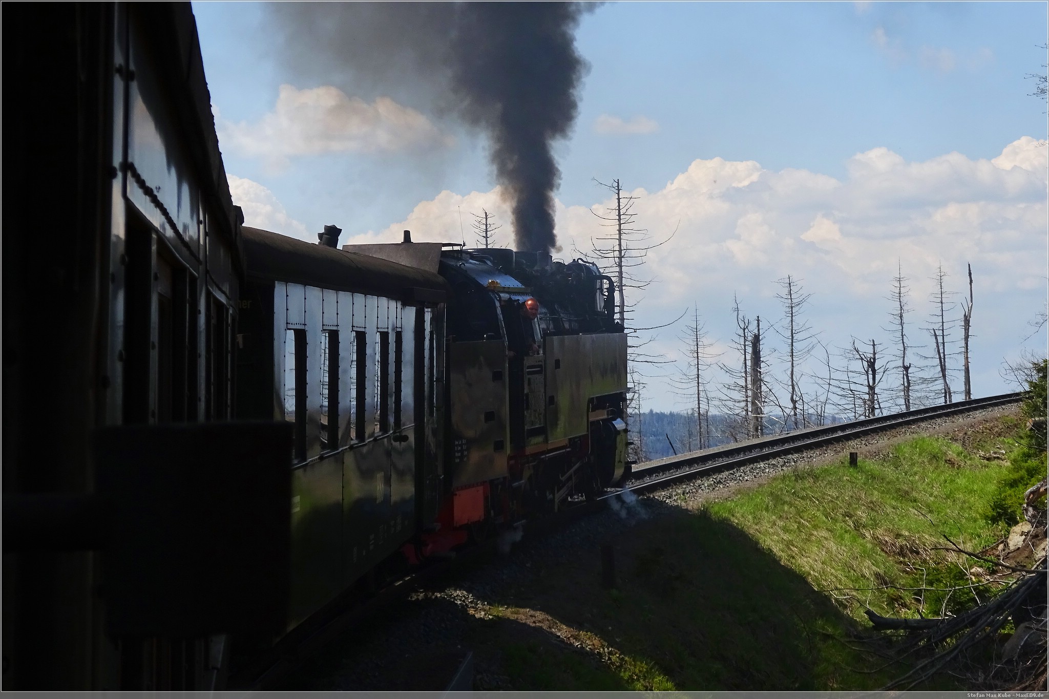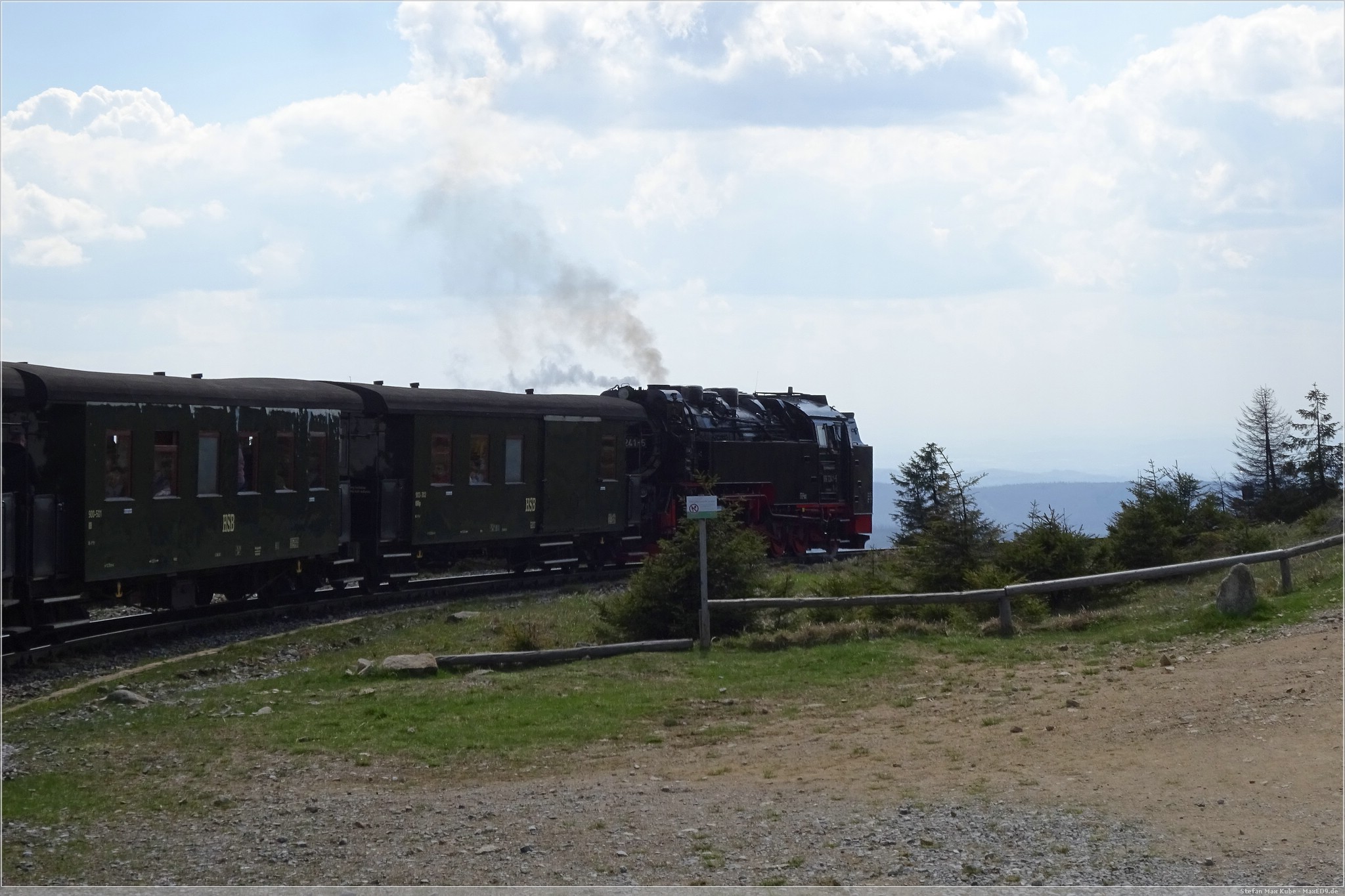 Mit Volldampf ging es dann gen Brocken. Das Wetter meinte es wirklich gut mit und, die Sonne schien reichlich und so war es eine schöne Fahrt. In Drei Annen Hohne als auch in Schierke gab es jeweils längere Aufenthalte. Einerseits um den regulären Linienverkehr Vorrang zu gewähren, aber auch um immer wieder Wasser für die Lok aufzunehmen.