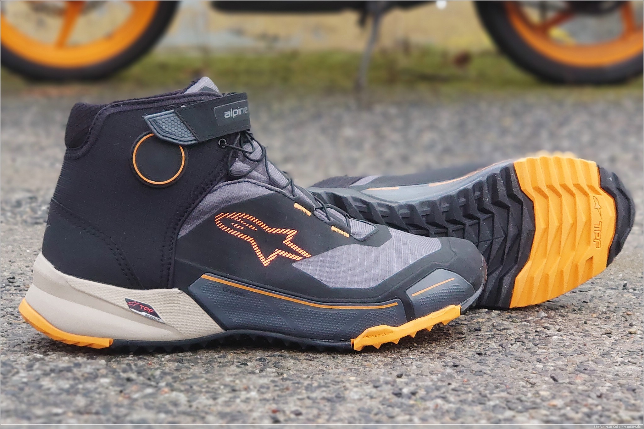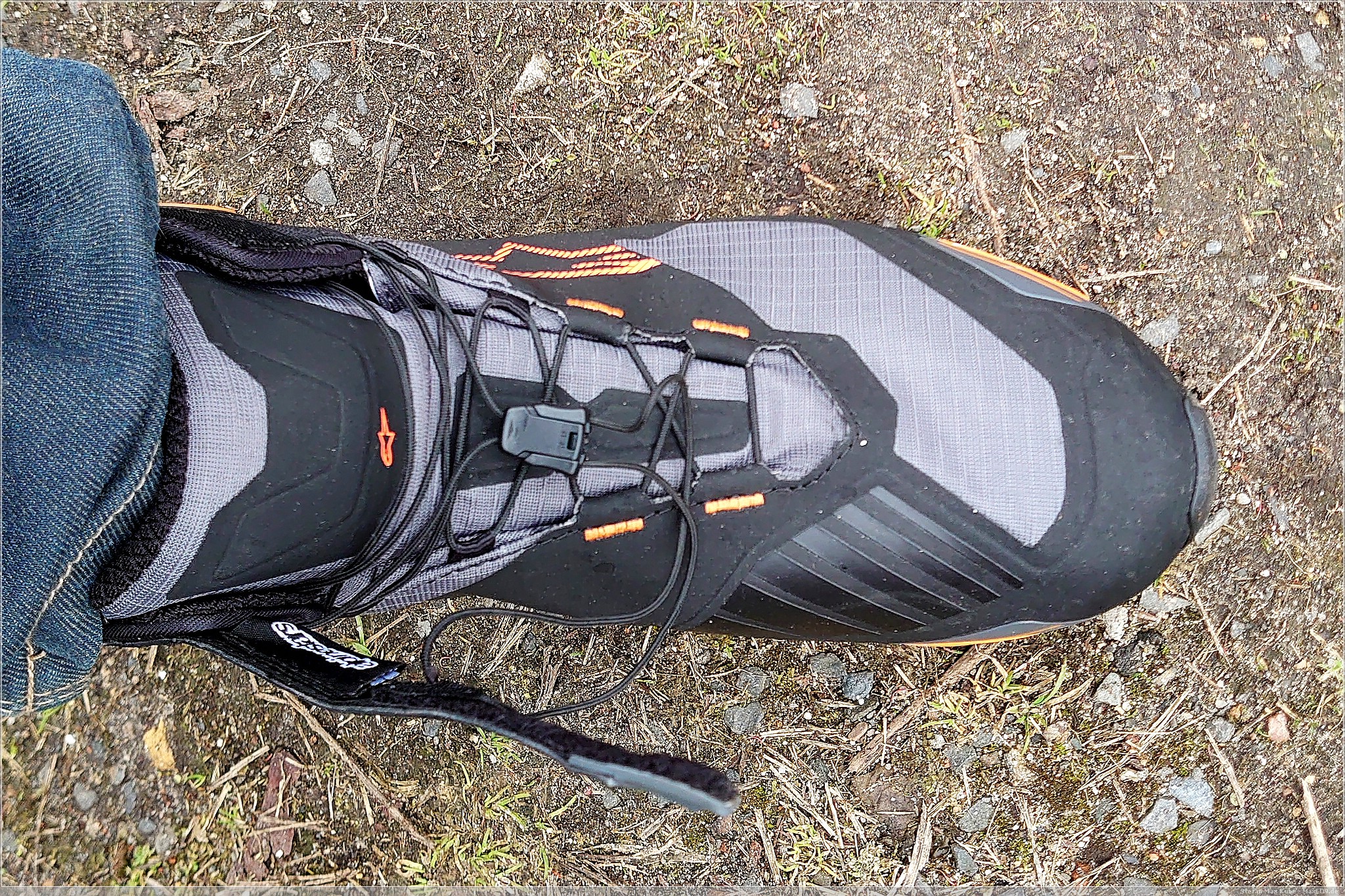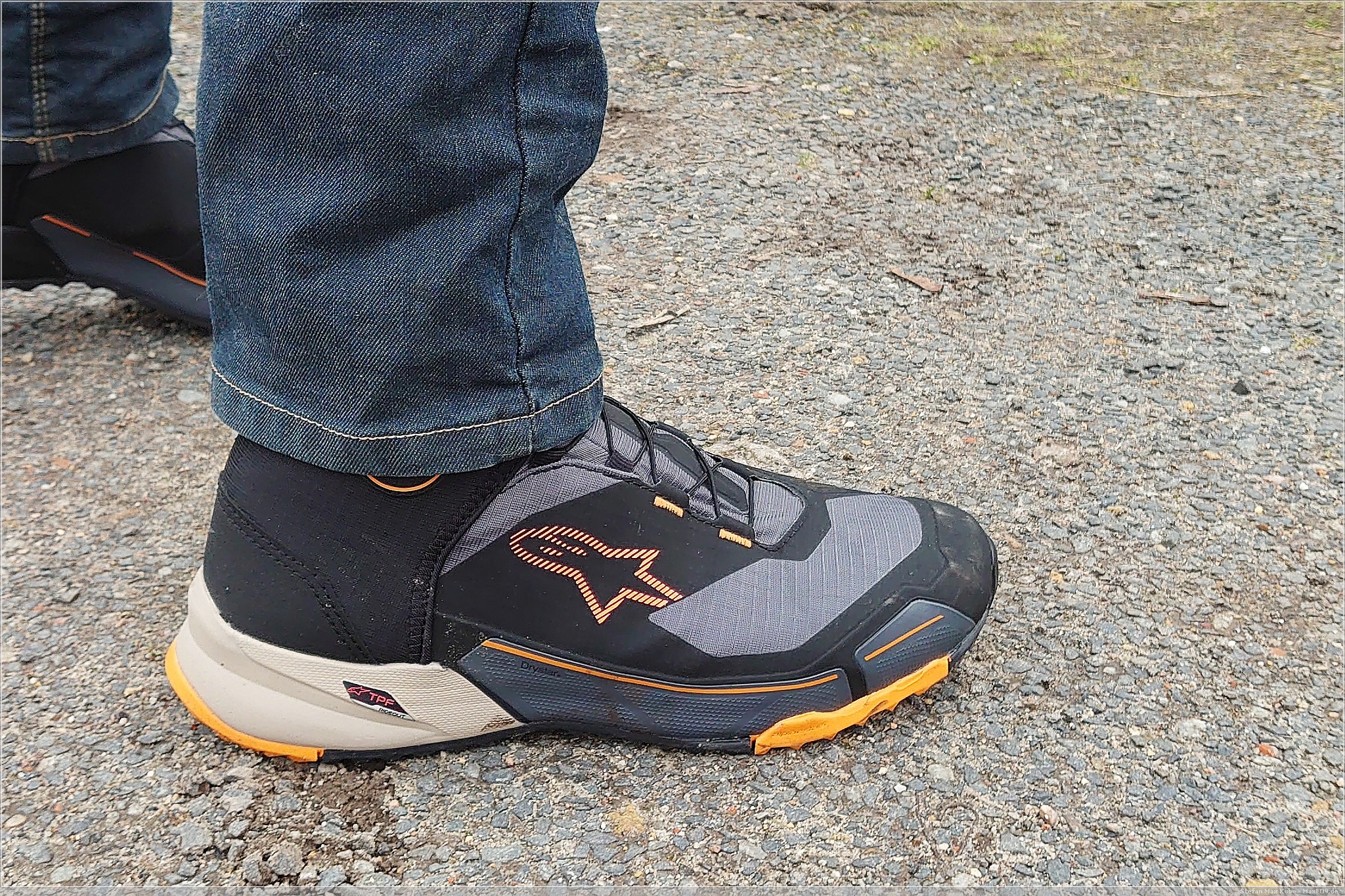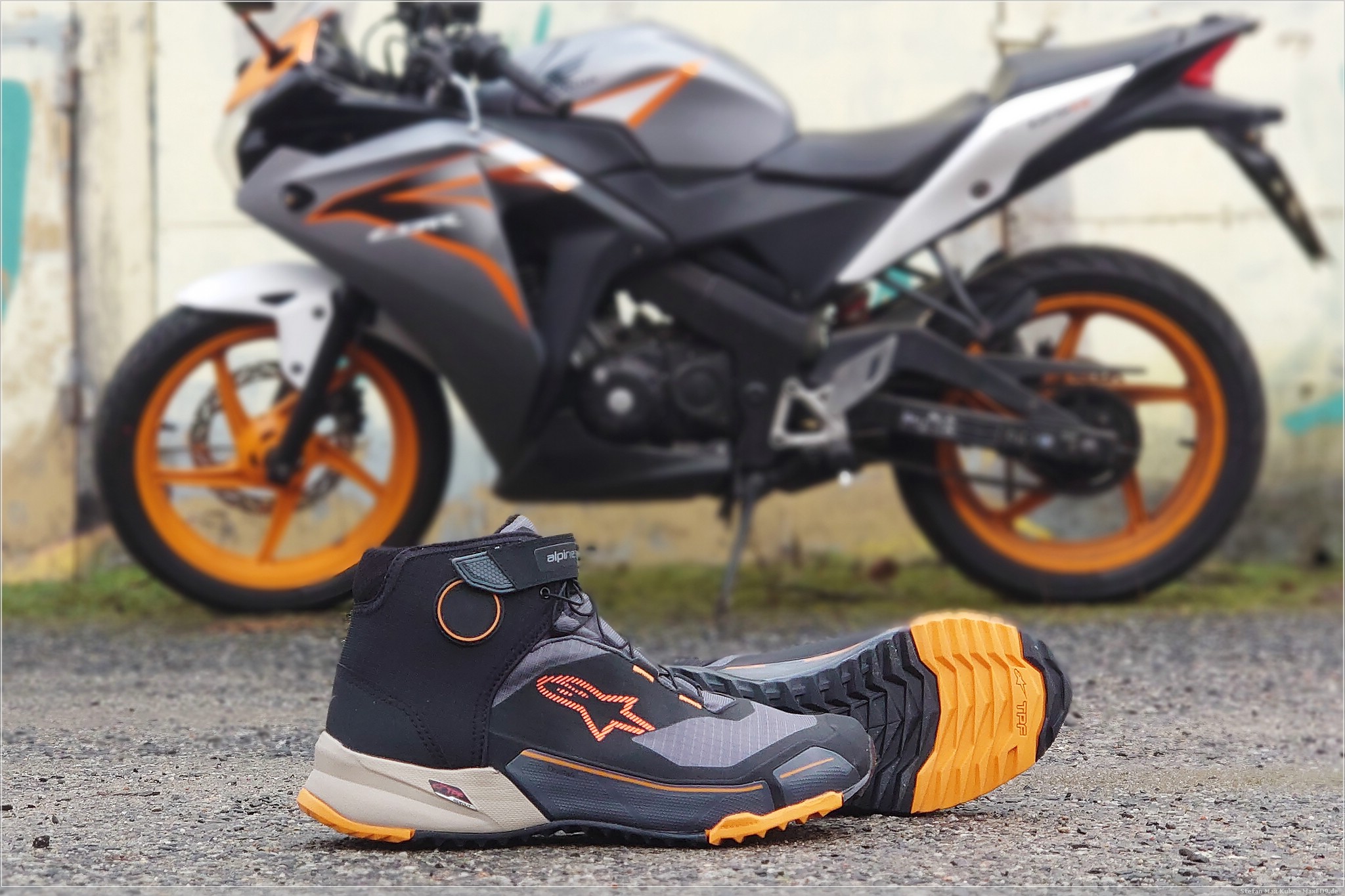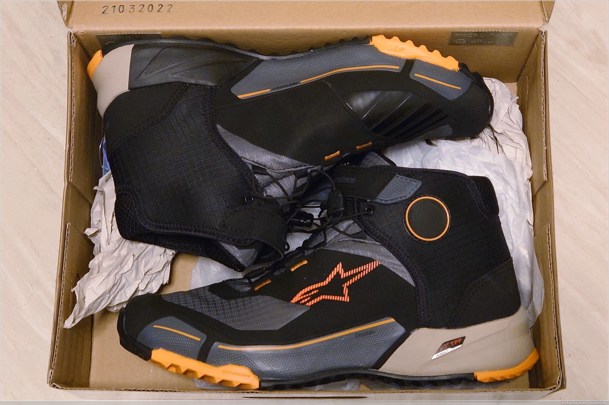 Aber nach 8 oder 9 Jahren macht der Ridge keine ganz so gute Figur mehr, vielleicht hab ich ihn auch ein bisschen zu selten gepflegt und für die Fahrten mit der Microblade, kam auch der Bedarf nach anderen Schuhen auf. Beim Blick in den Produktkatalog fielen mir die Alpinestars CR-X Drystar[1] auf, die es in mehreren Farben gab. Die Honda Edition passte leider nicht, aber die schwarz-braun-orange Variante sah passend aus.