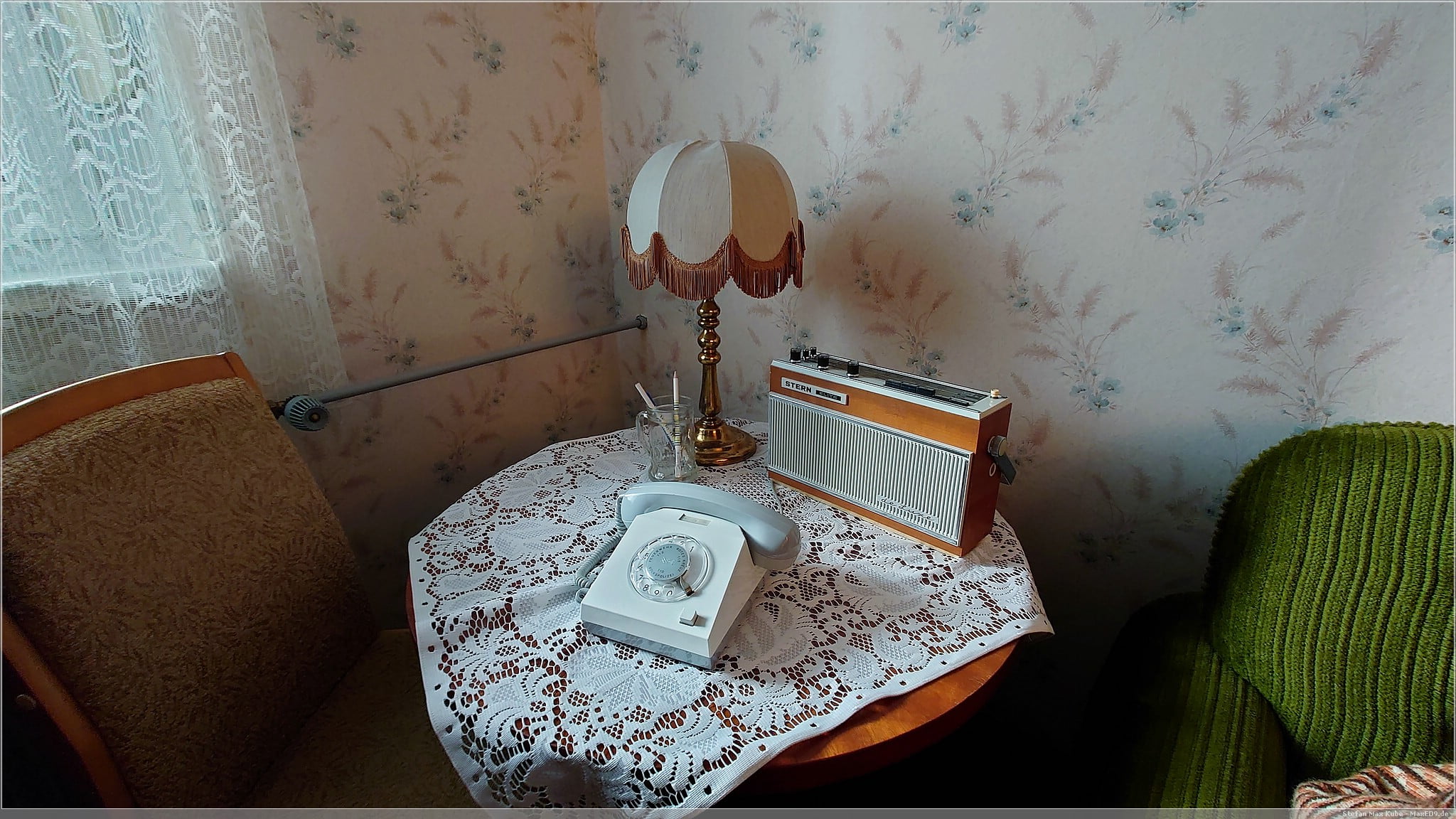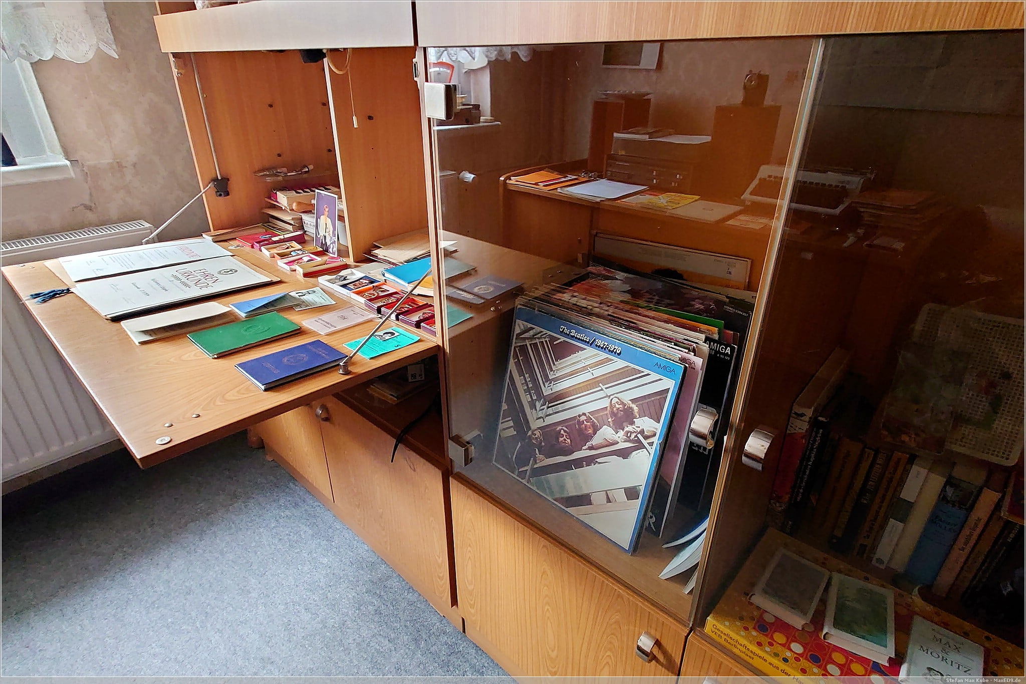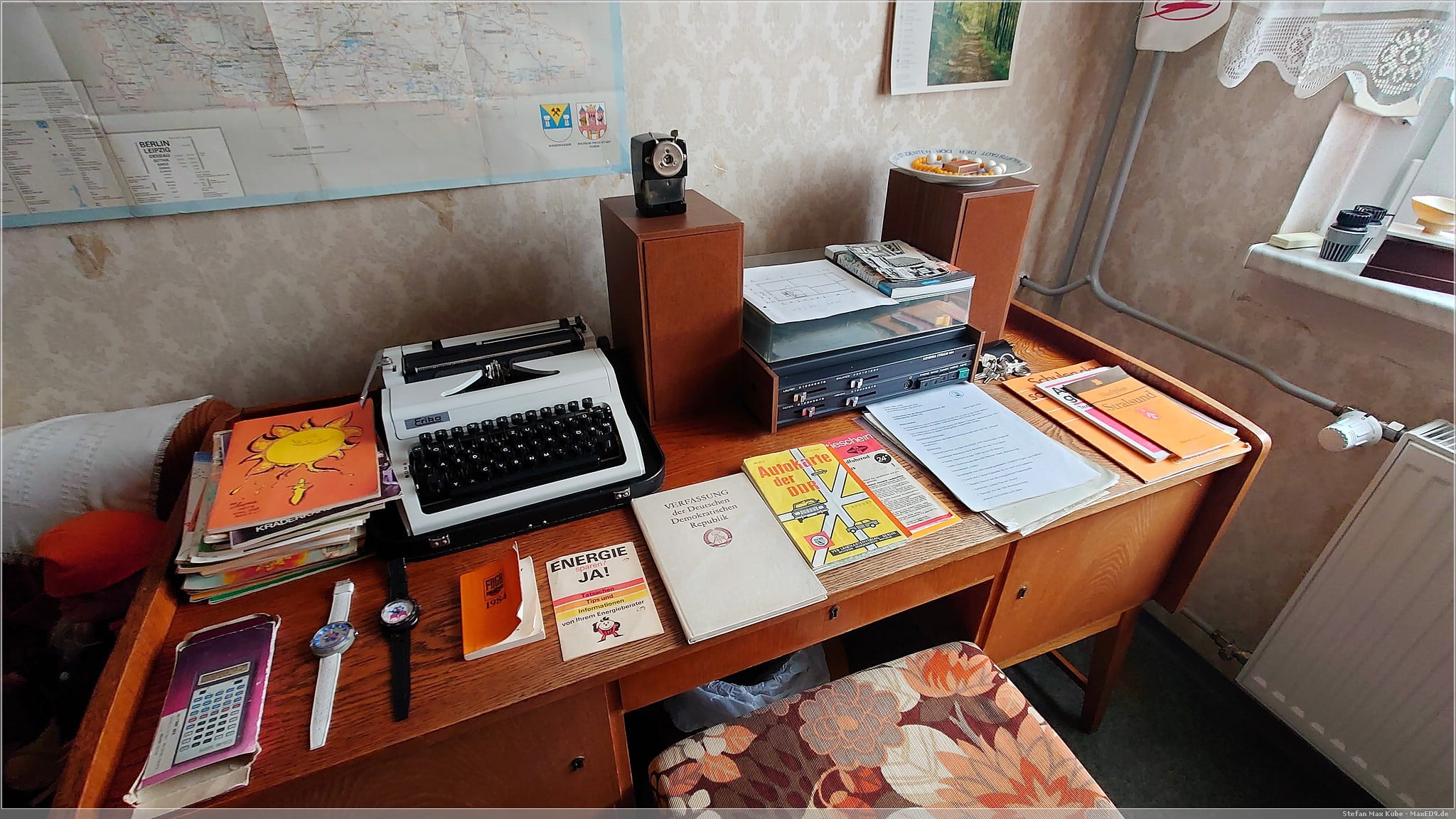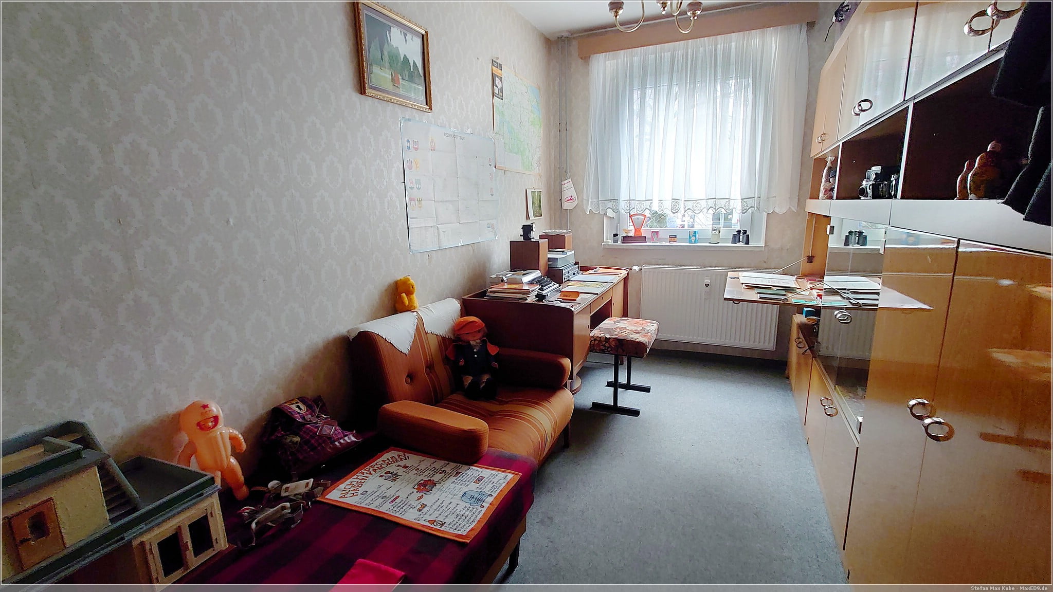 Anfassen ist hier überall ausdrücklich erlaubt, man darf in die Schränke schauen, sich überall hinsetzen und auch in den Büchern stöbern. Alle Teile sind originalgetreu, vom Lichtschalter bis zum Fussboden und stammen überwiegend aus Schenkungen. Im Jahr 1986 betrug die Miete solch einer sehr beliebten Wohnung 109 Mark, bei einem durchschnittlichen Nettoeinkommen von 969 Mark.