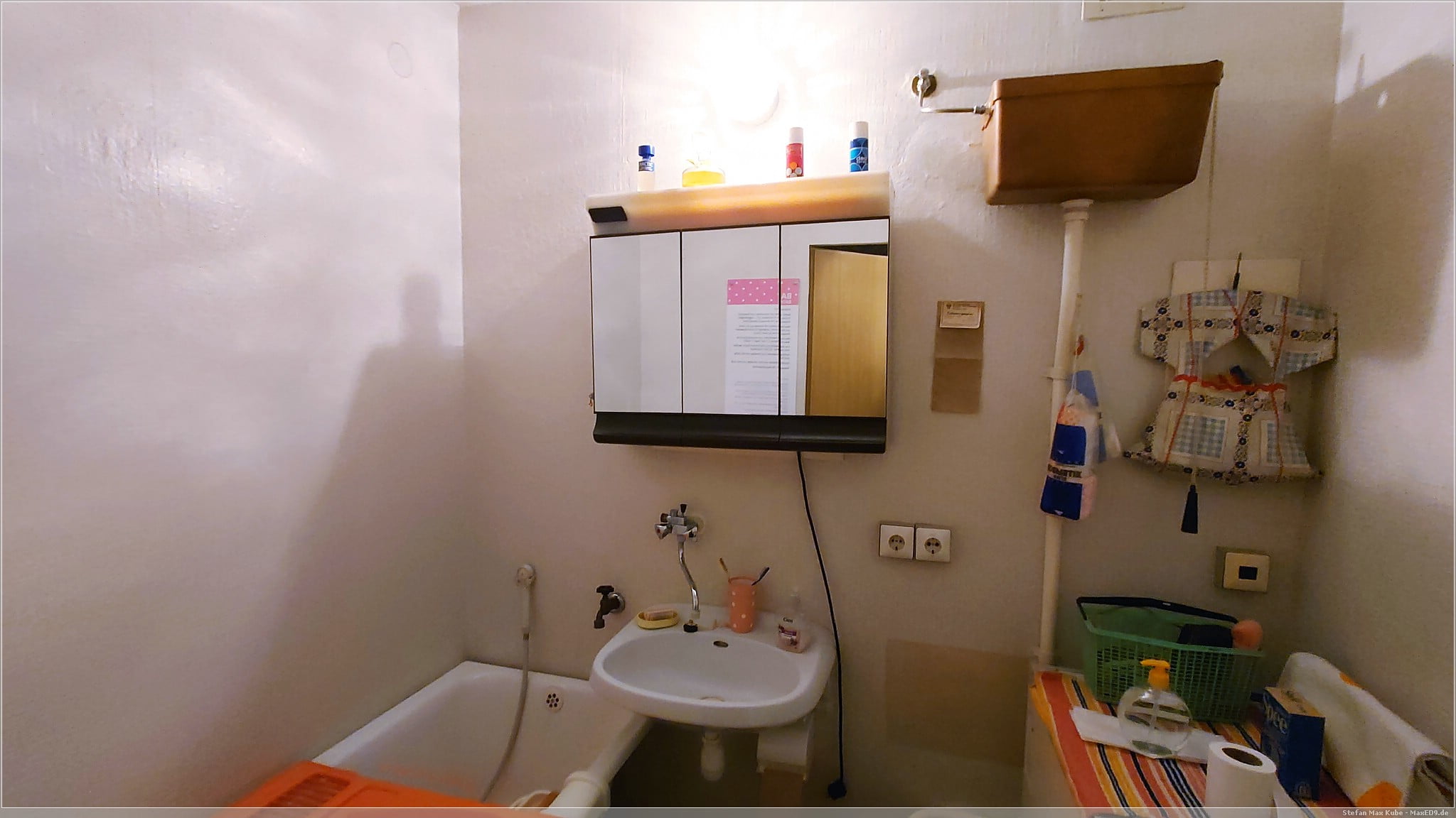 Das Erlebnis beginnt wie ein Besuch bei Freunden. Man klingelt, der Türsummer brummt und man tritt ein paar Stufen im Treppenhaus hinauf, wo man an der Wohnungstür begrüßt wird. Im Flur steht eine typische braune Garderobe und dann kann man sich frei entscheiden, ob man zuerst in die Küche oder das Wohnzimmer möchte.