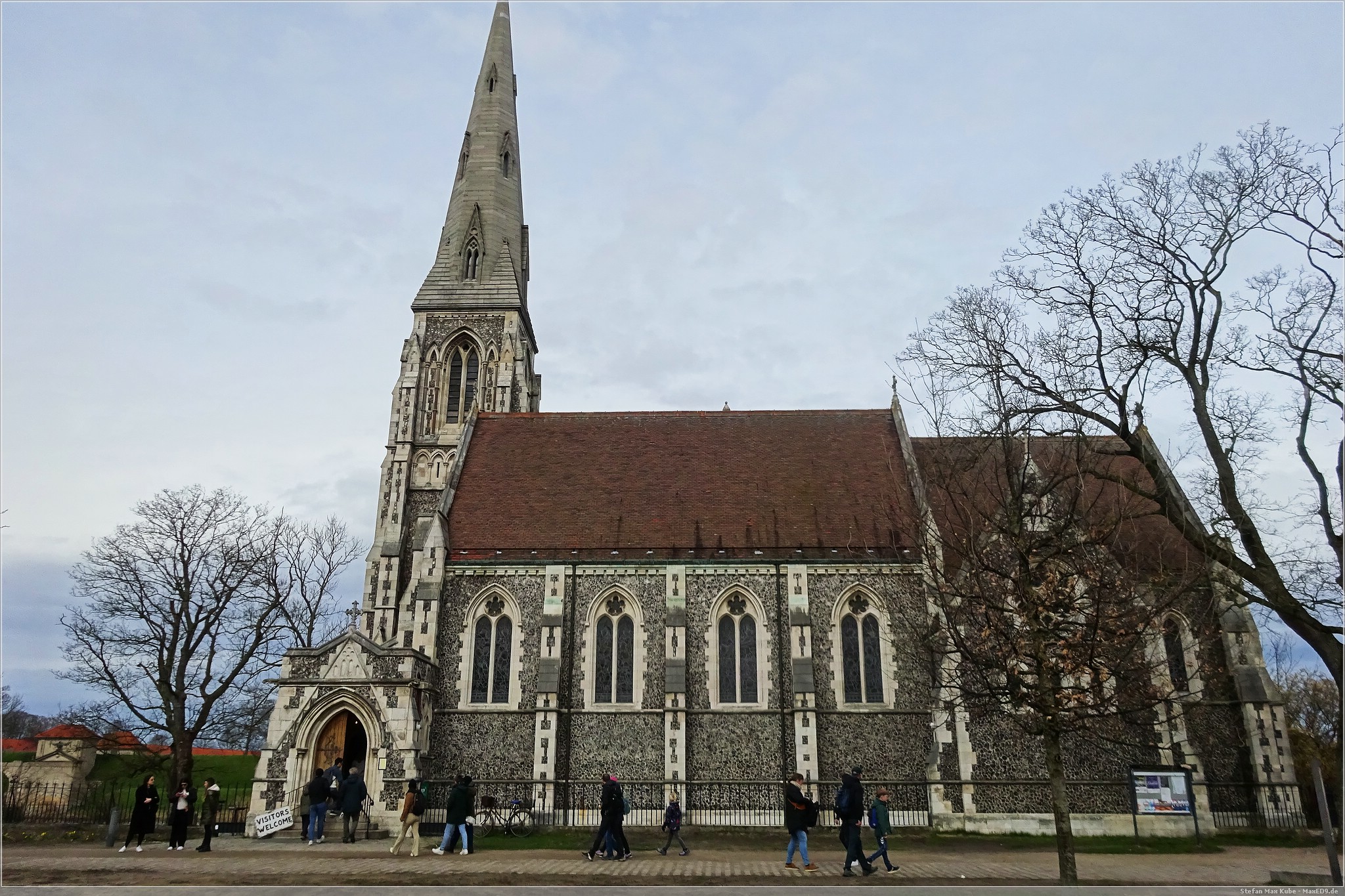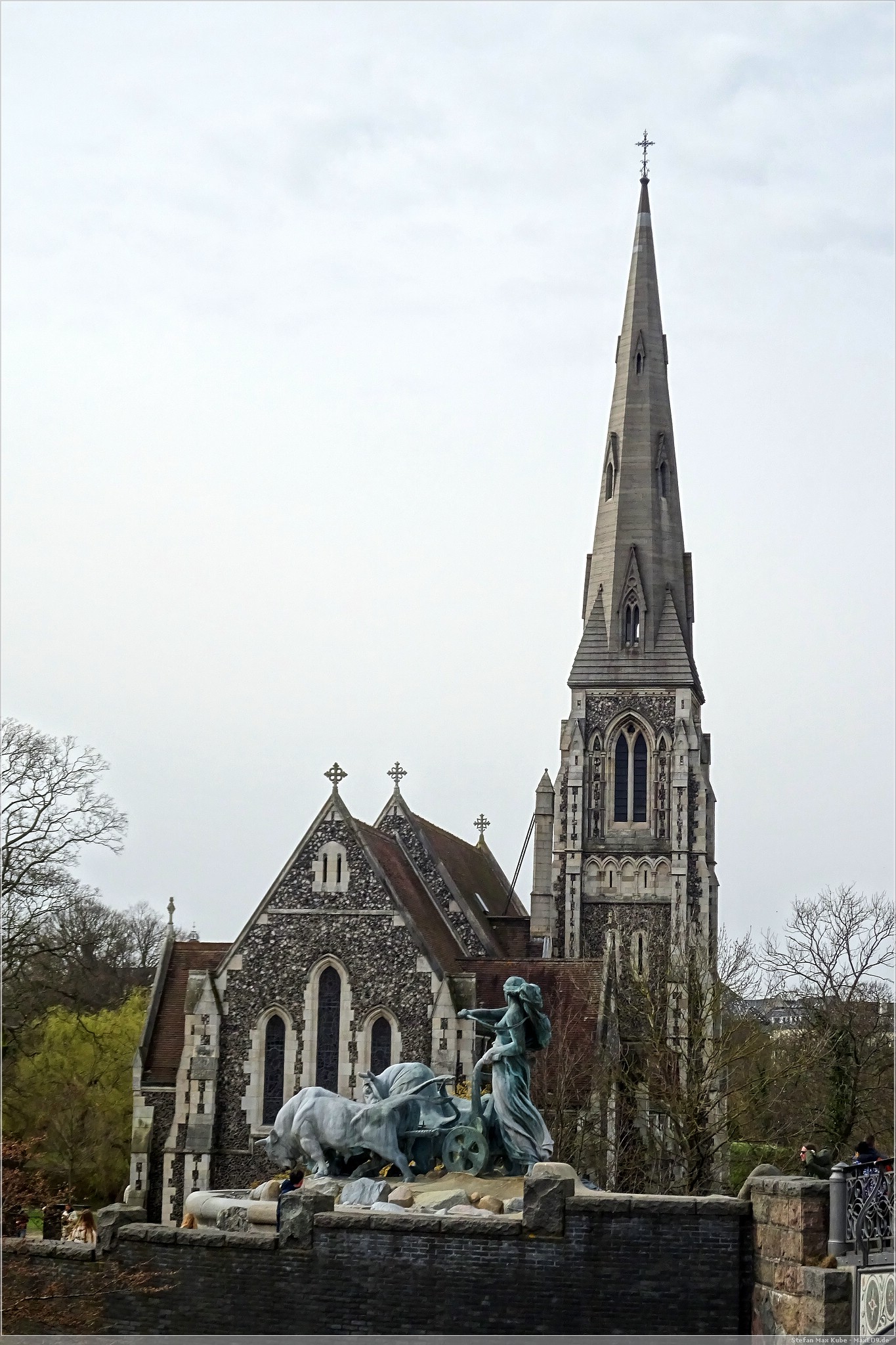 Direkt hinter dem Brunnen steht die Sankt Alban Kirche aus dem Jahr 1887.