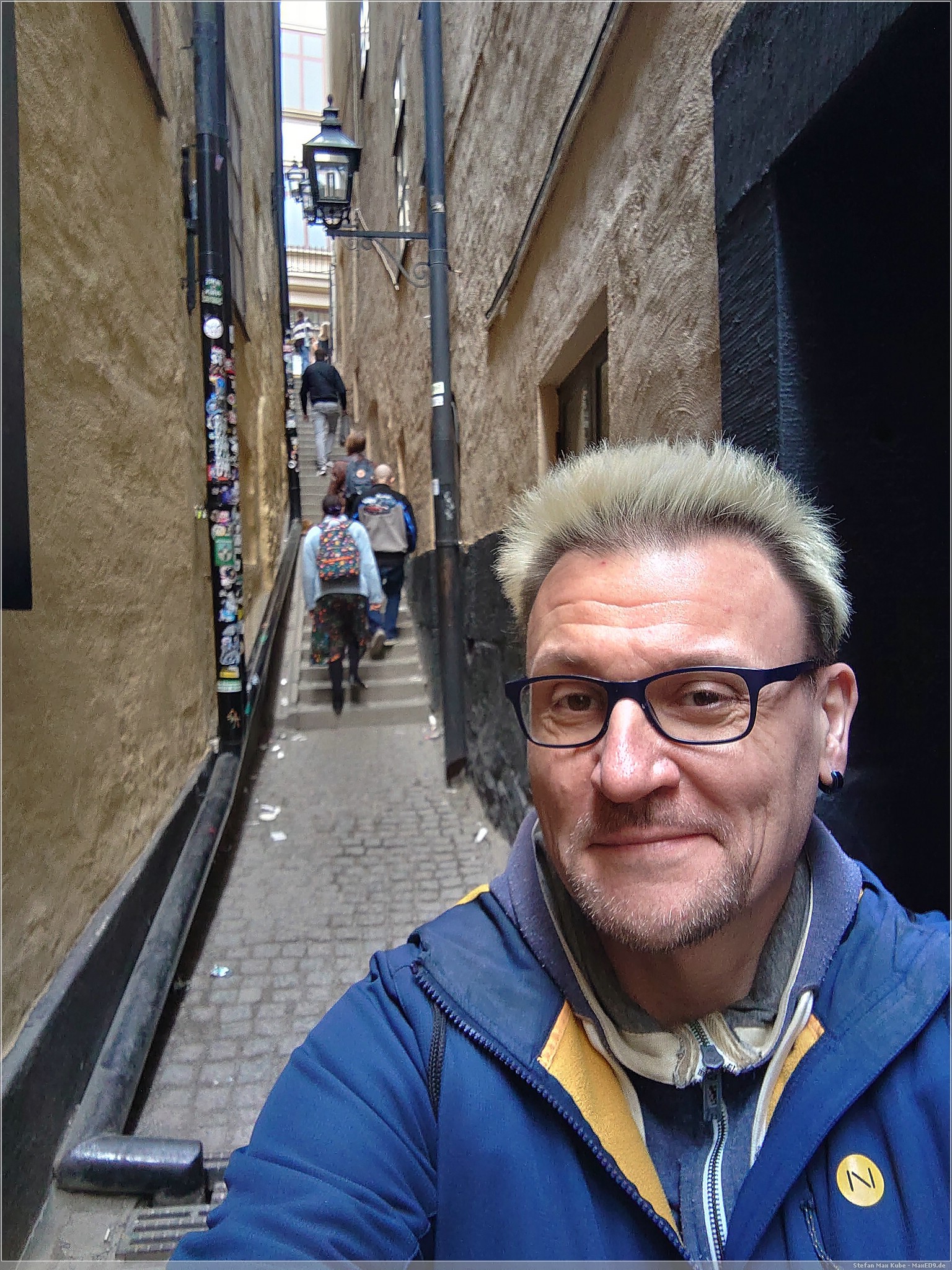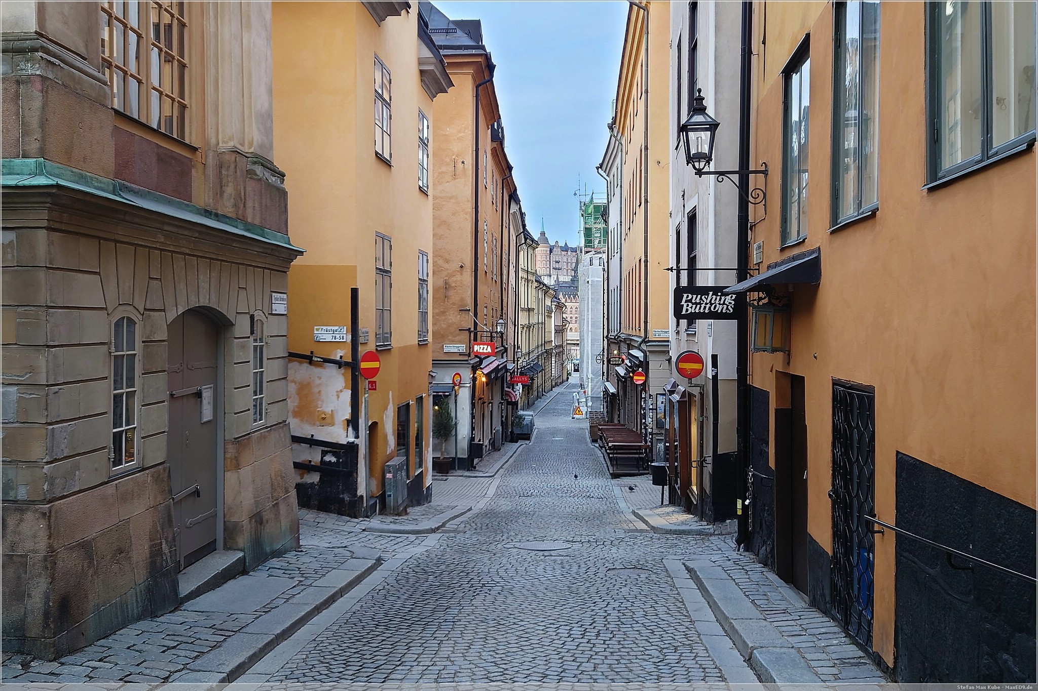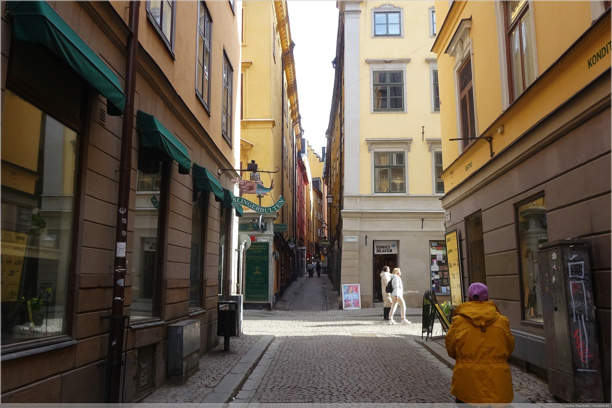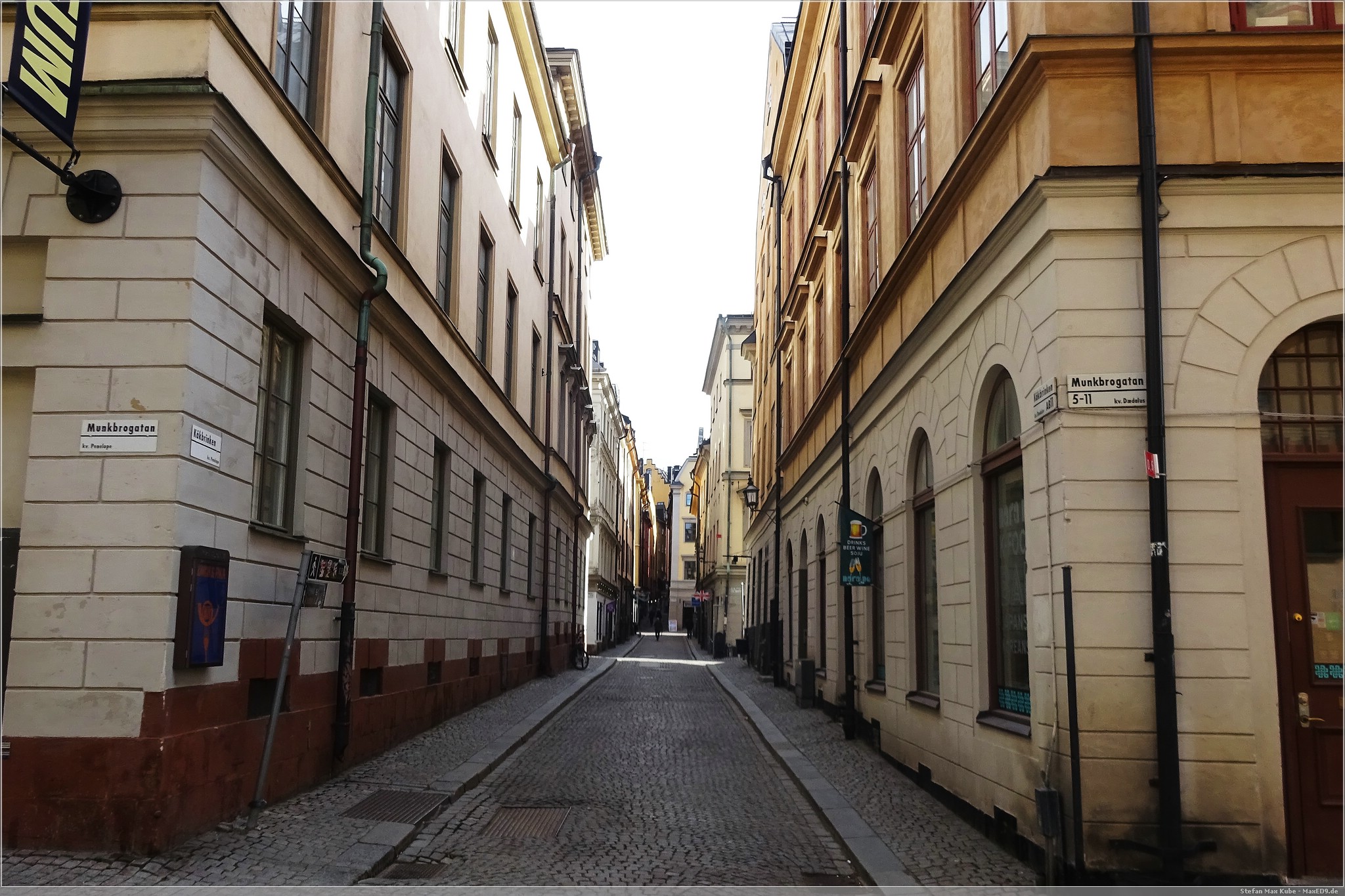 So früh am Morgen war hier noch alles ruhig und ich lief durch die kleinen Gassen bis zur Slussbron und dann hoch in die Fjällgatan. Dort traf ich Karlsson, wie er mit Blick über Stockholm irgendein VR-Game spielte.