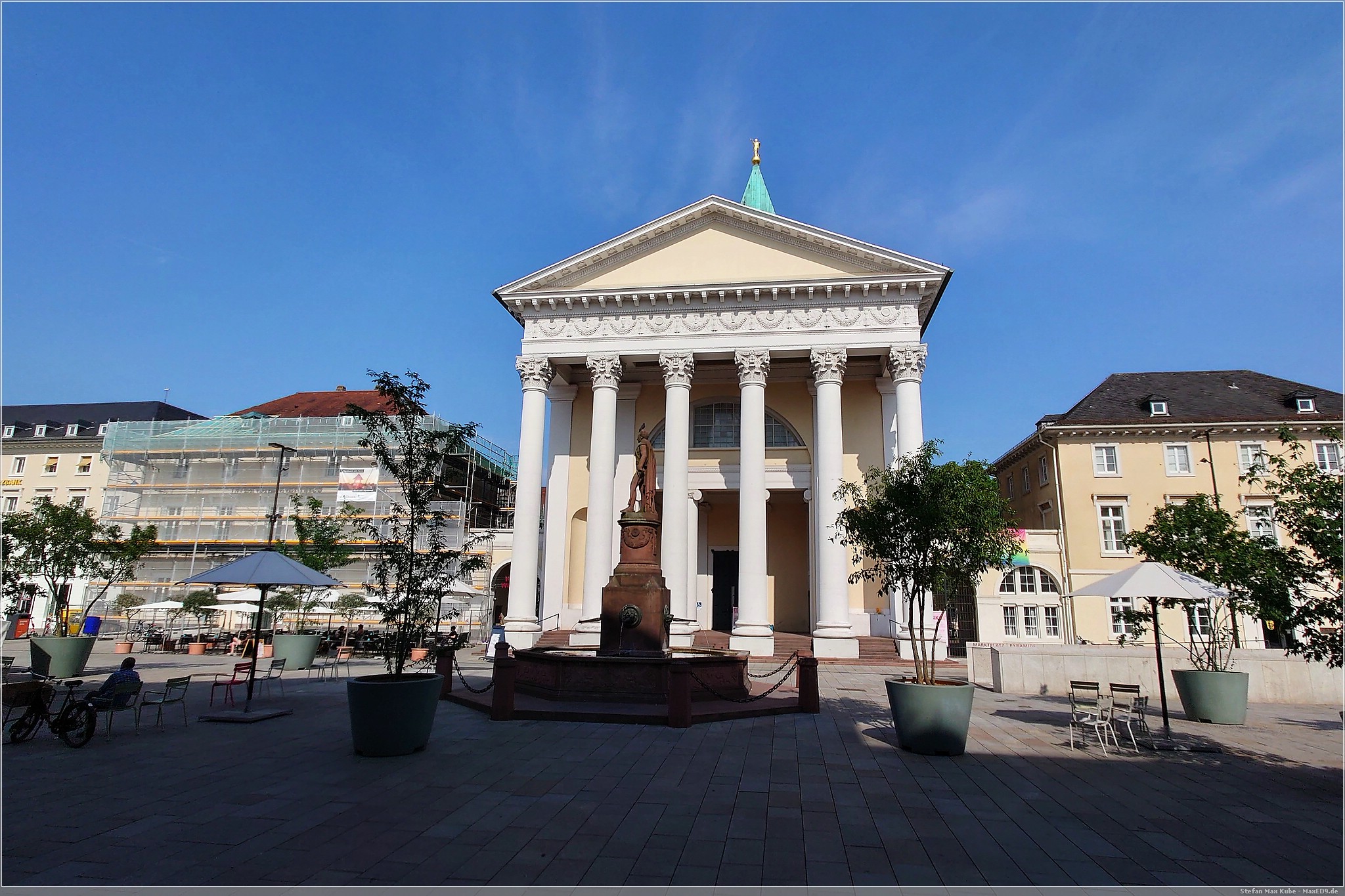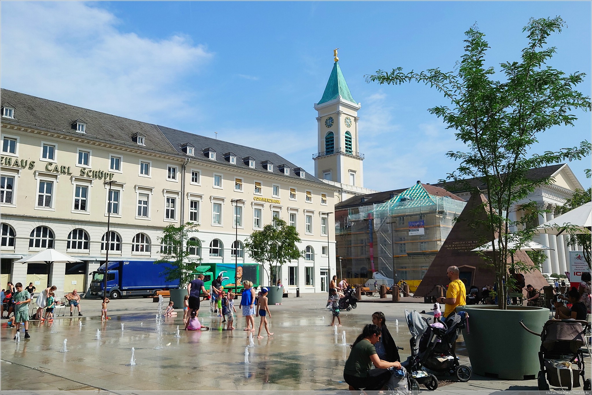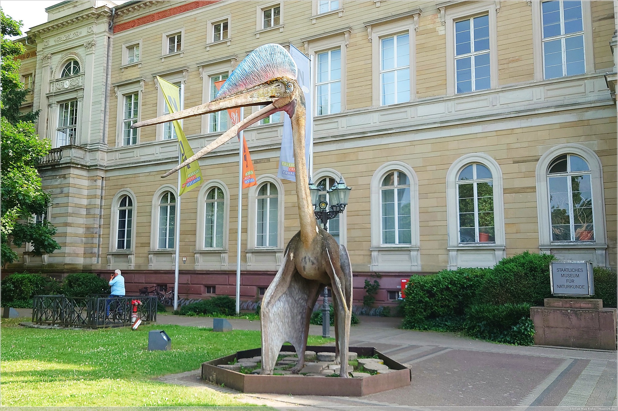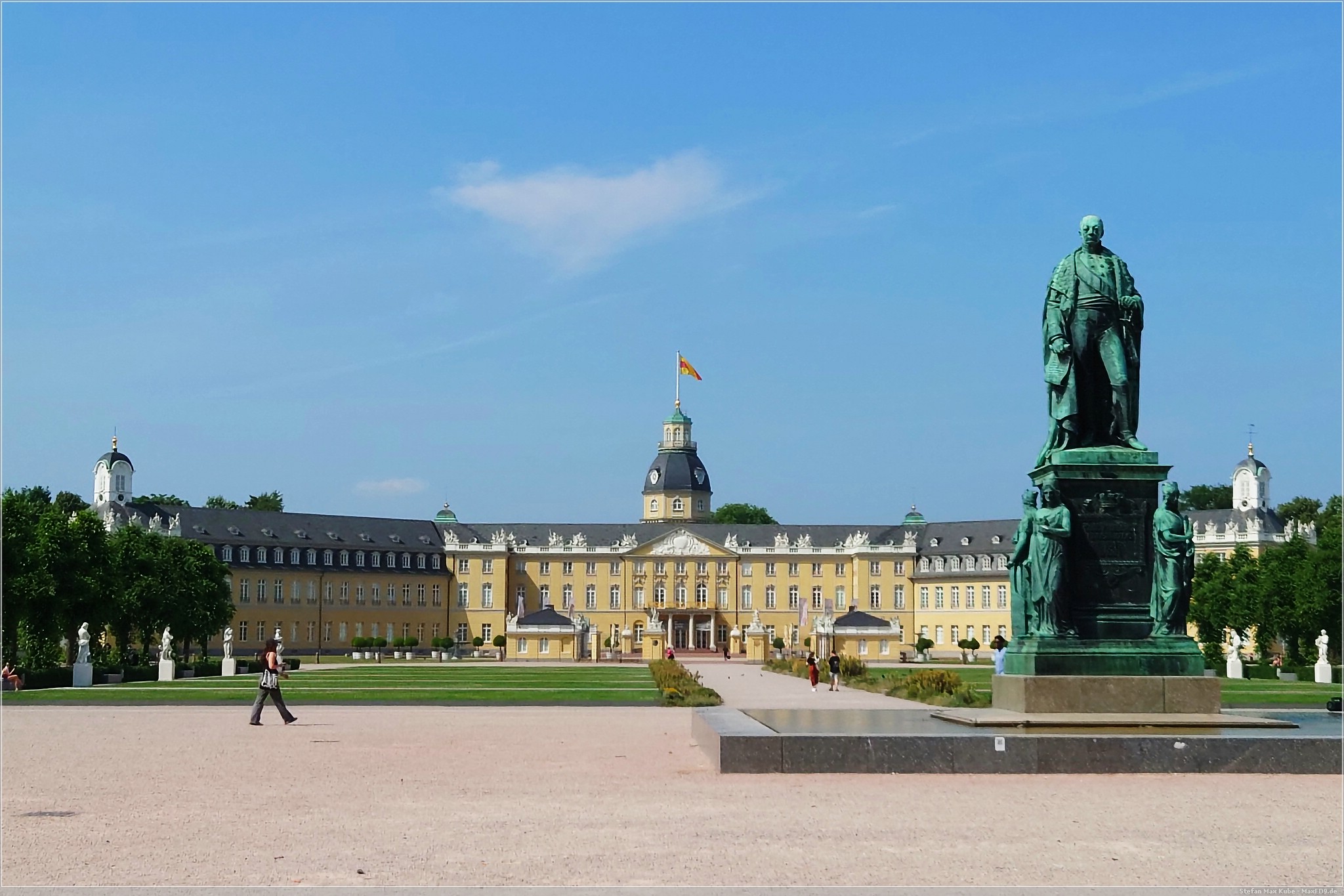 Es wurde auch recht schnell sehr warm und so kam ich gegen 15 Uhr und bei 33 °C sehr verschwitzt in Karlsruhe an. Meinen Schlafplatz hatte ich im Hotel Beim Schupi[1] gebucht und nachdem ich das Zimmer bezog und mich frisch machte, machte ich mich auf den Weg in Richtung Innenstadt.