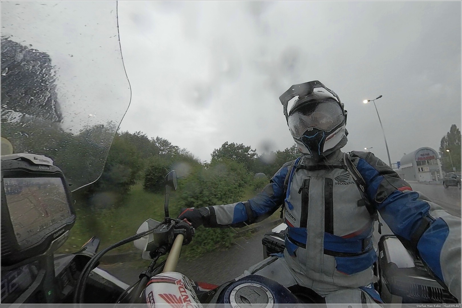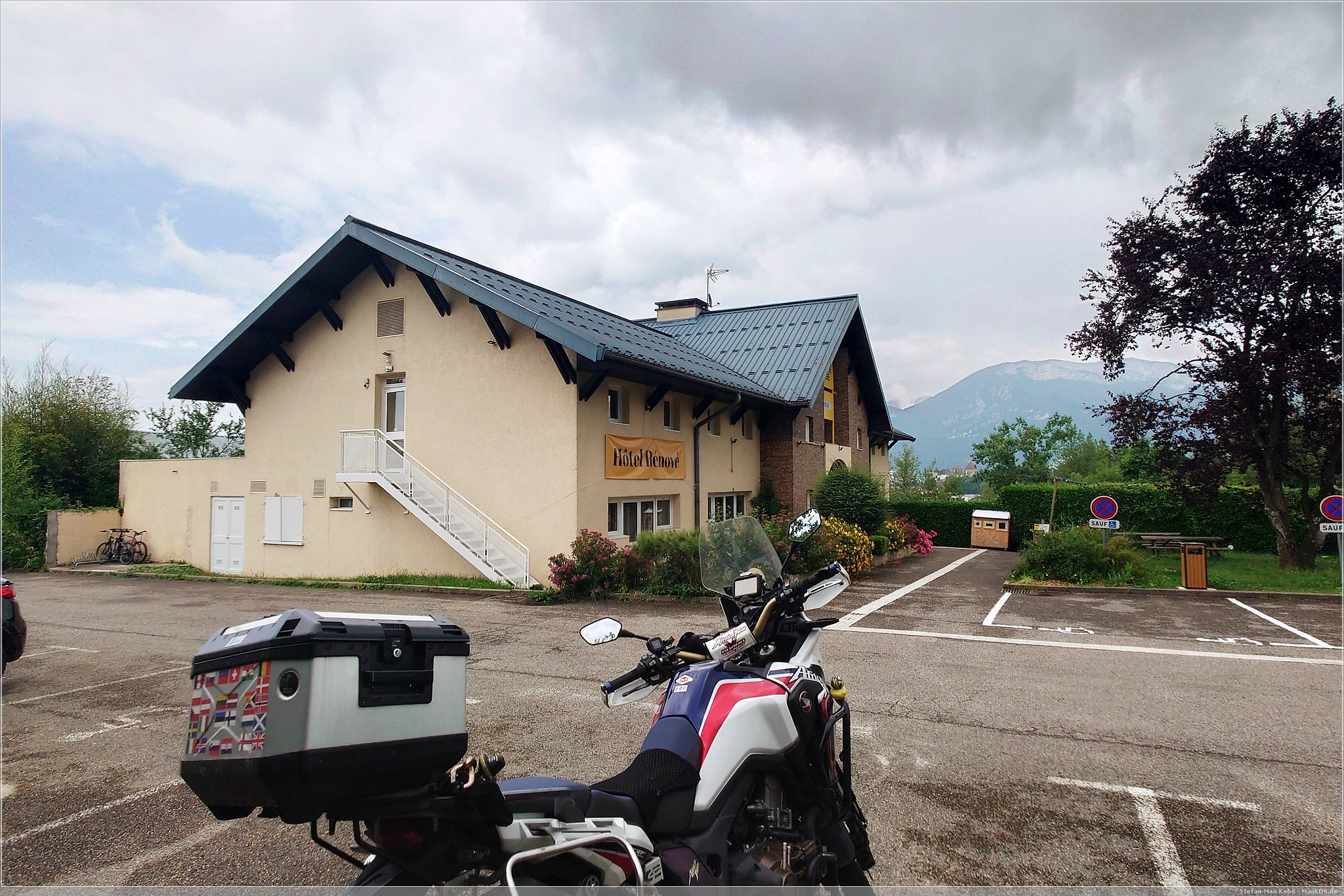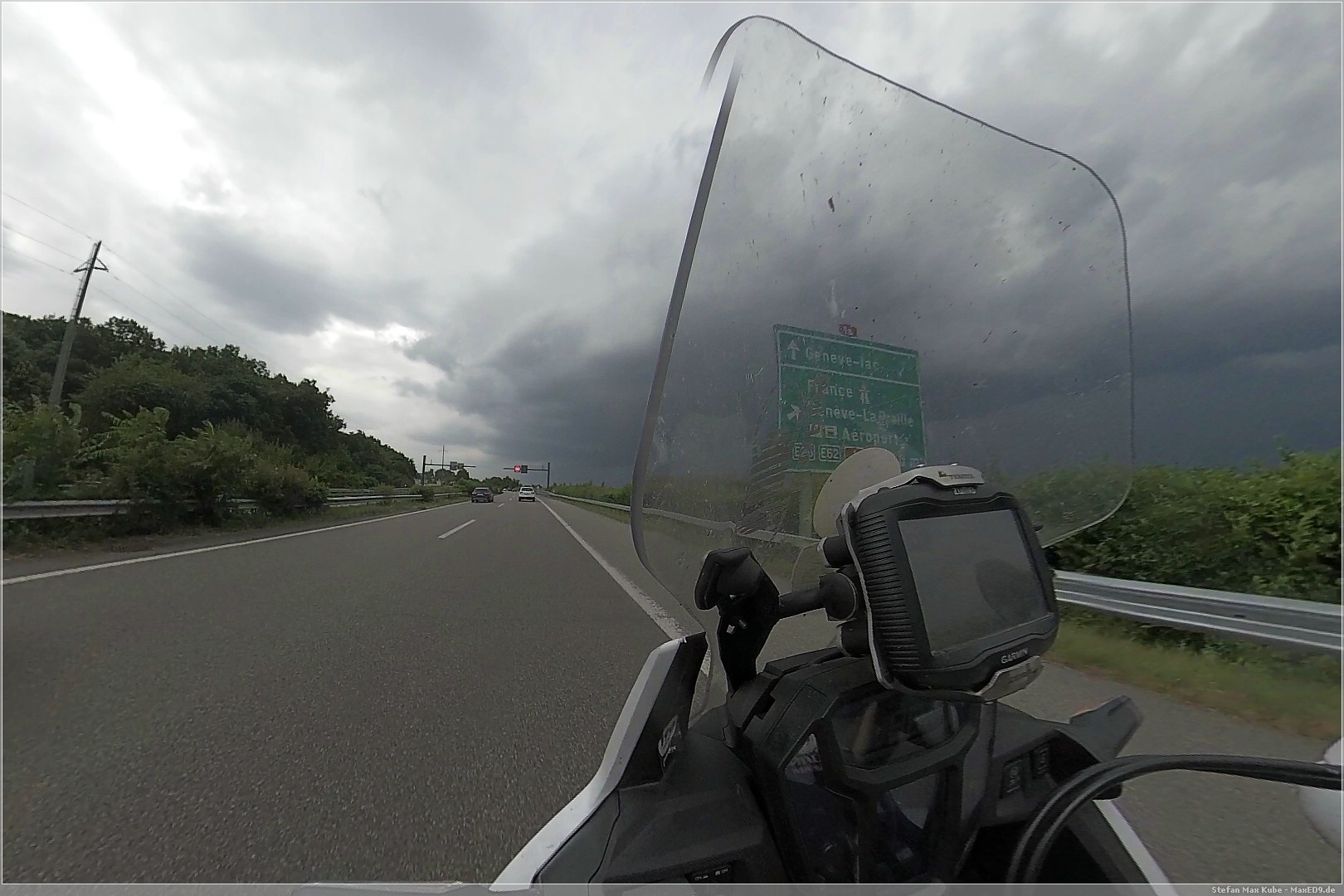 Kurz hinter Genf sah ich am Horizon schwarze Wolken, hoffte aber, dass ich eventuell drumherum komme. Kaum überquerte ich die Grenze zu Frankreich fing es heftig an zu regnen. Es kam in so kurzer Zeit zu viel Wasser herunter, so dass meine Kombi dem nicht standhielt und ich auch keine Möglichkeit mehr hatte, die Regenpelle überzuwerfen.