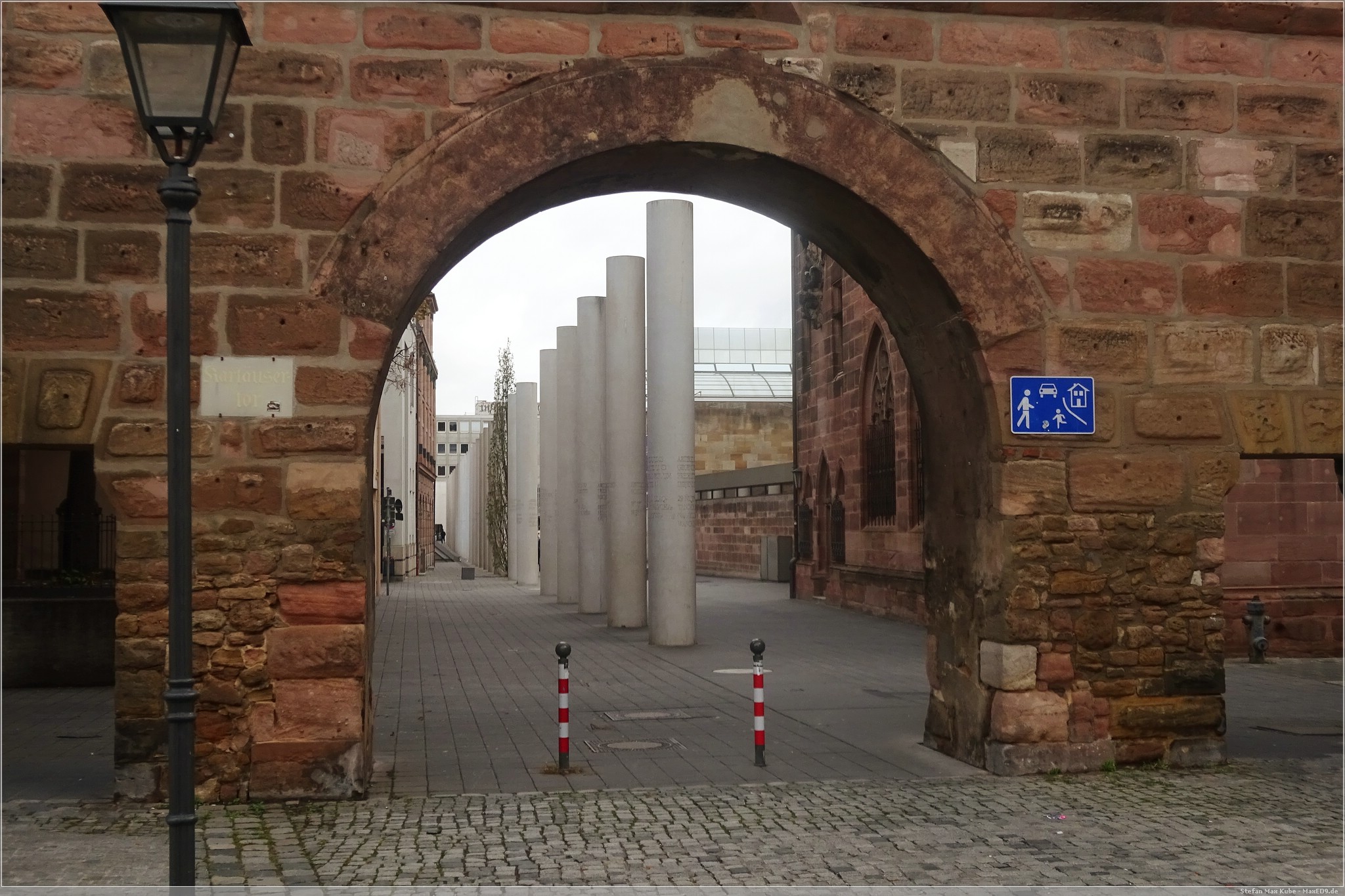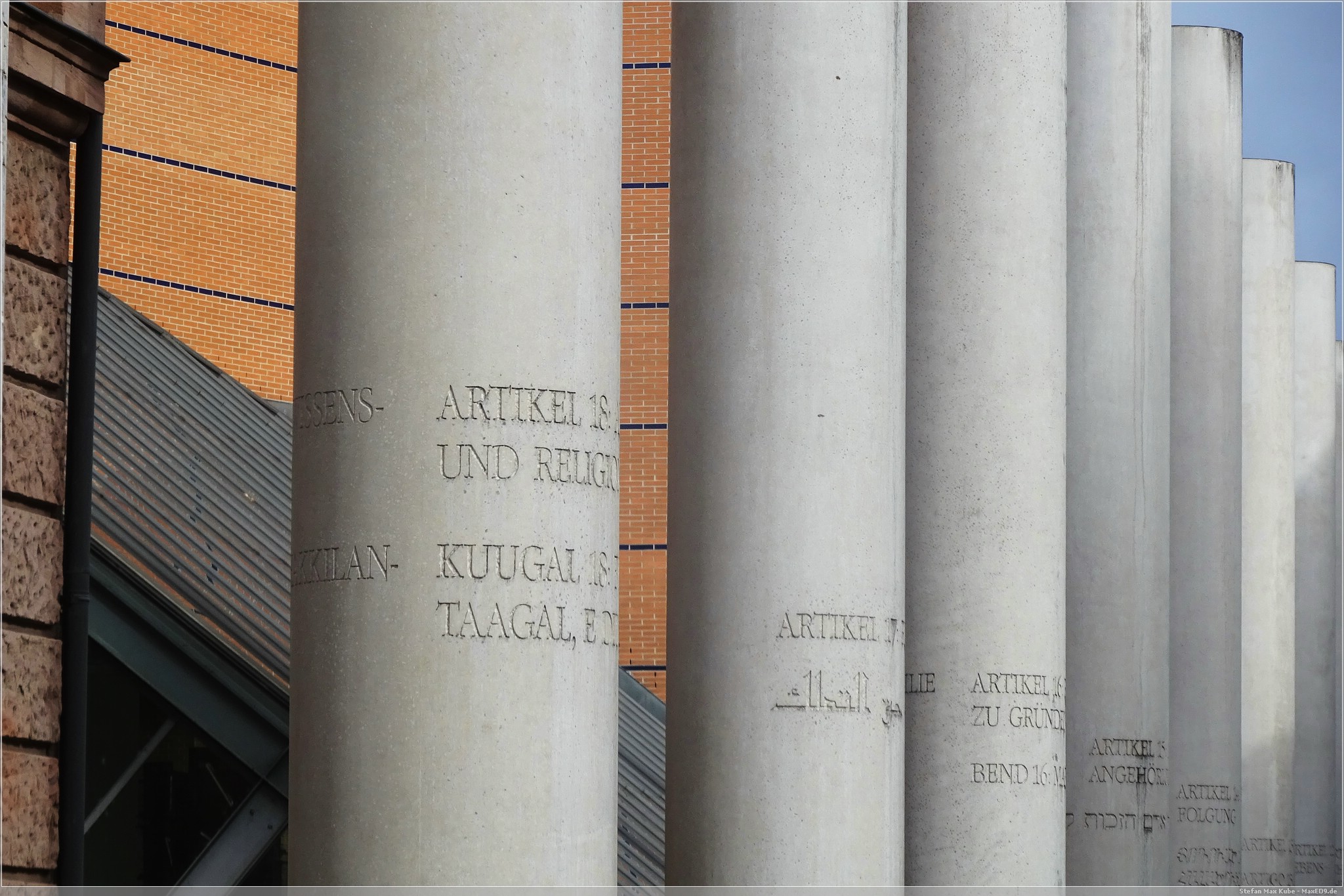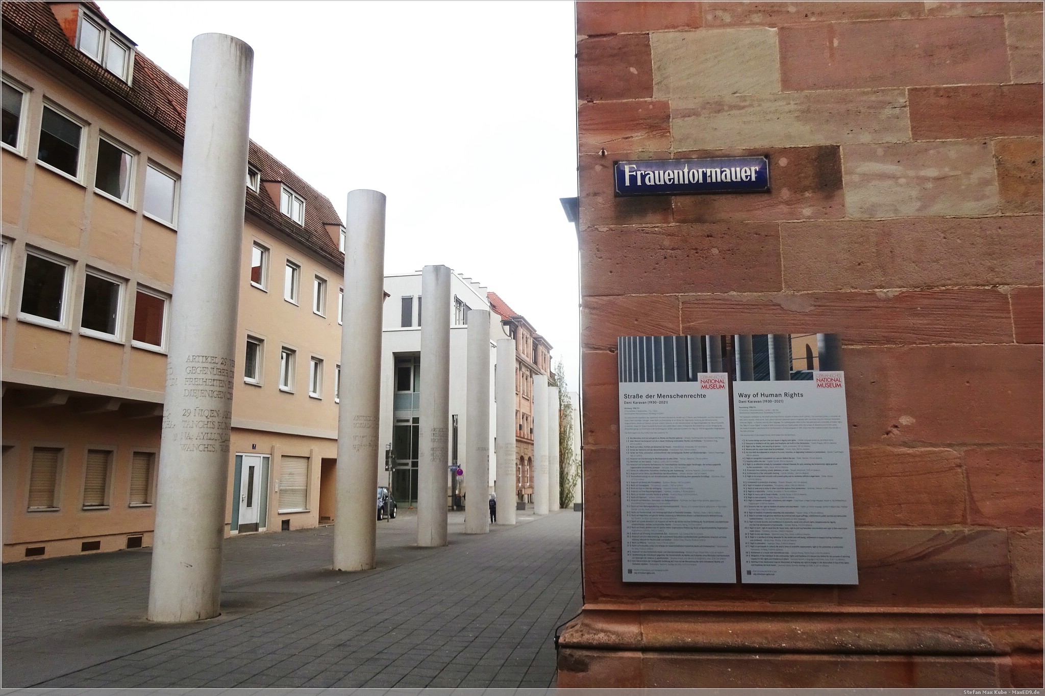 Nachdem Frühstück fuhren wir mit der U-Bahn eine Station bis zur Station Opernhaus, überquerten den Frauentorgraben und befanden uns innerhalb der Stadtmauer direkt in der Straße der Menschenrechte. Diese 1993 eingeweihte imposante Kunstwerk besteht aus 27 Säulen mit 8 m Höhe, 2 Bodenplatten und einem Eingangstor. Darauf finden sich Auszüge aus den 30 Artikeln der Erklärung der Menschenrechte, jeweils in Deutsch und einer anderen Sprache.
